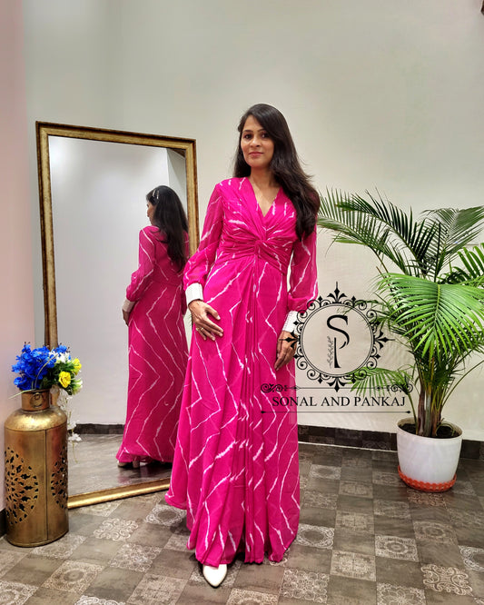 Rani Pink Leheriya Floor Length Knot Dress - FL01615