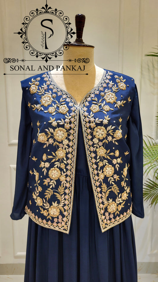 Zardozi Hand Embroidered Jacket & Layered Floor Length Gown - SA01571 (Midnight Blue)