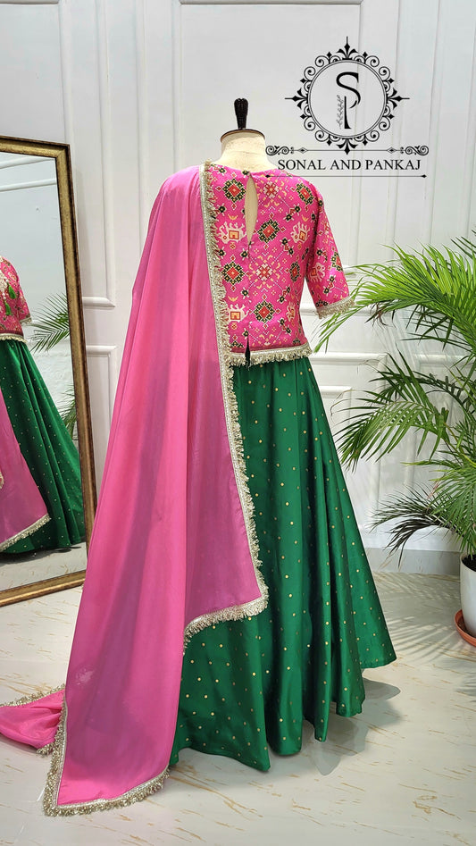 Designer Long Patola Blouse With Beautiful Duppatta & Bottle Green Lehenga - LH01527