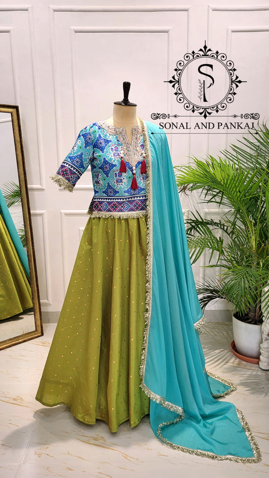 Designer Long Patola Blouse With Beautiful Duppatta & Olive Green Lehenga - LH01526