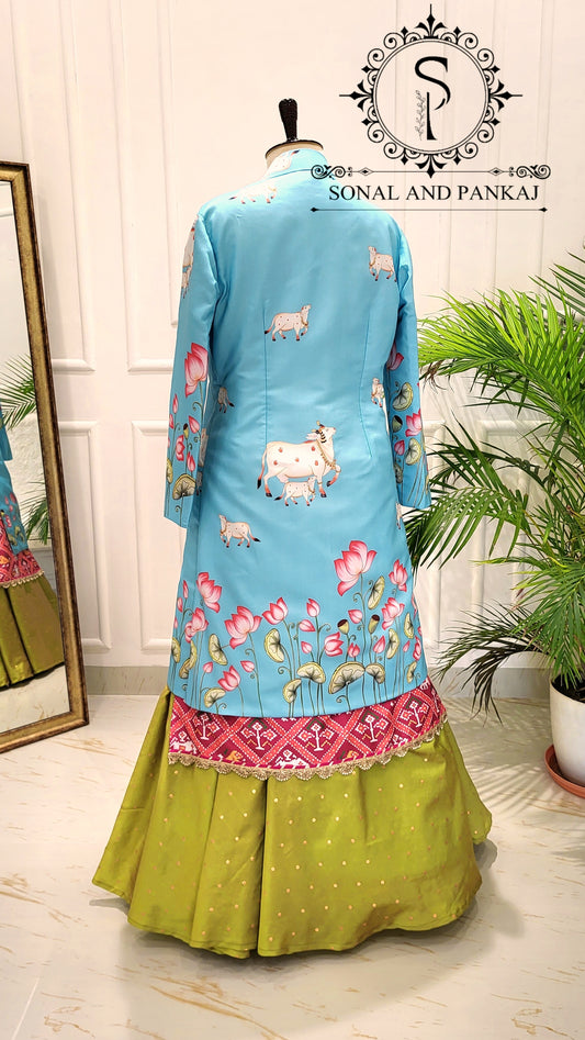 Vibrant Blue Long Pichwai Print Jacket With Patola Kurti & Lehenga - LH01536