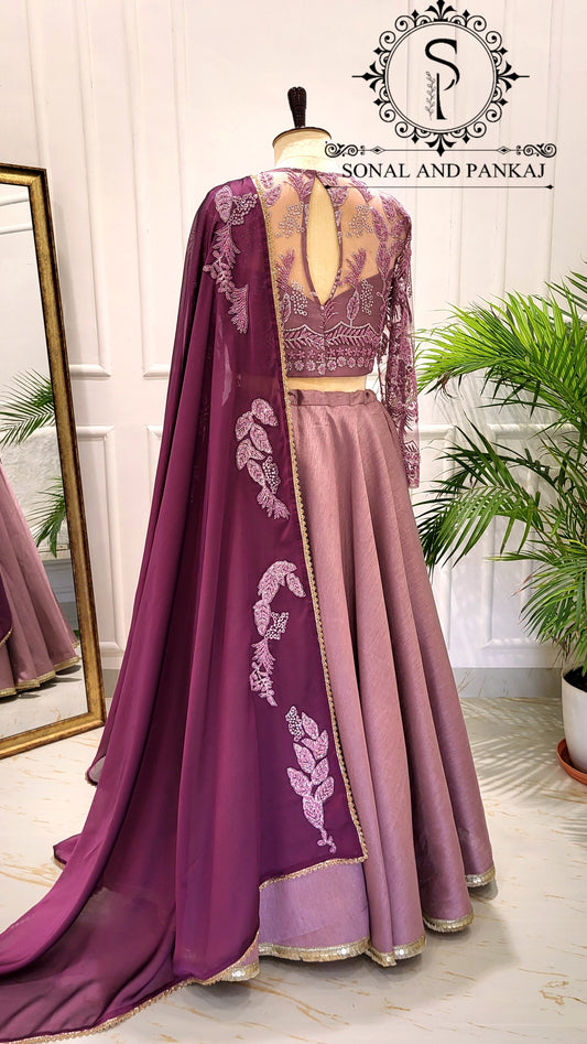 Mauve Embroidered Blouse With Beautiful Wine Duppatta & Lehenga - LH01540