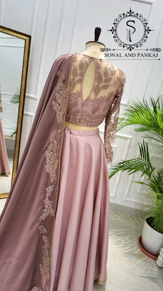 Dusty Mauve Duppatta With Dusty Blush Pink Embroidered Blouse & Lehenga - LH01565