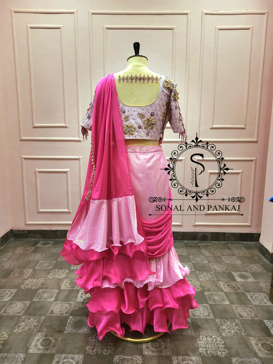 3d Peacock Embroidery Jacket Style Blouse With Ready To Wear Ruffle Saree - SA01378