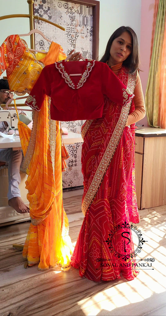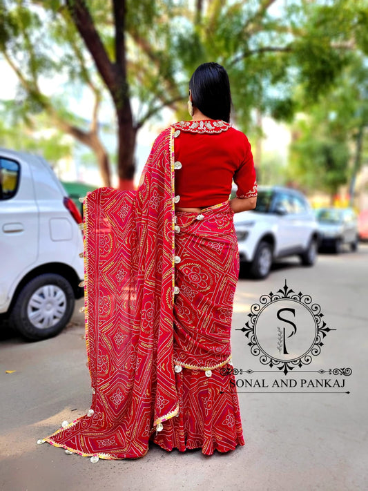 Ready To Wear Red Bandhani Print Saree With Hand Embroidered Blouse - SA00806