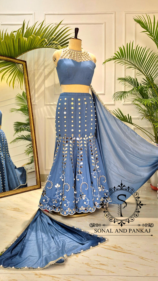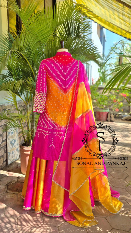 Blouse Bandhej faite à la main avec organza Duppatta et Chandri Jaal Lehenga - LH01202