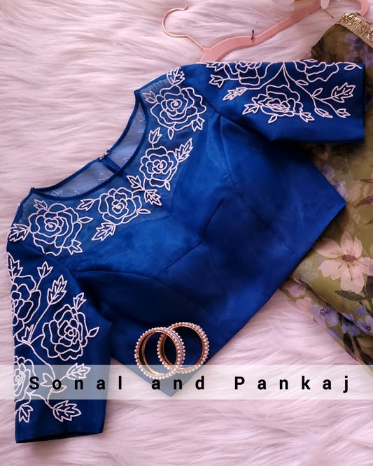 Blouse brodée à la main Bandhani Gotta Patti bleu marine - BL01045