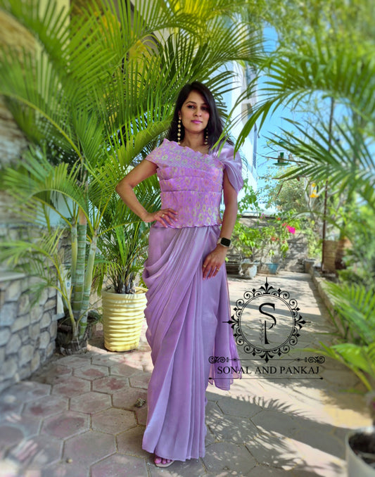 Plum Voilet Pleated Blouse With Rose Quartz Ready To Drape Saree - SA01621