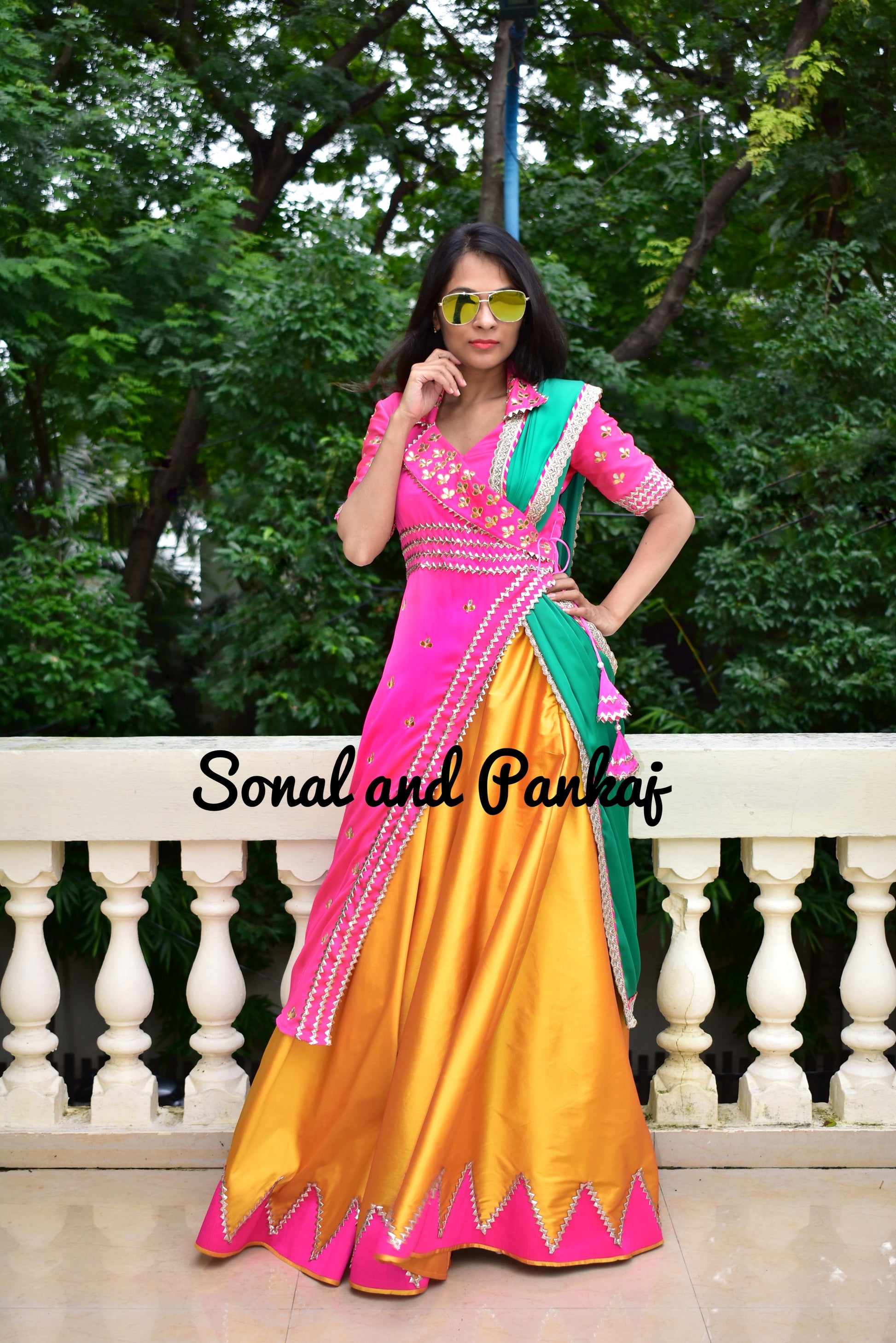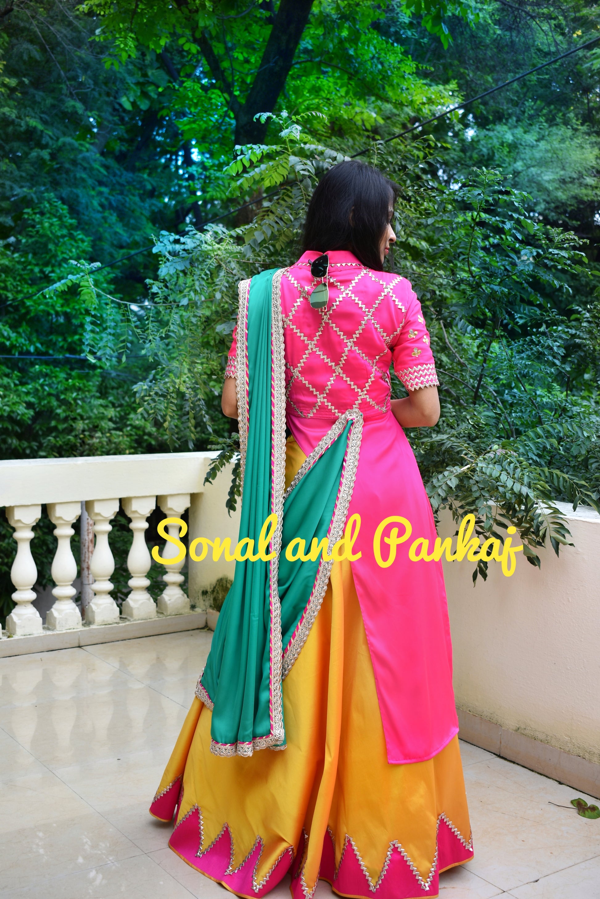 Cette tenue est un mélange de couleurs traditionnelles indiennes Indian Silhouette x Indian Kaarigari x rose vif, jaune et jade.