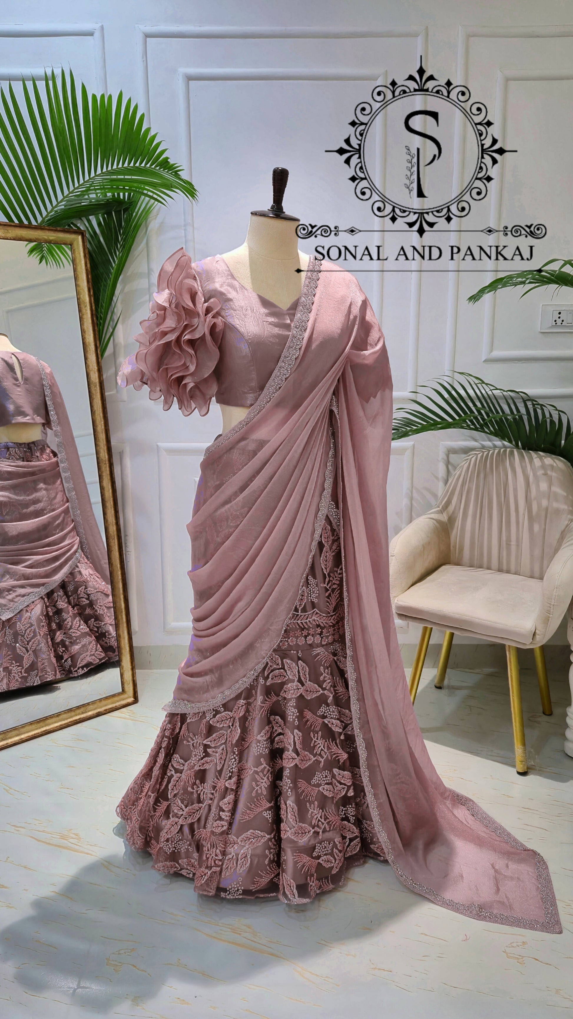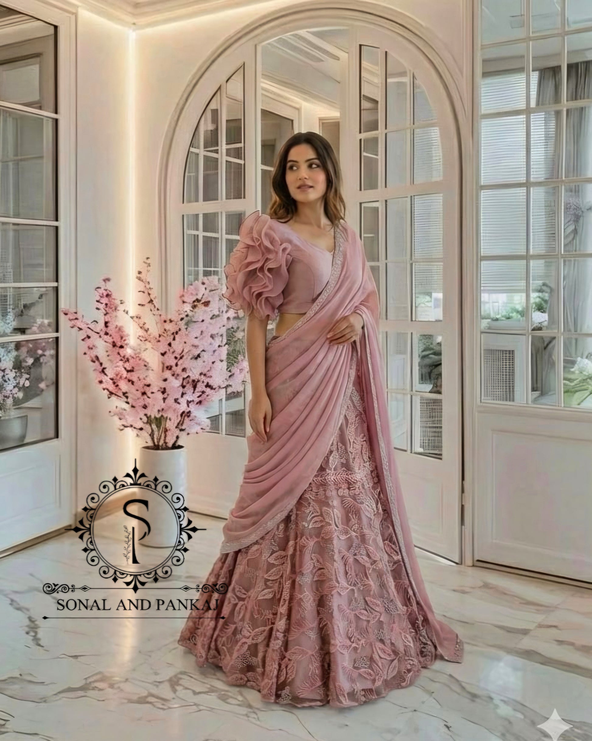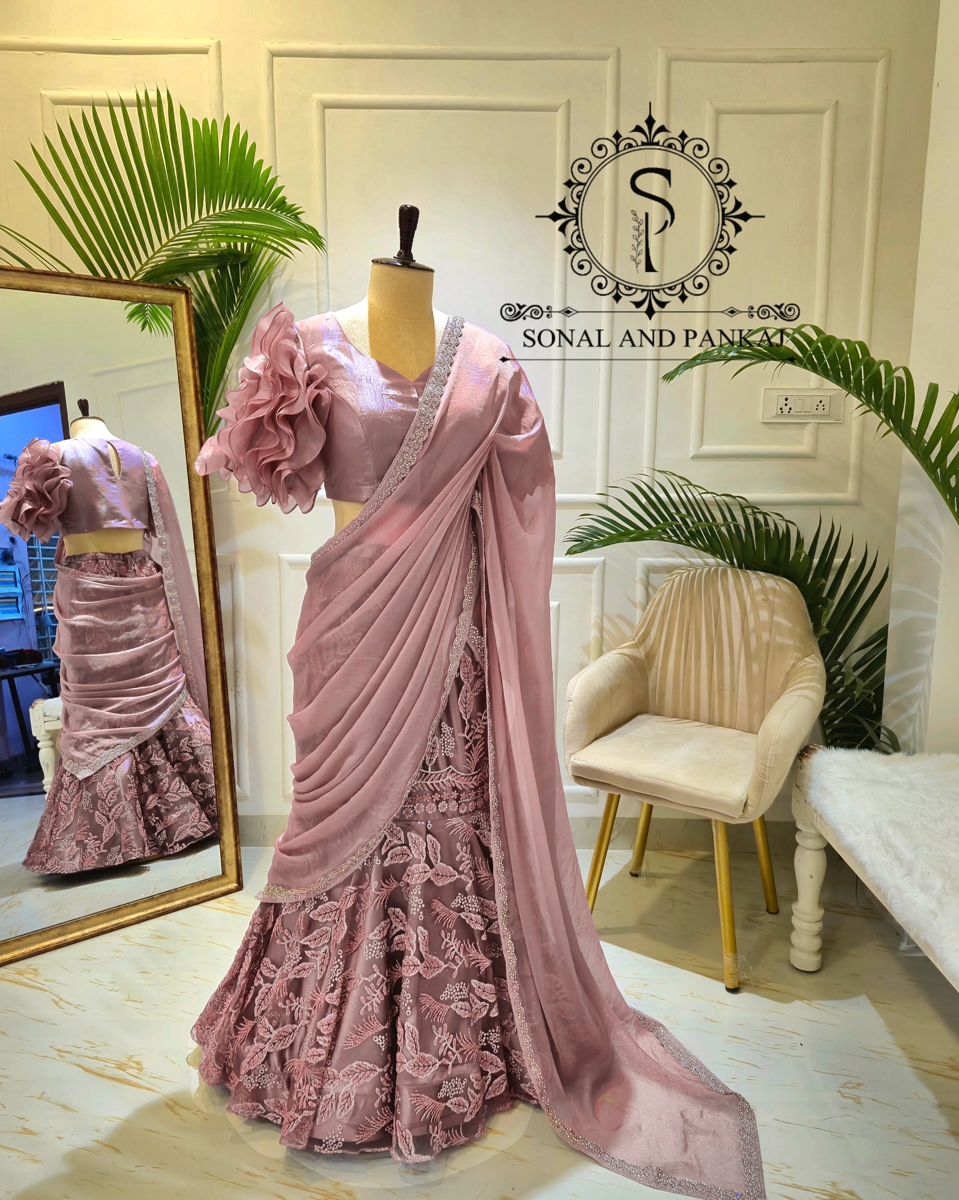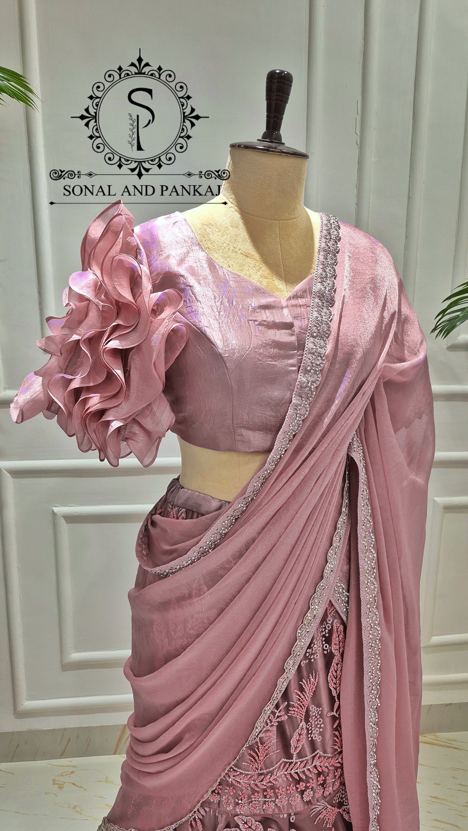 Blouse de style veste brodée à la main Paon 3D avec sari à volants superposés prêt-à-porter.