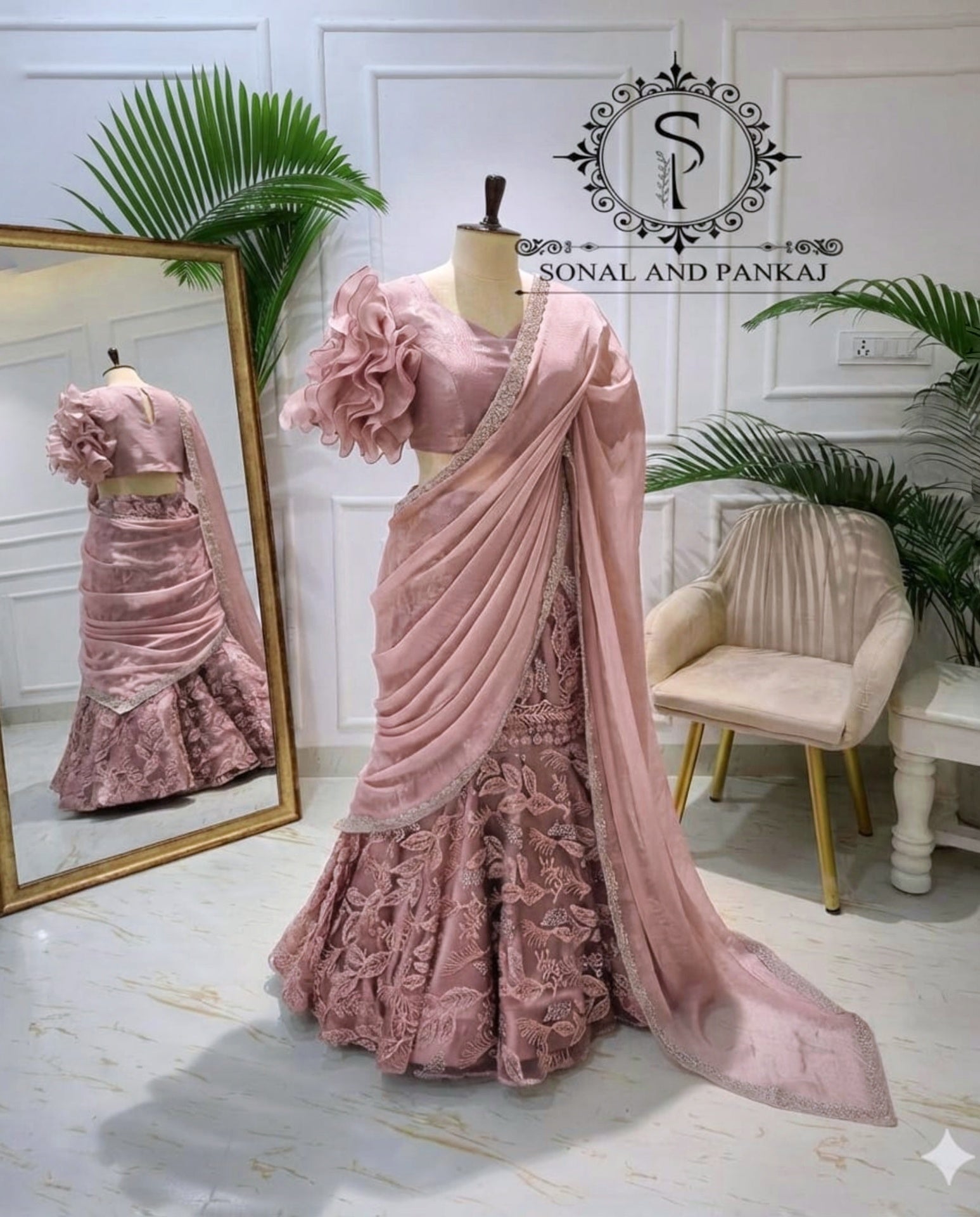 Chemisier de style veste brodée de paon 3D avec sari à volants prêt à porter - SA00727