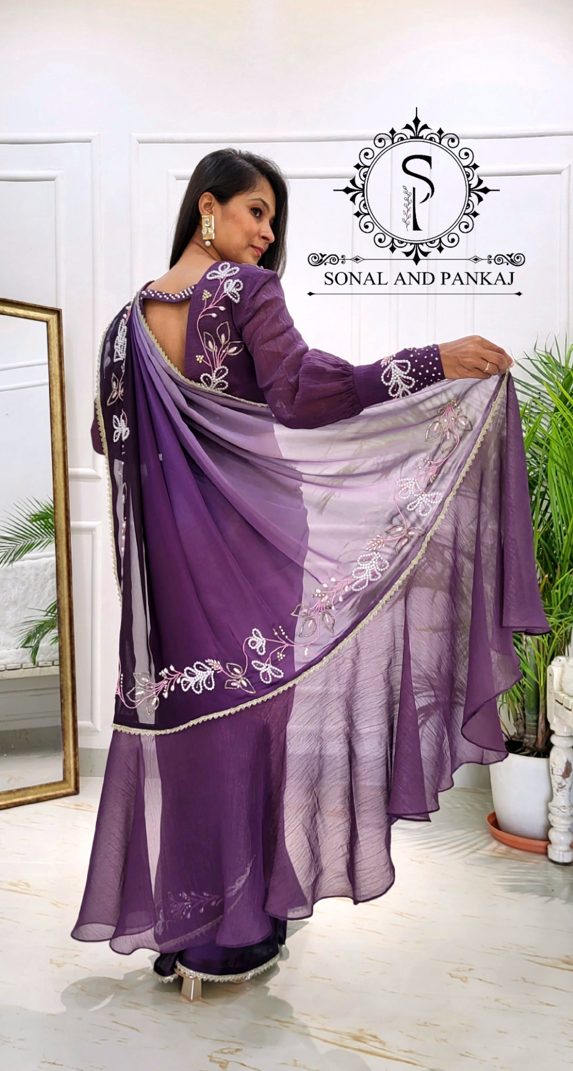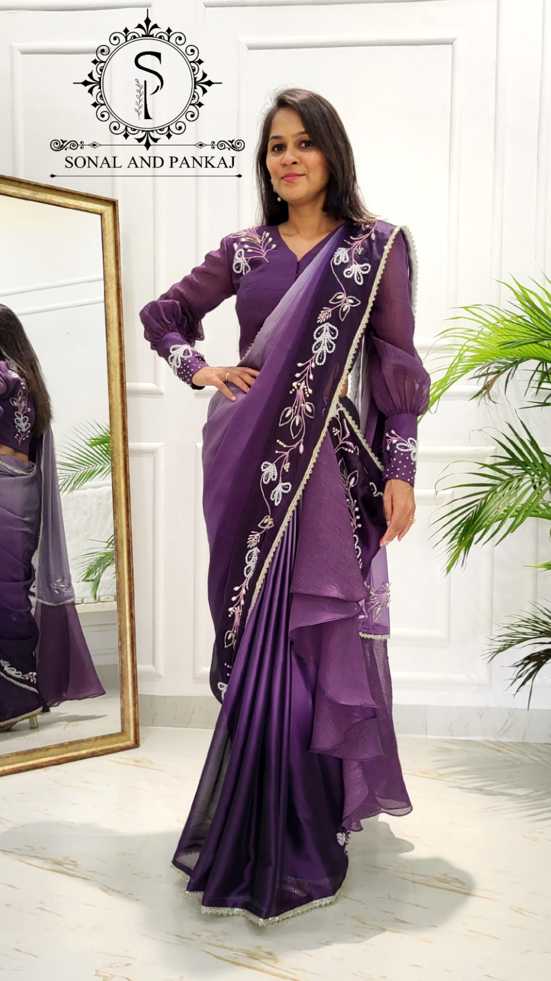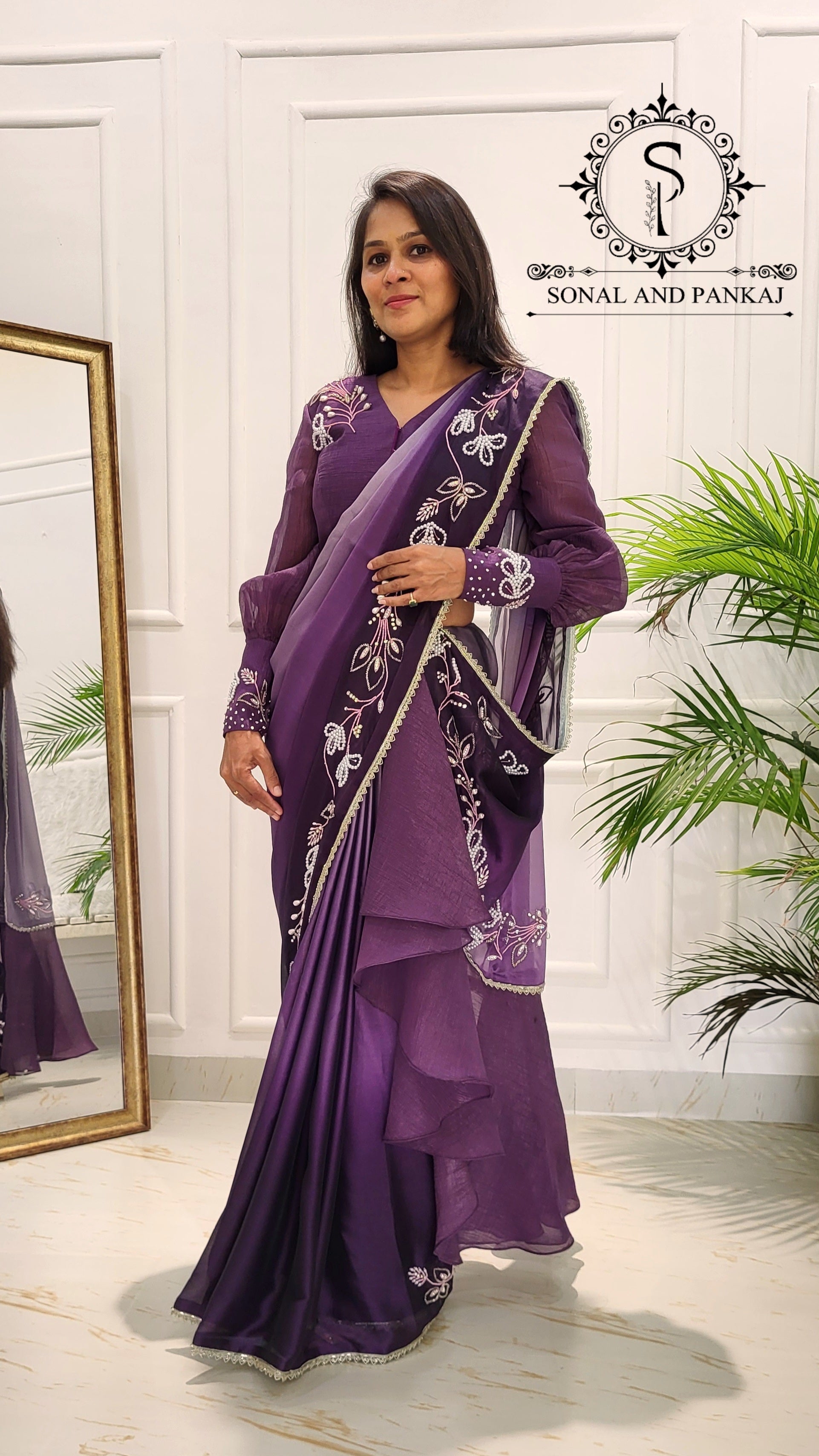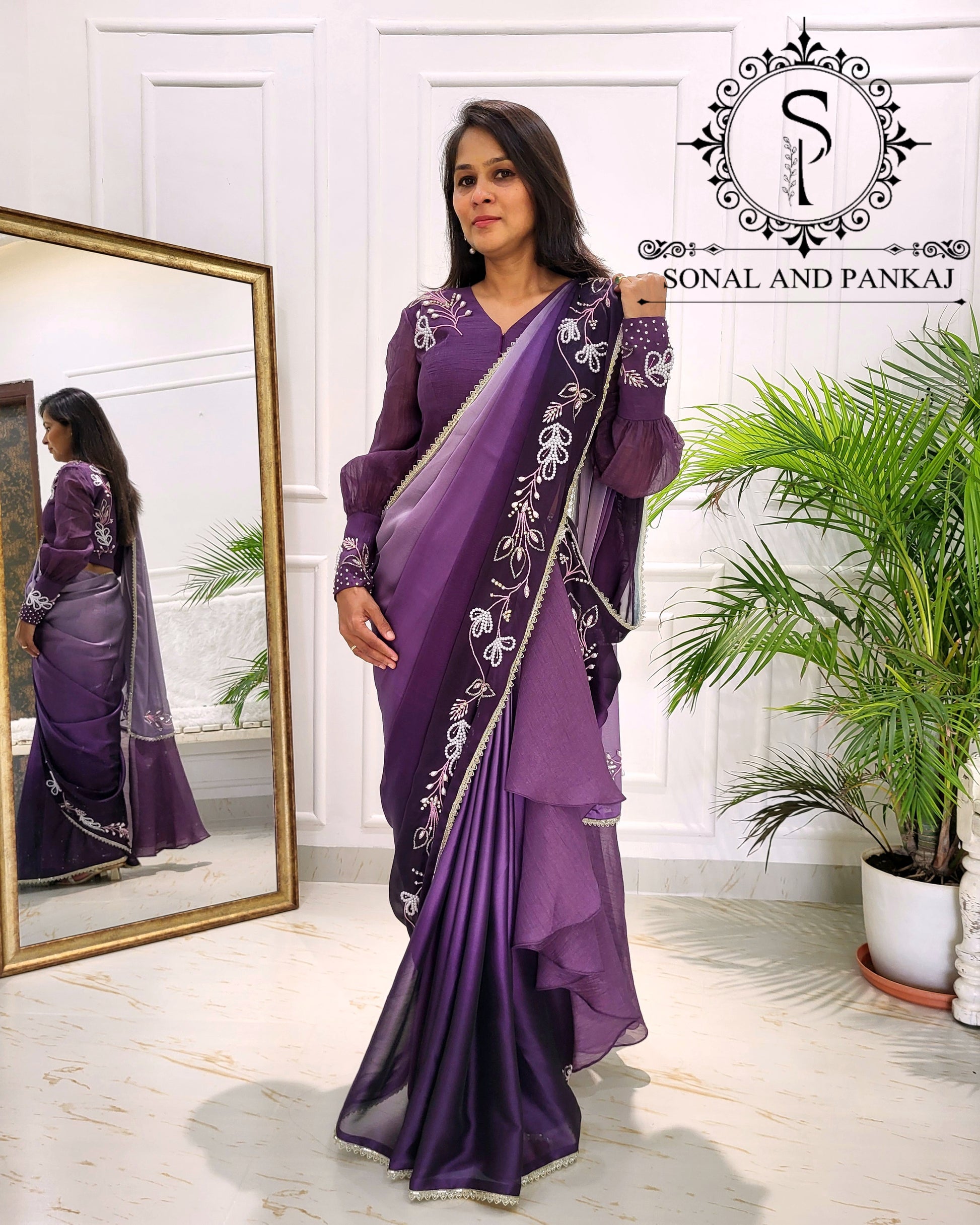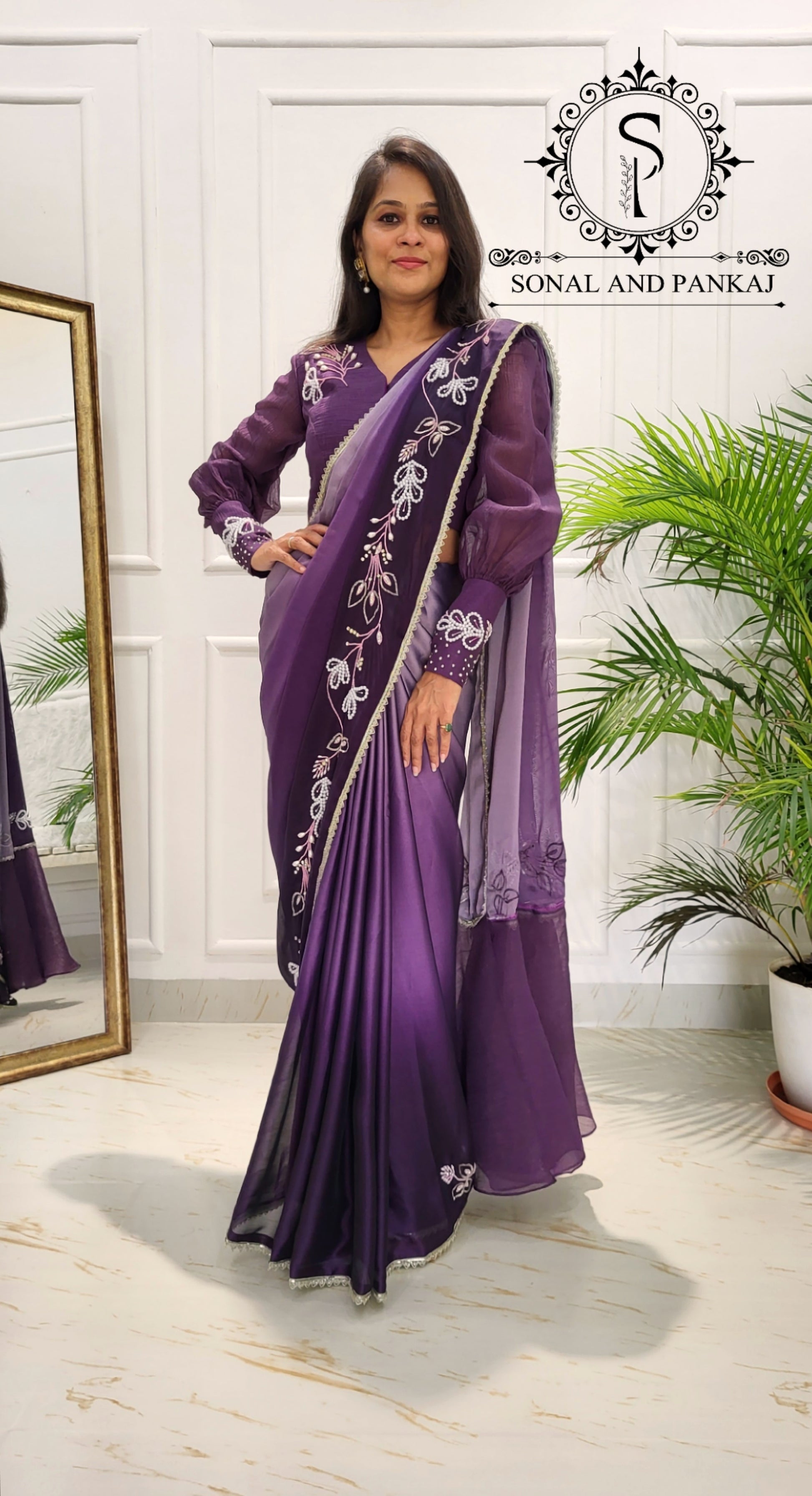 Designer Deep Purple Hand Embroidered Blouse & Ombre Saree - SA01523