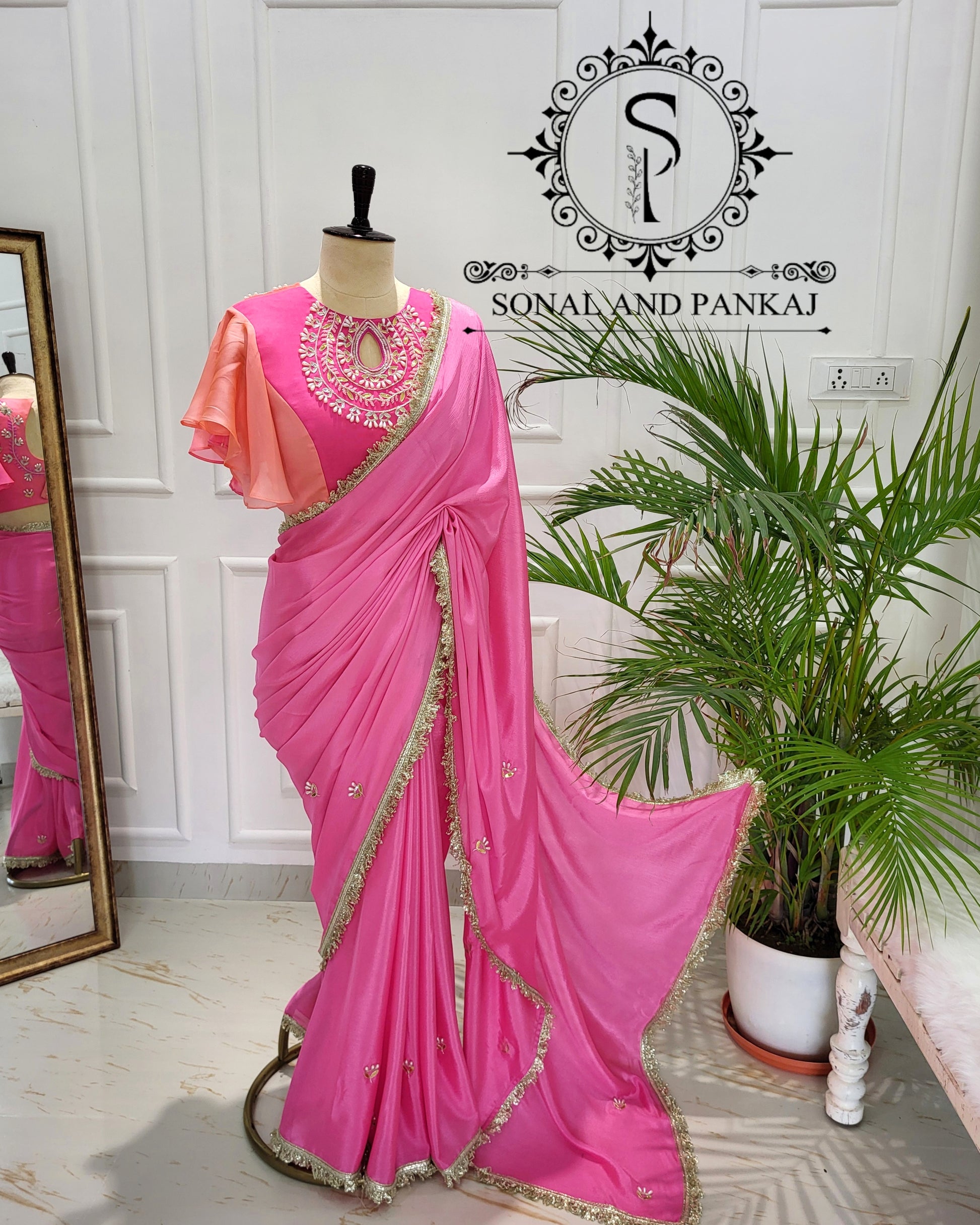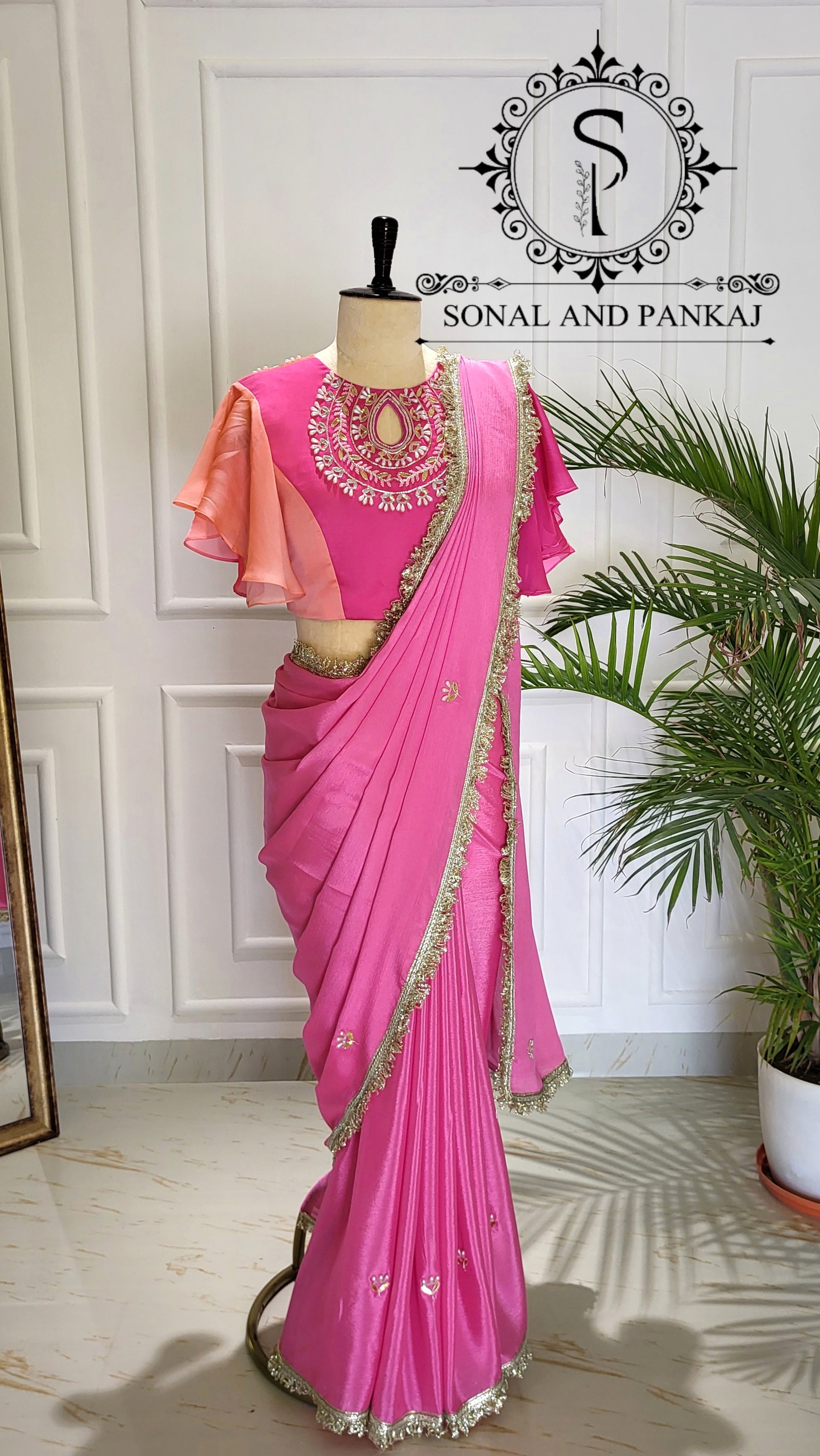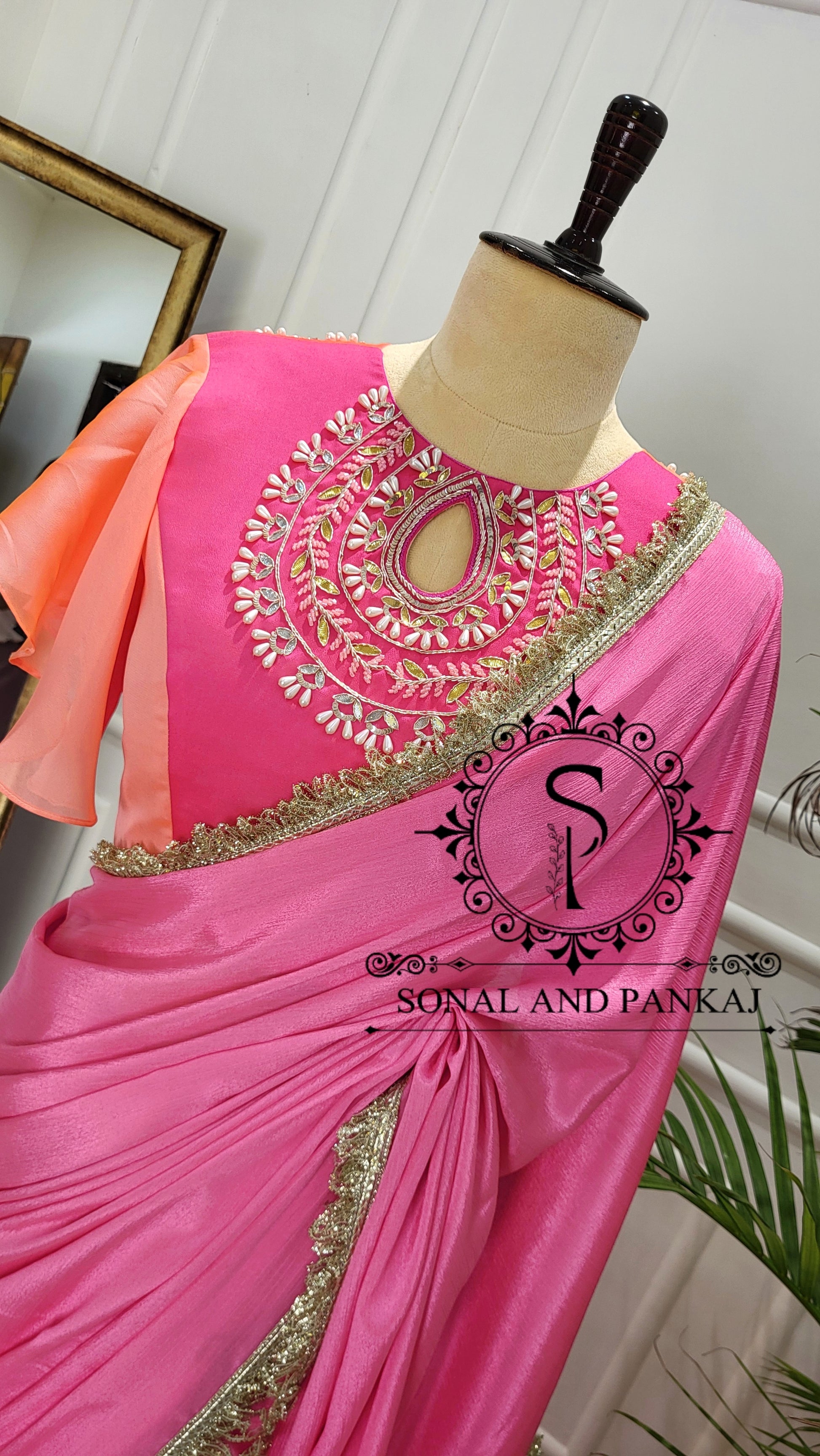 Designer Hand Embroidered Blouse With Pink Saree - SA01506