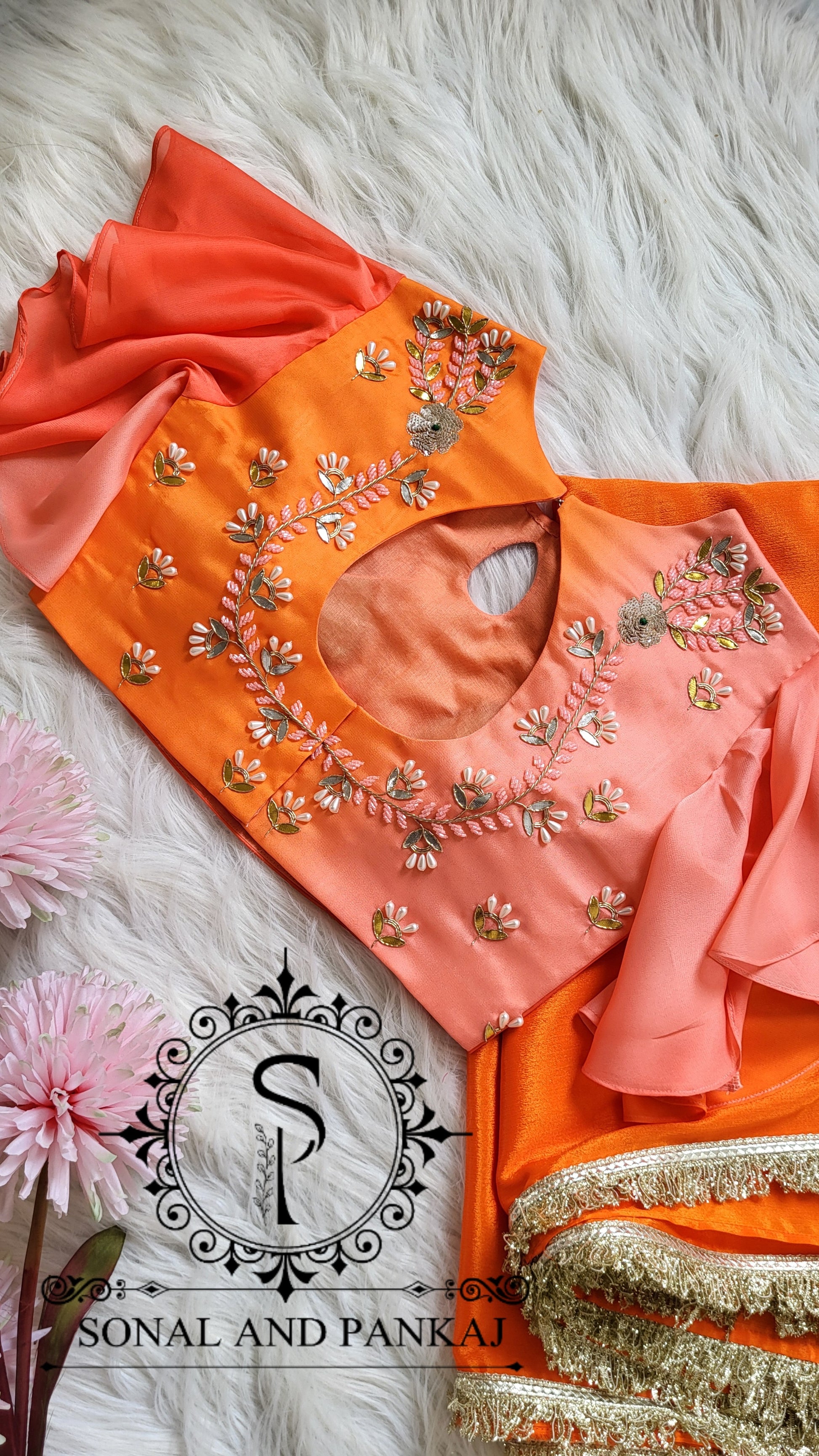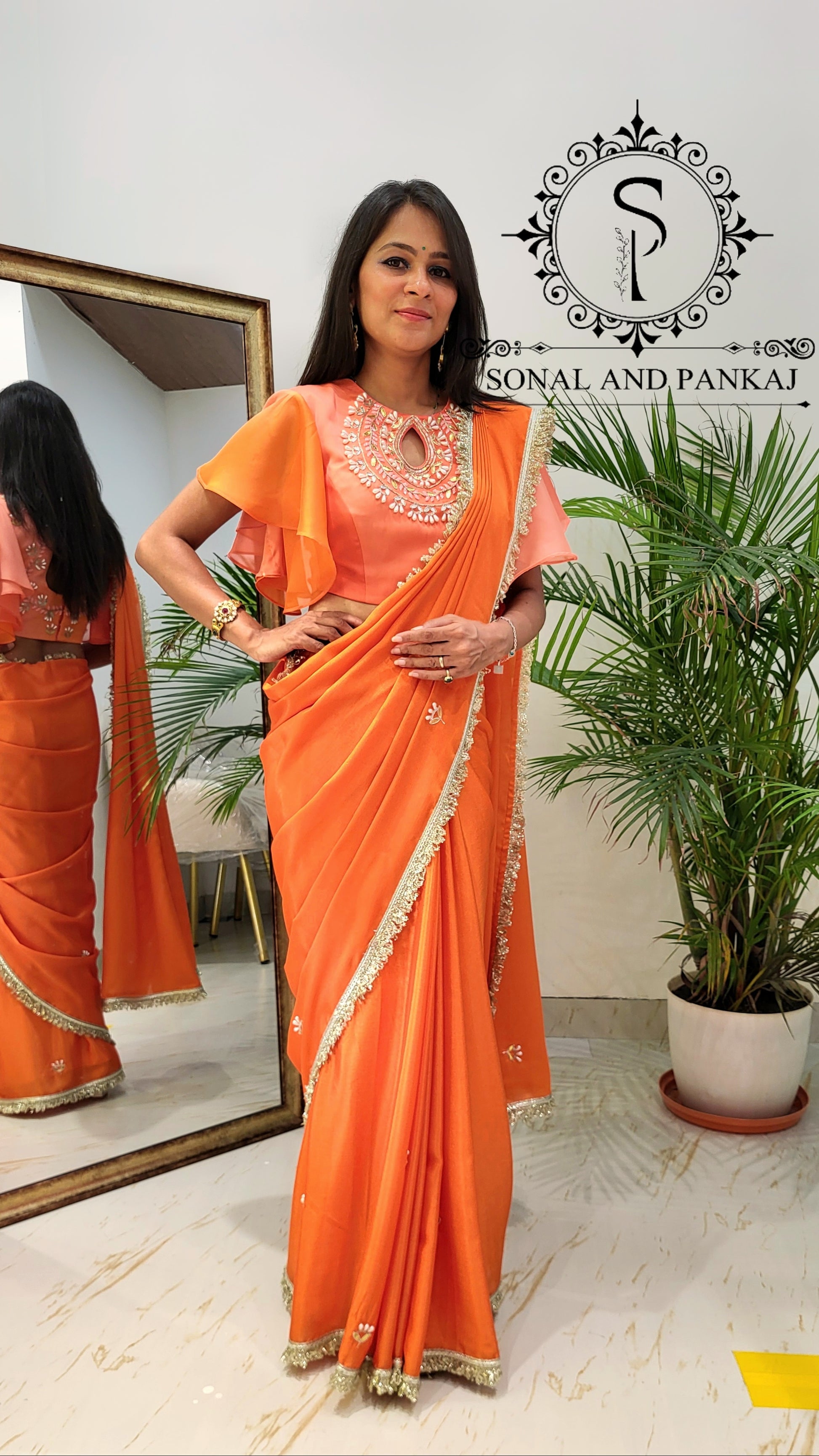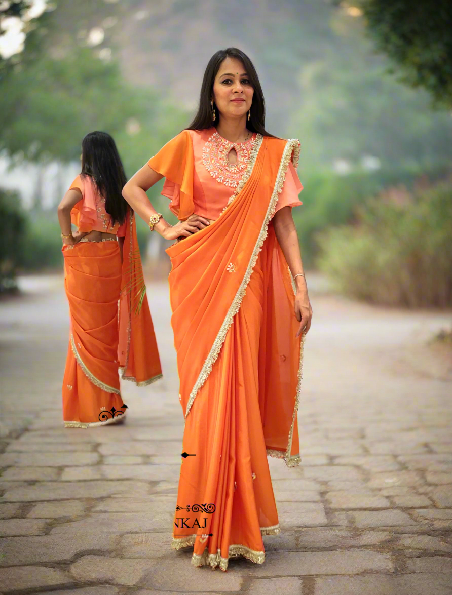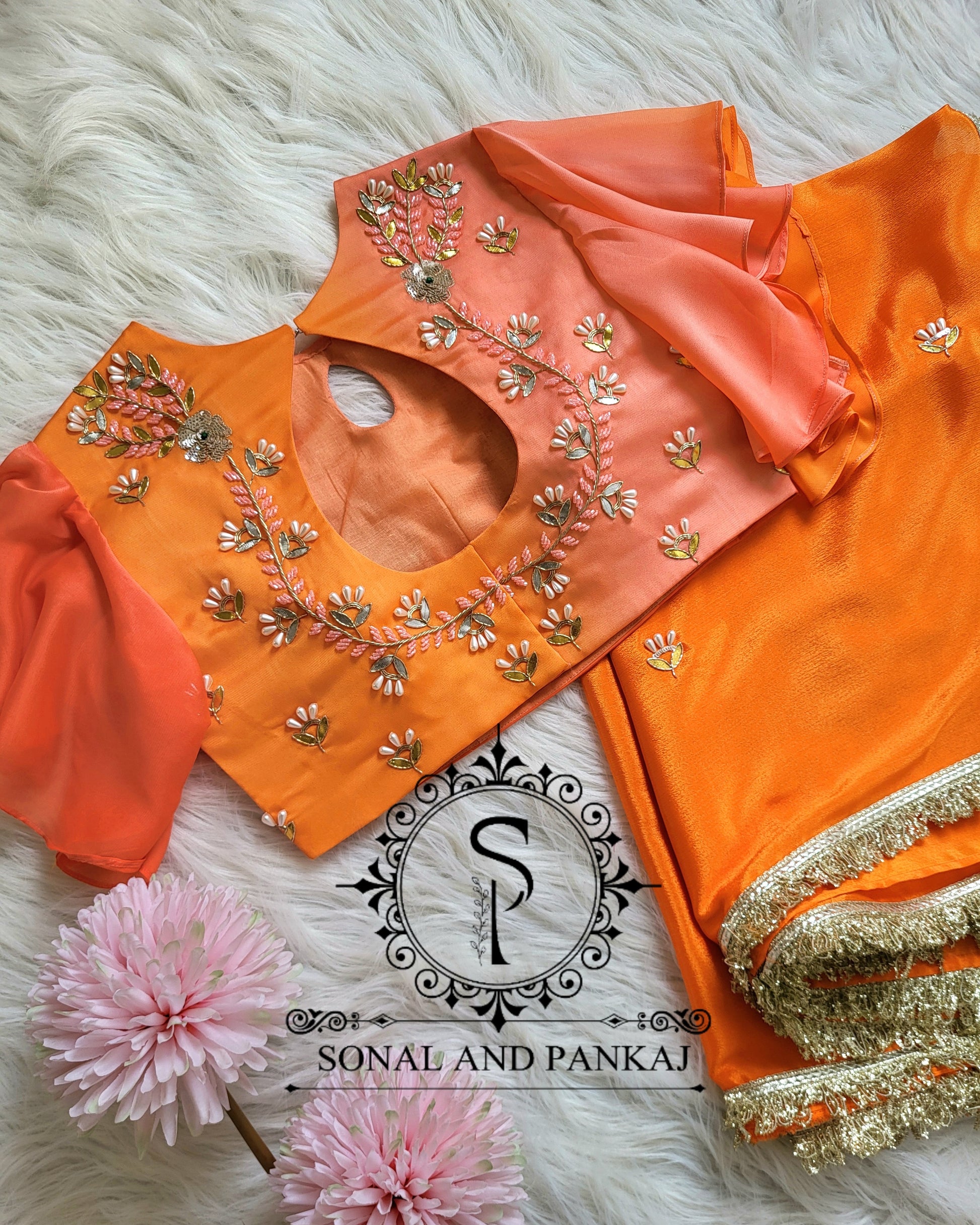 Designer Hand Embroidered Blouse With Tangy Orange Saree.