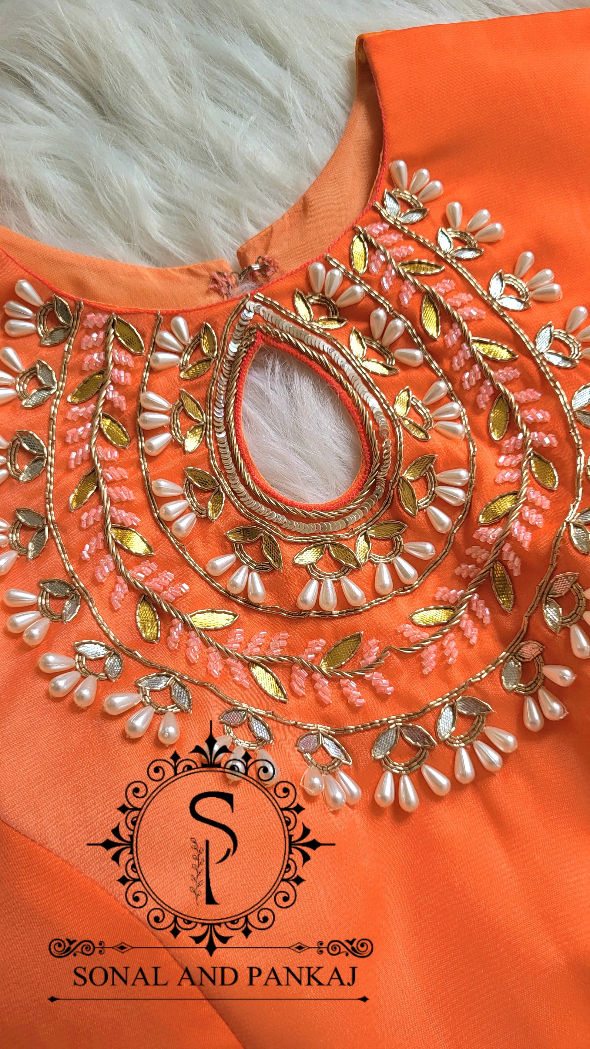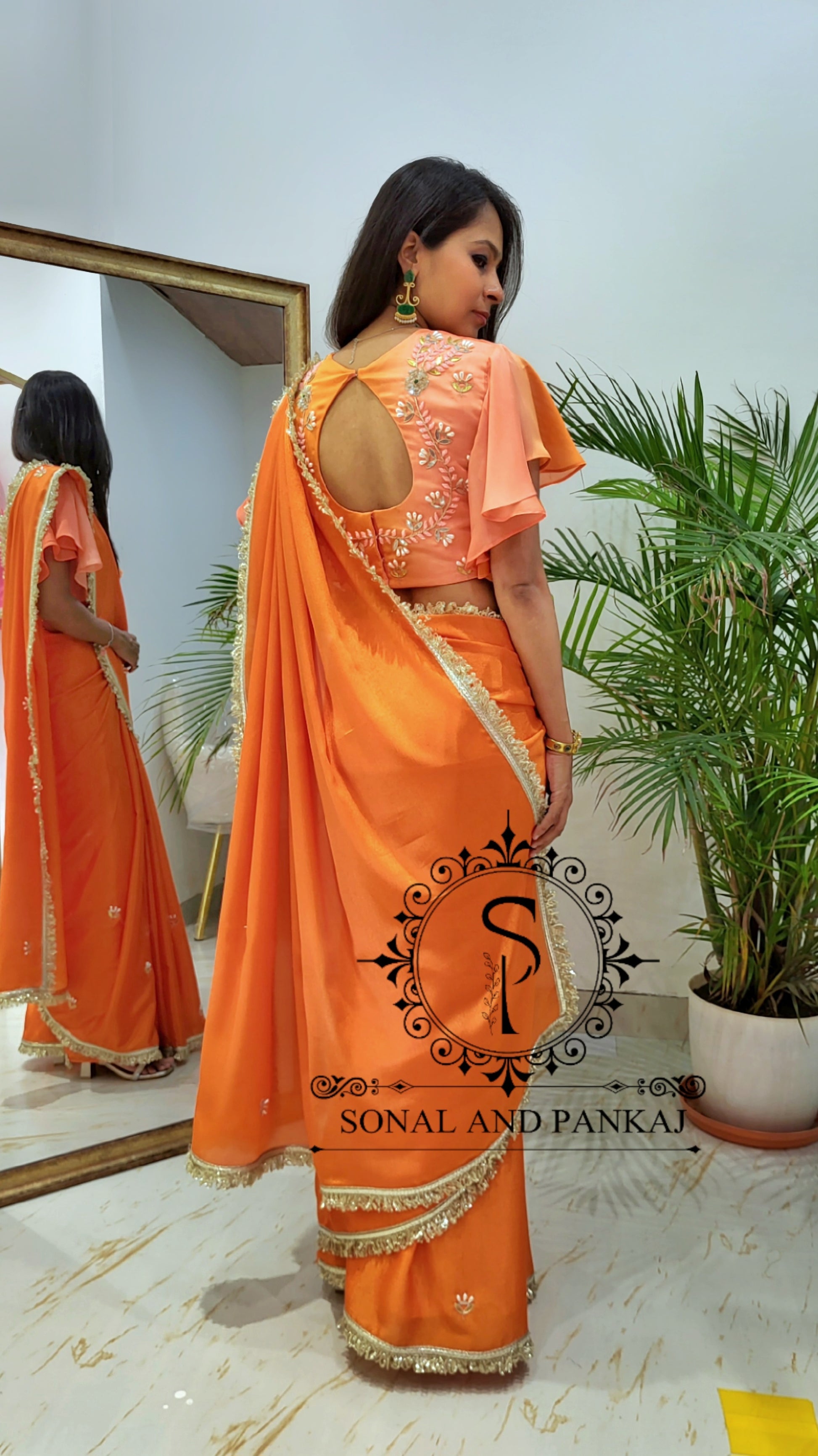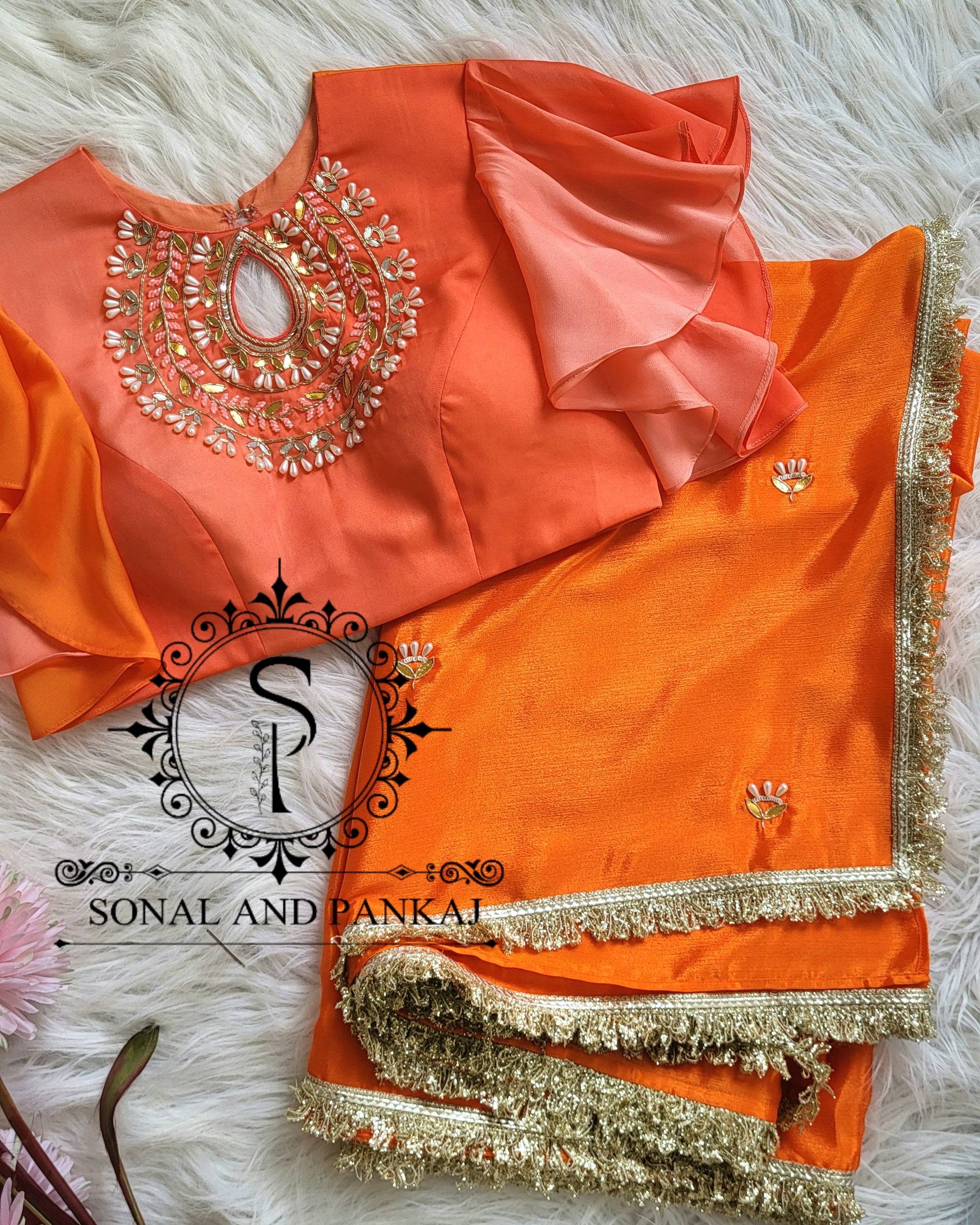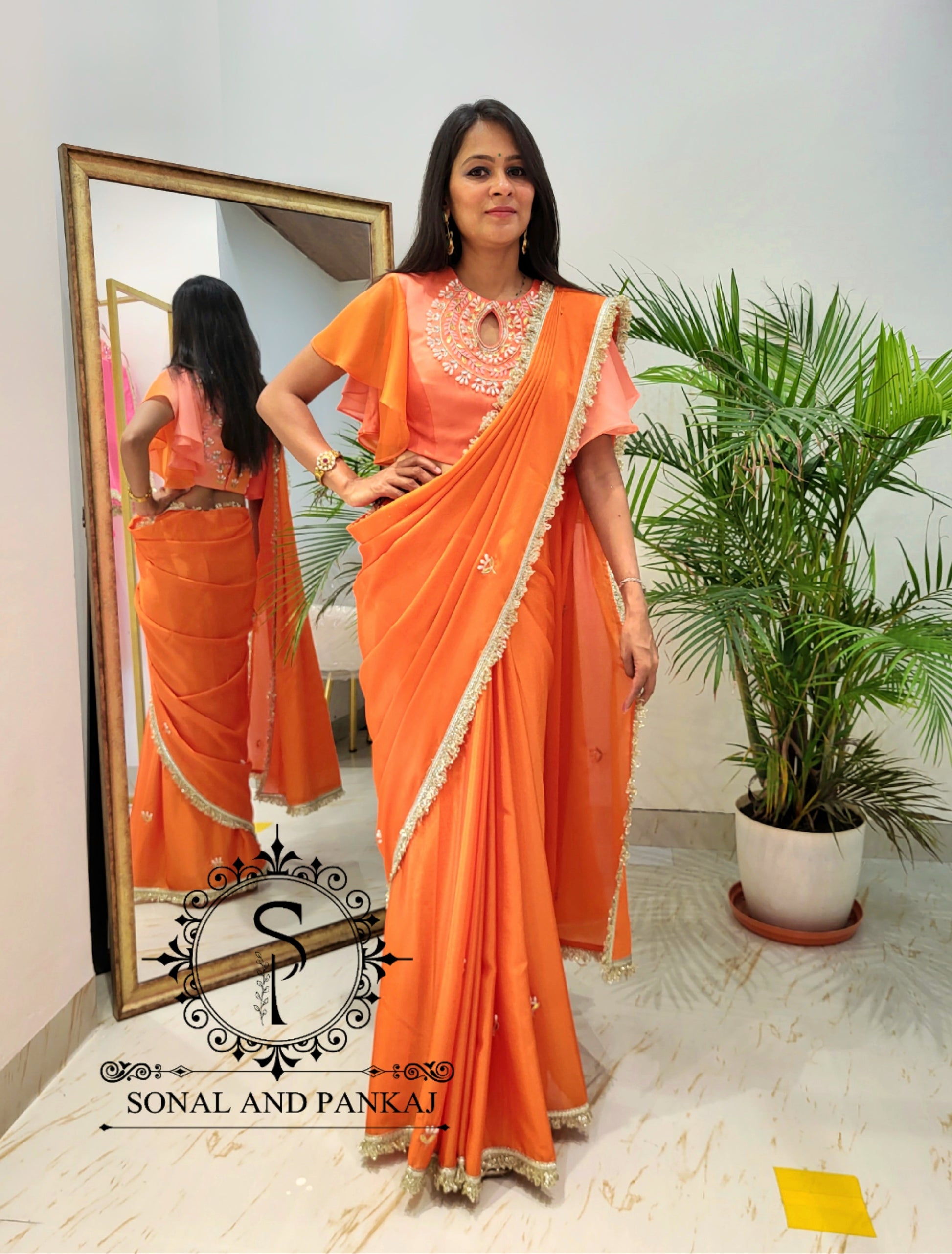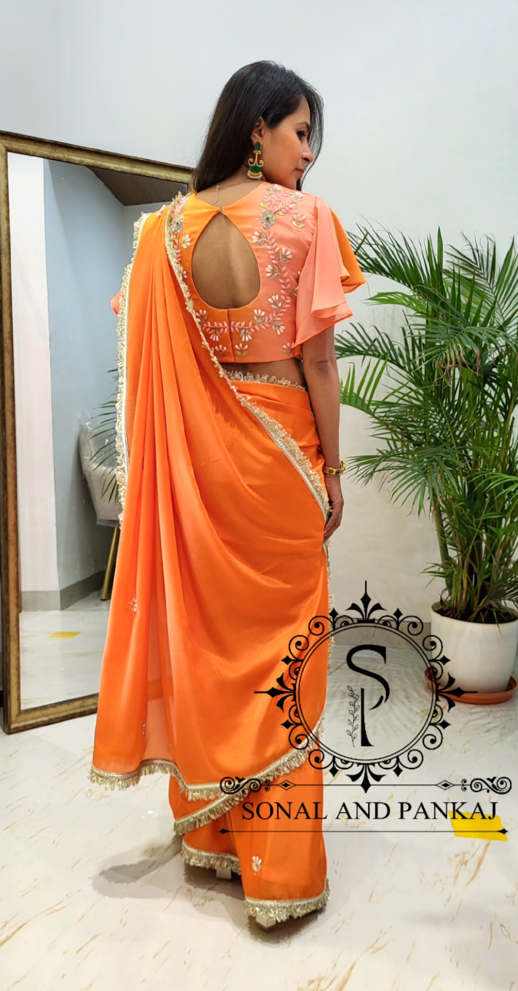 Designer Hand Embroidered Blouse With Tangy Orange Saree.
