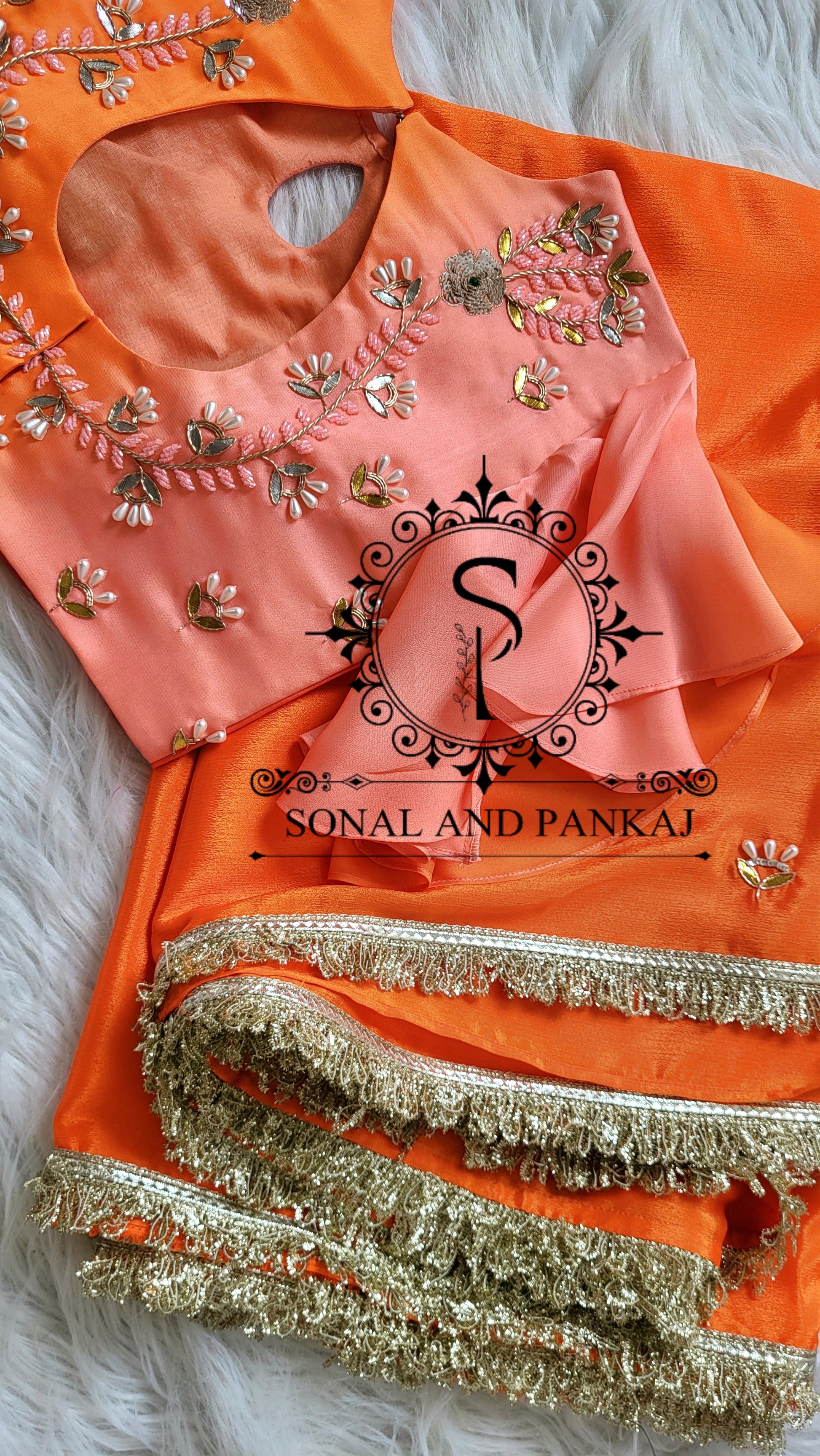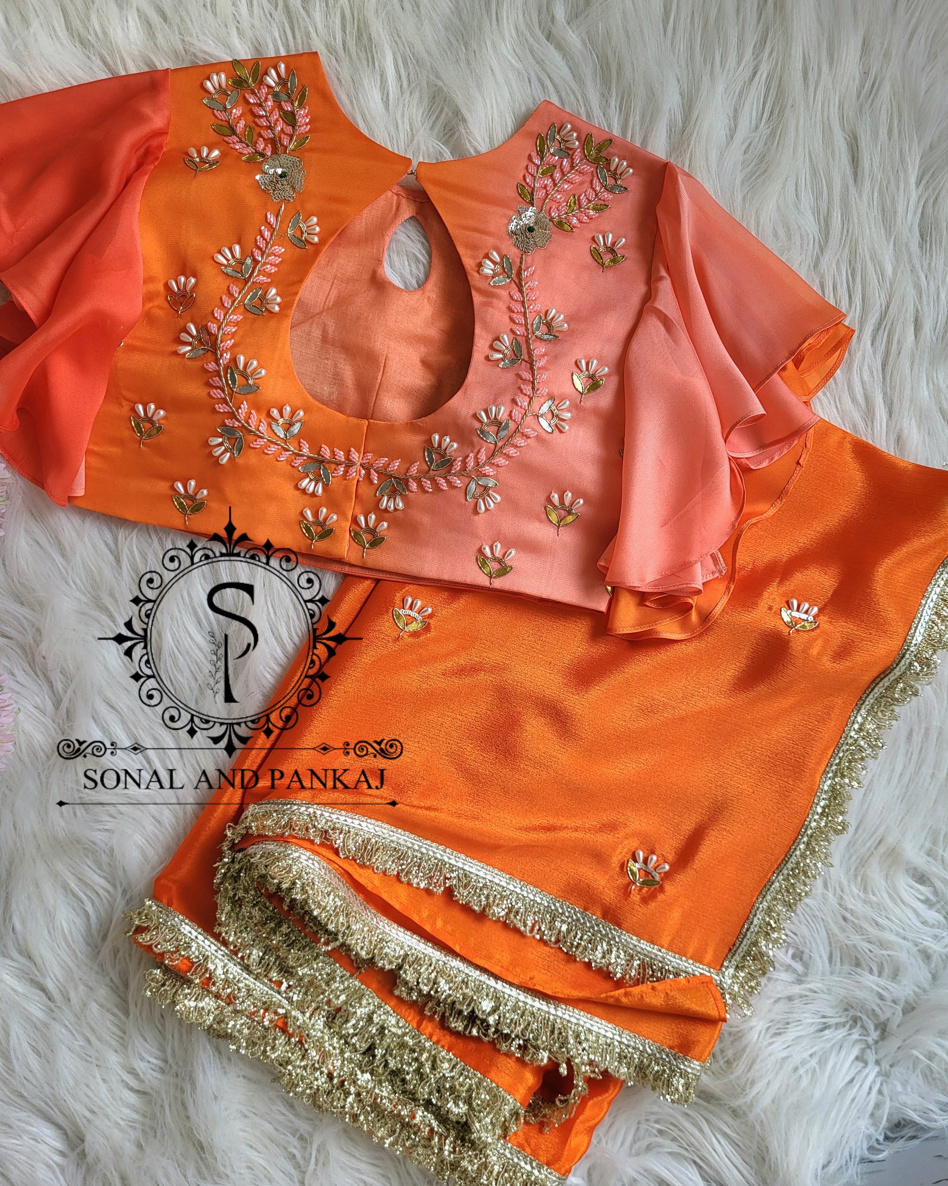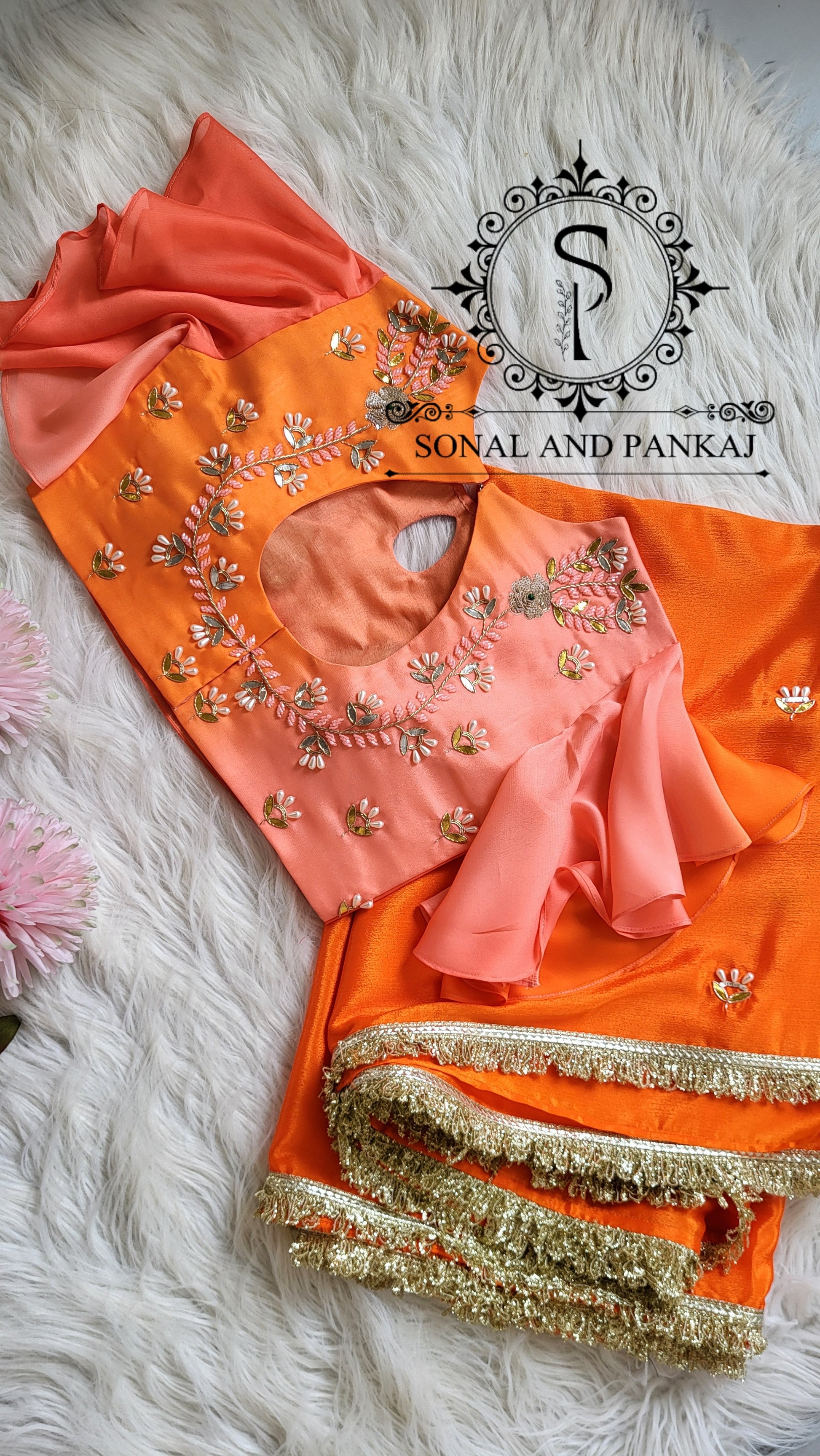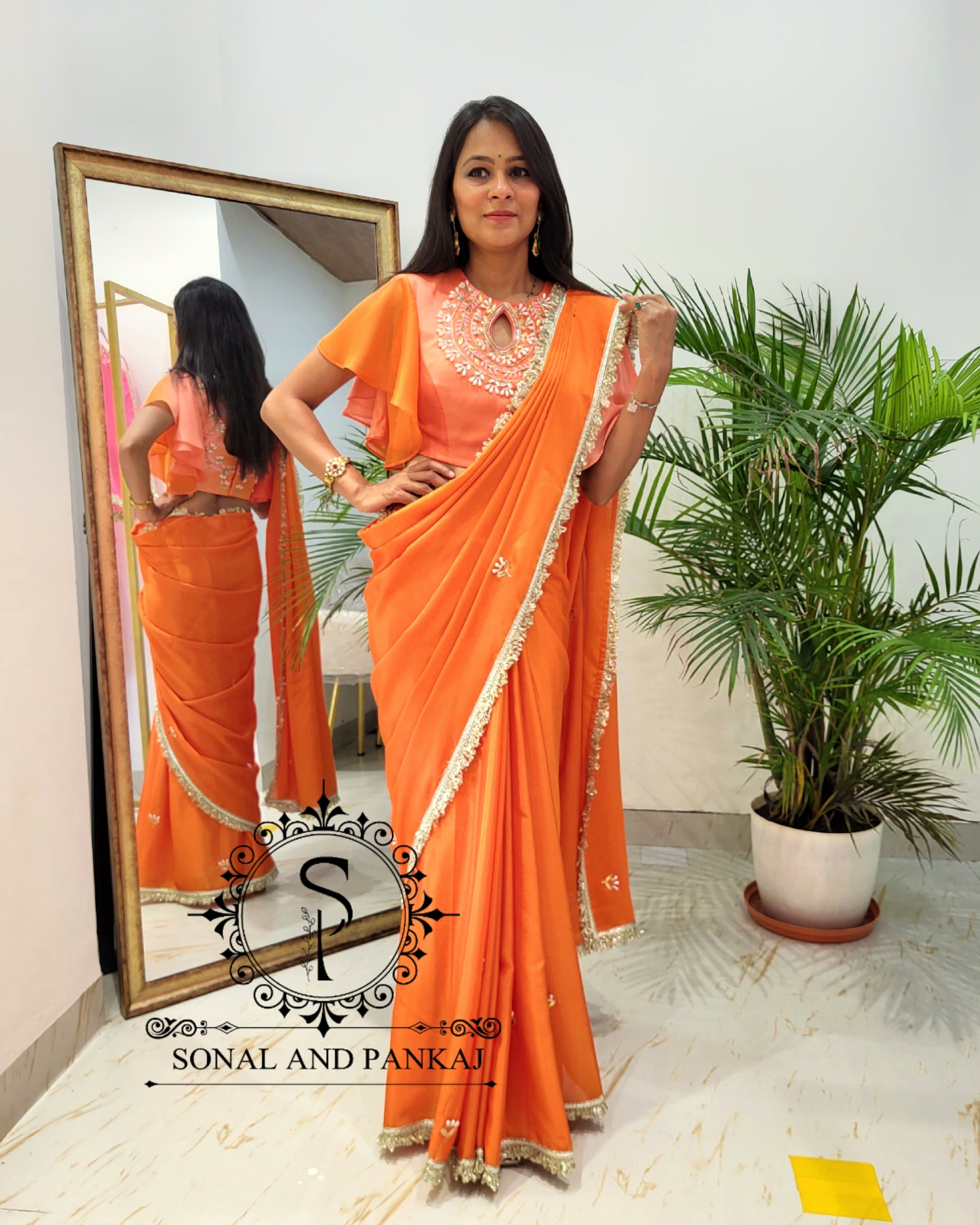 Designer Hand Embroidered Blouse With Tangy Orange Saree.