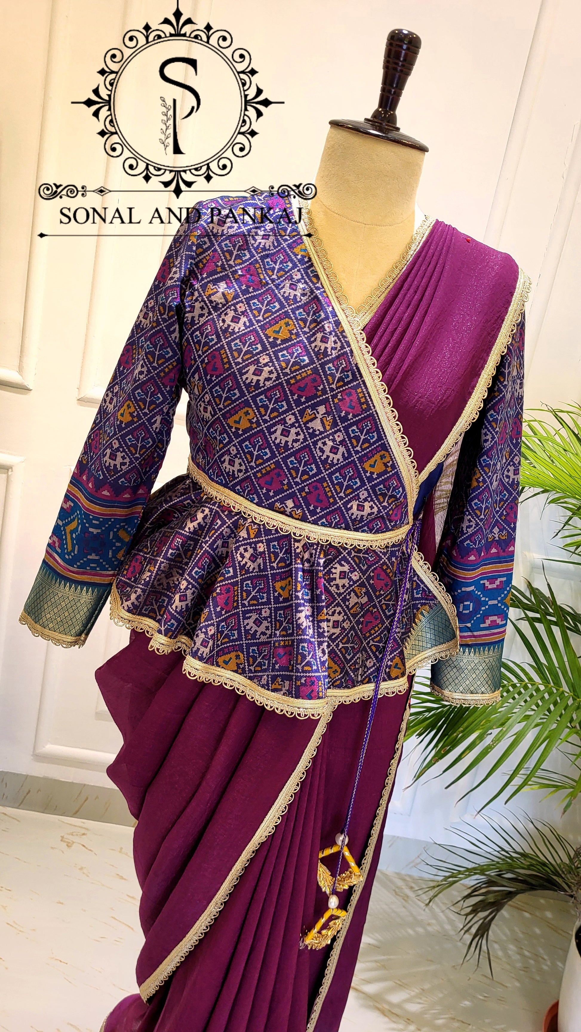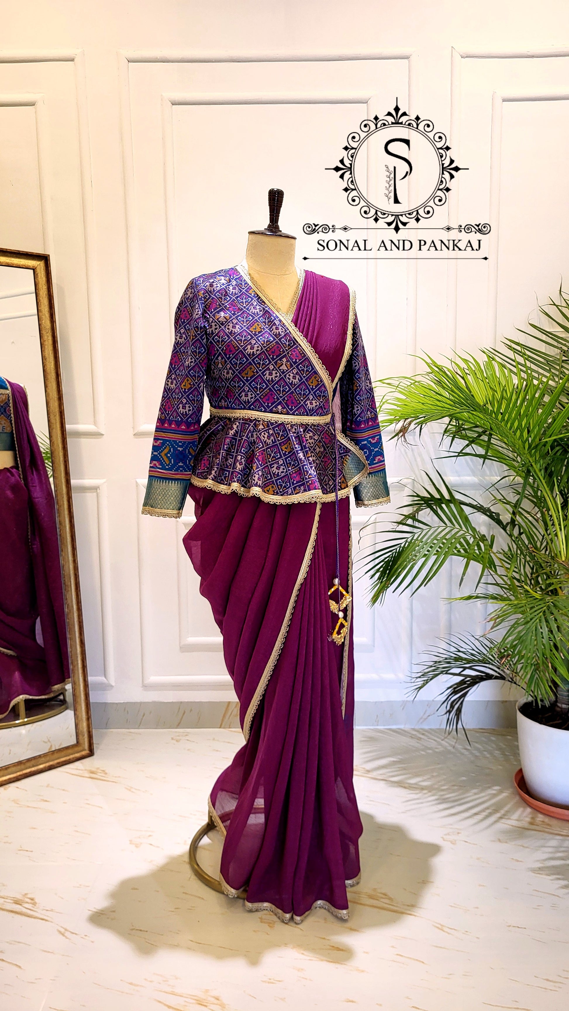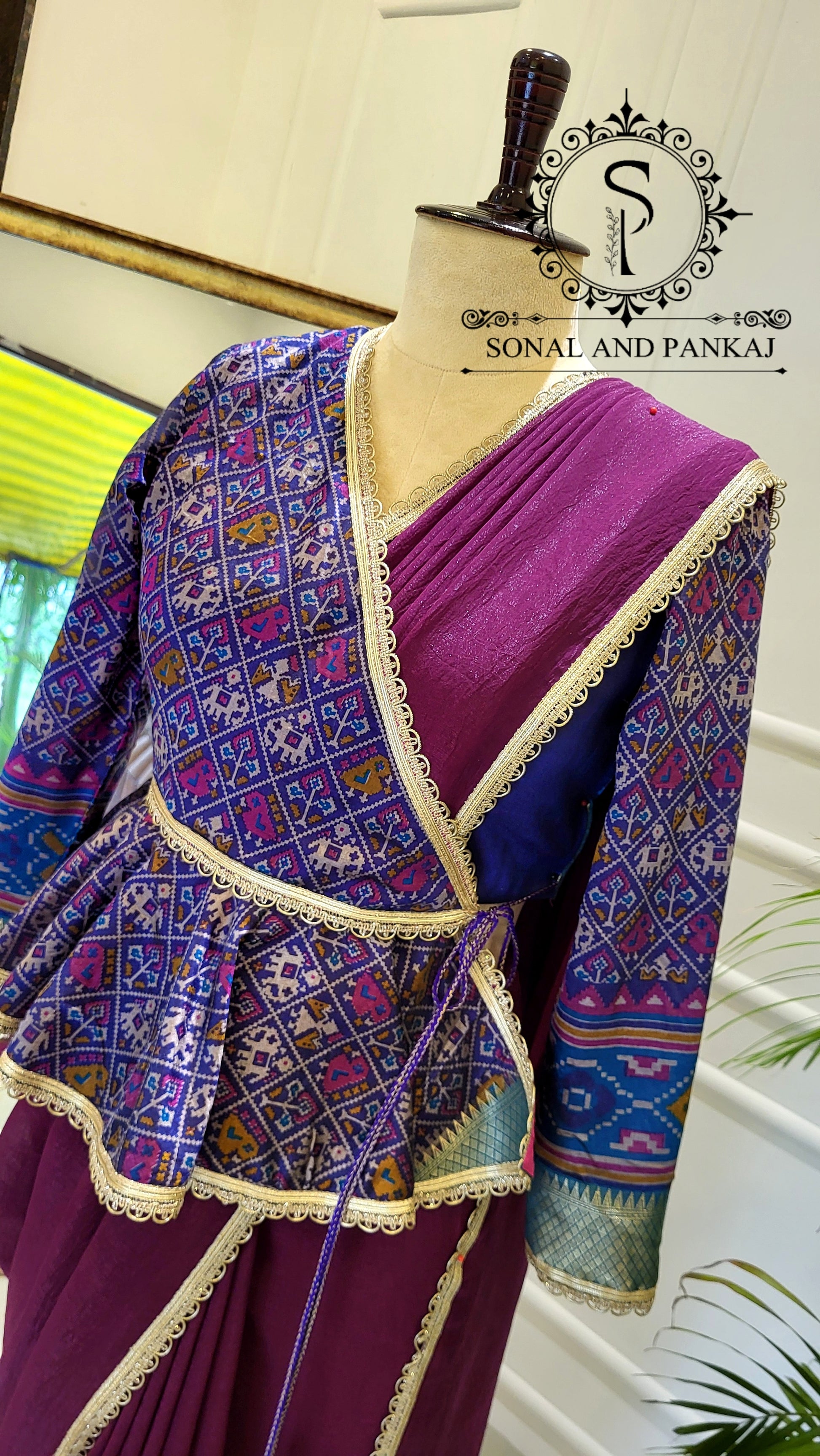 Jacket Style Patola Print Blouse With Wine Saree - SA01534