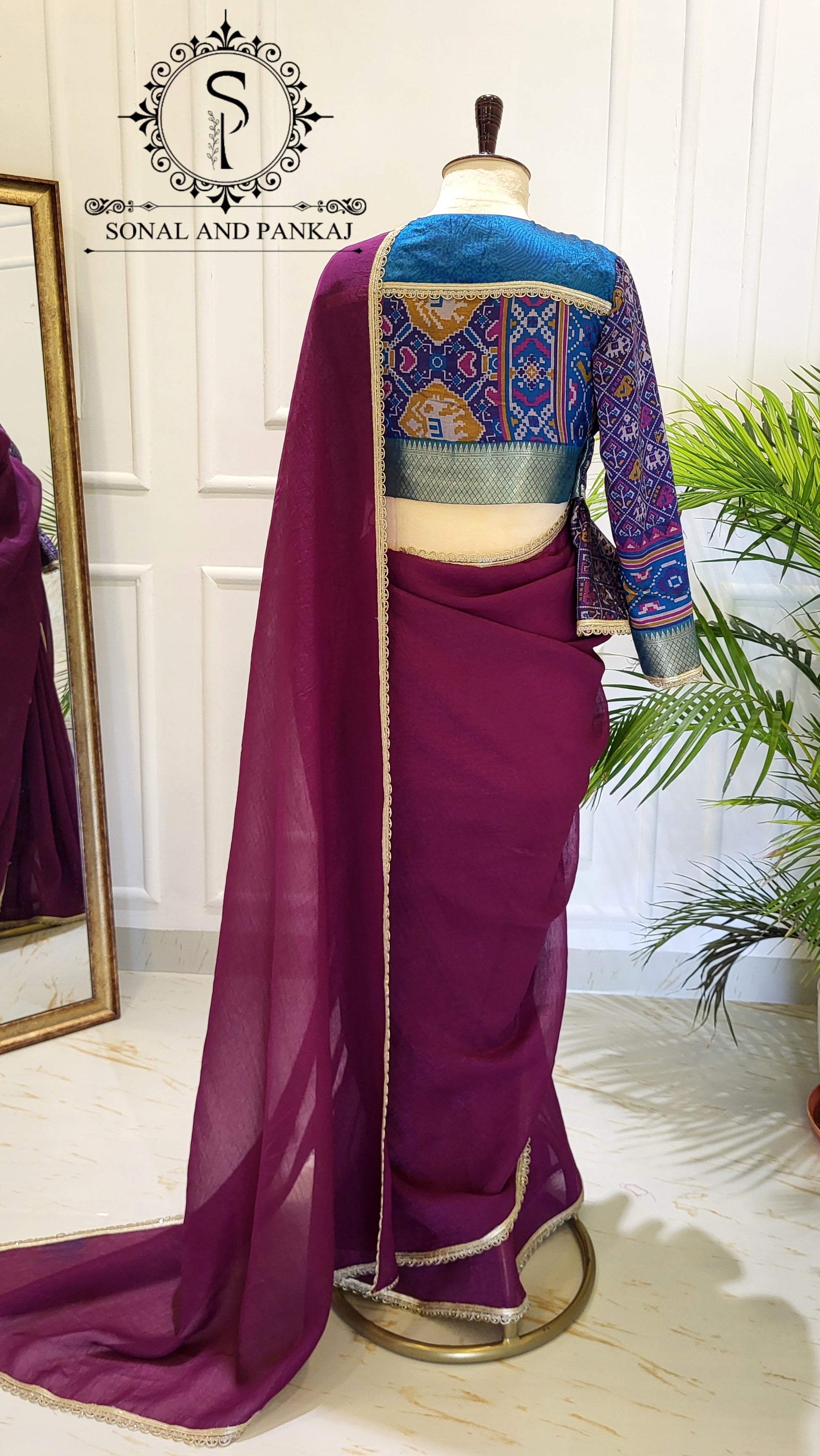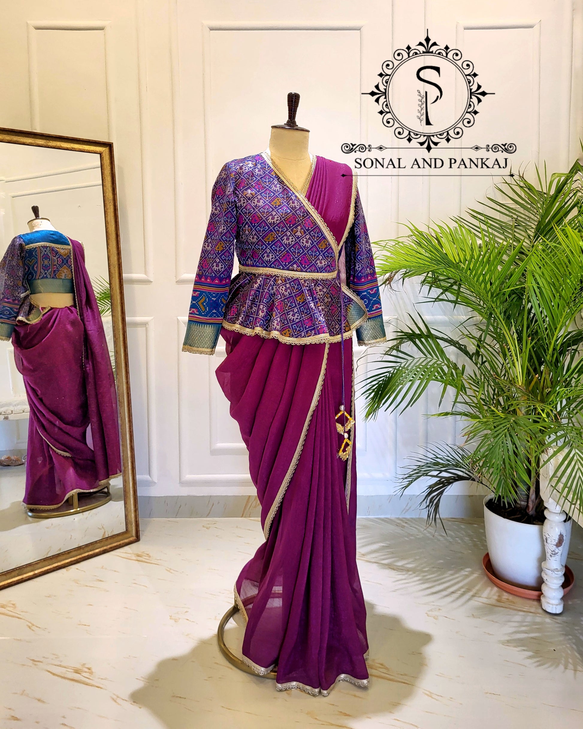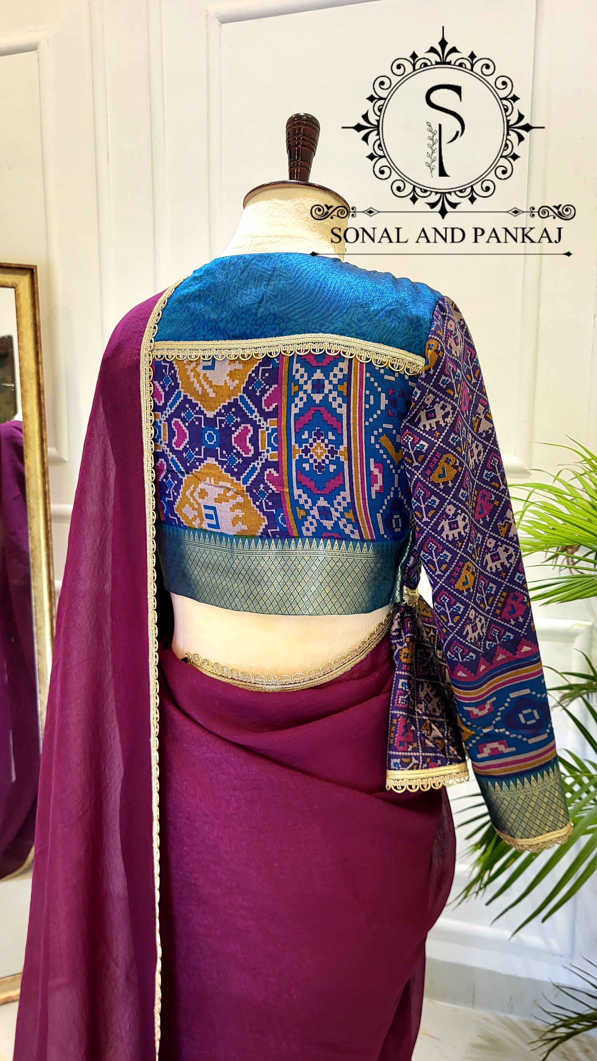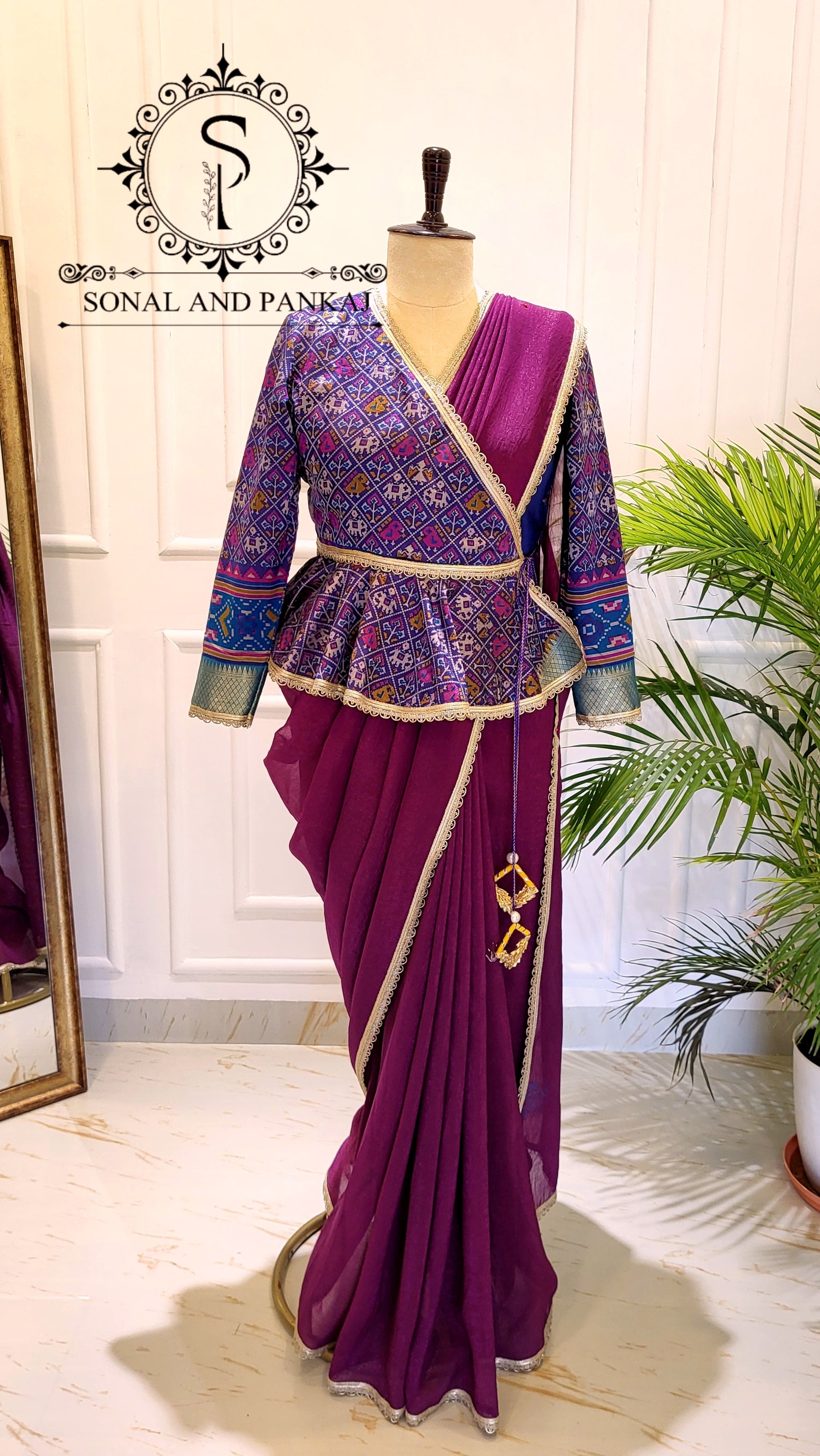 Jacket Style Patola Print Blouse With Wine Saree - SA01534