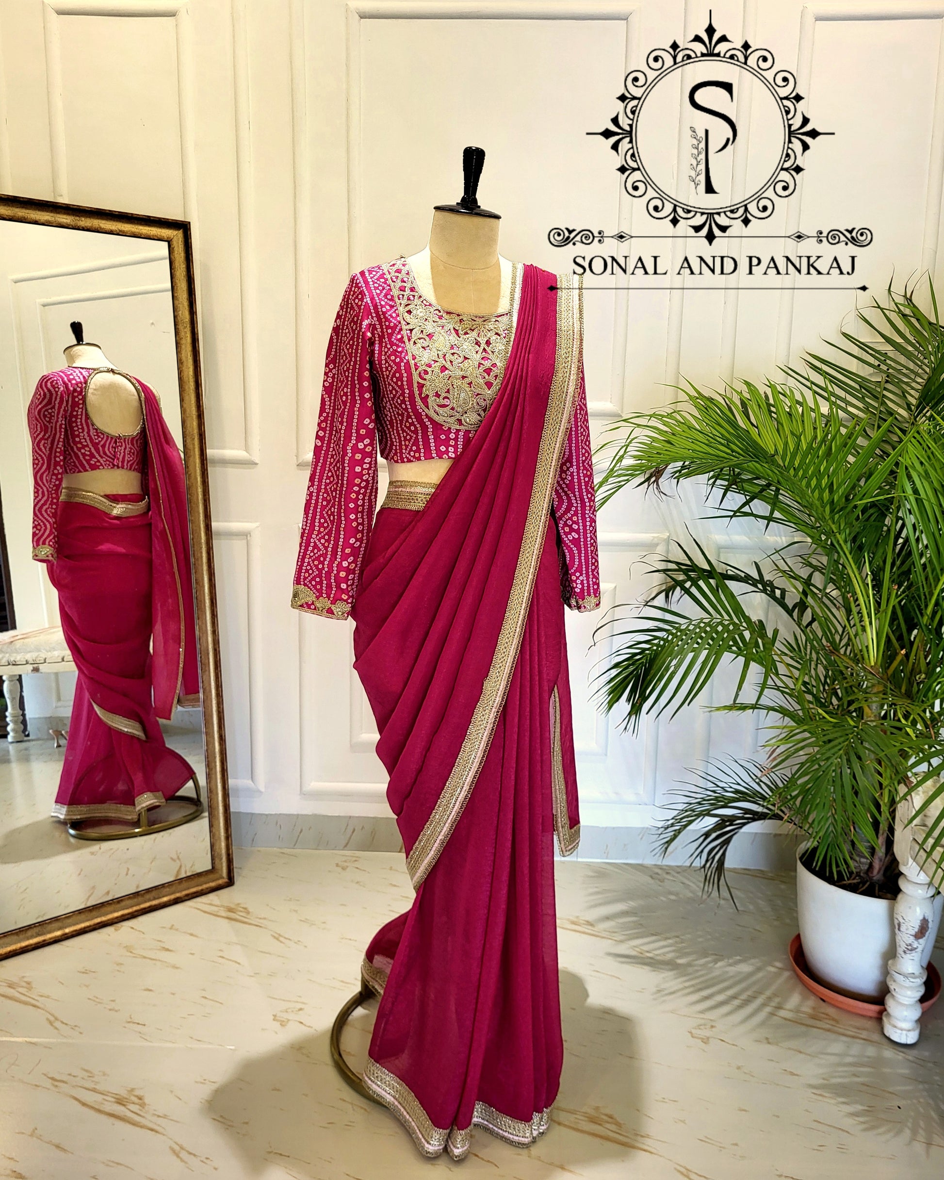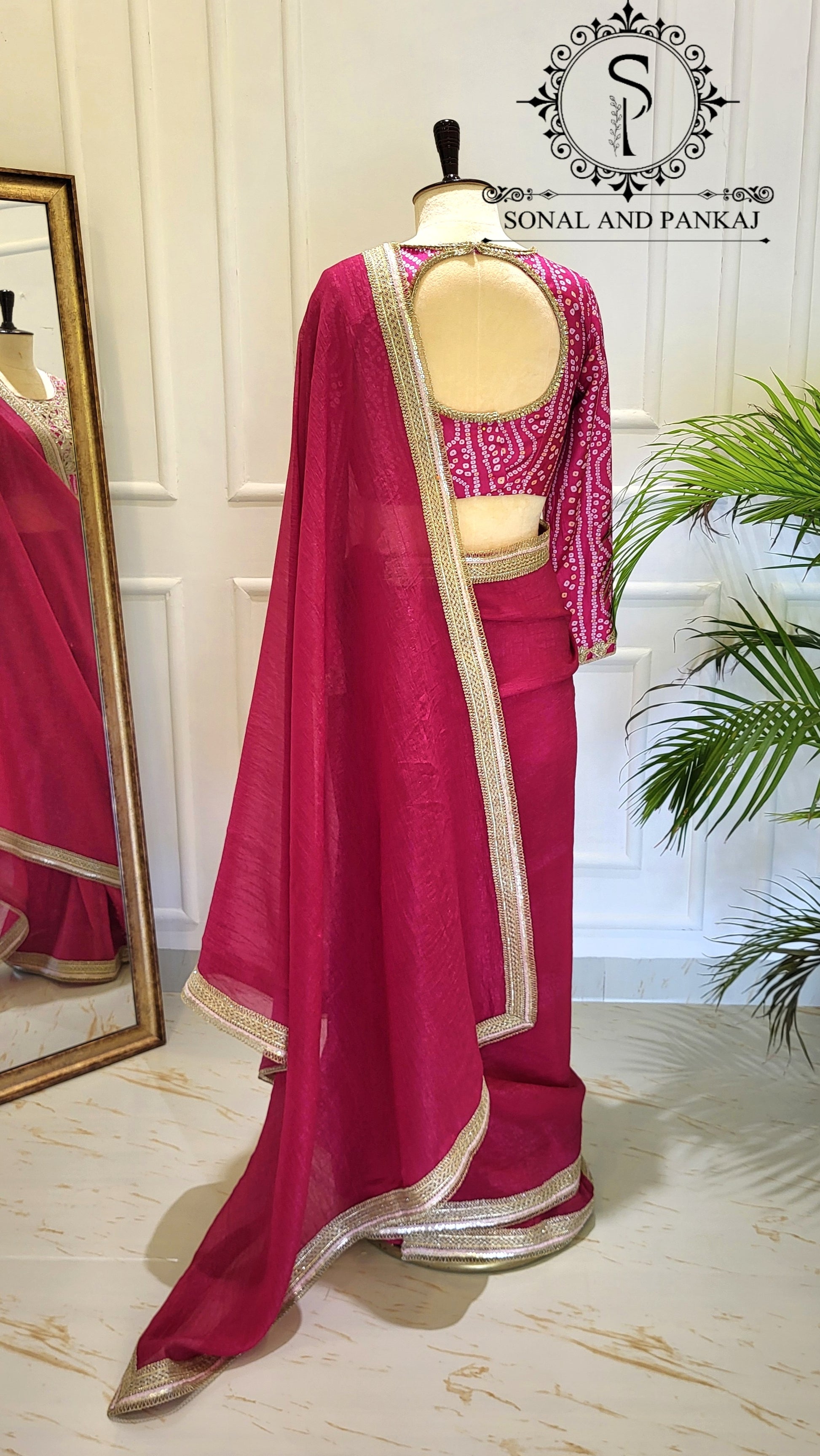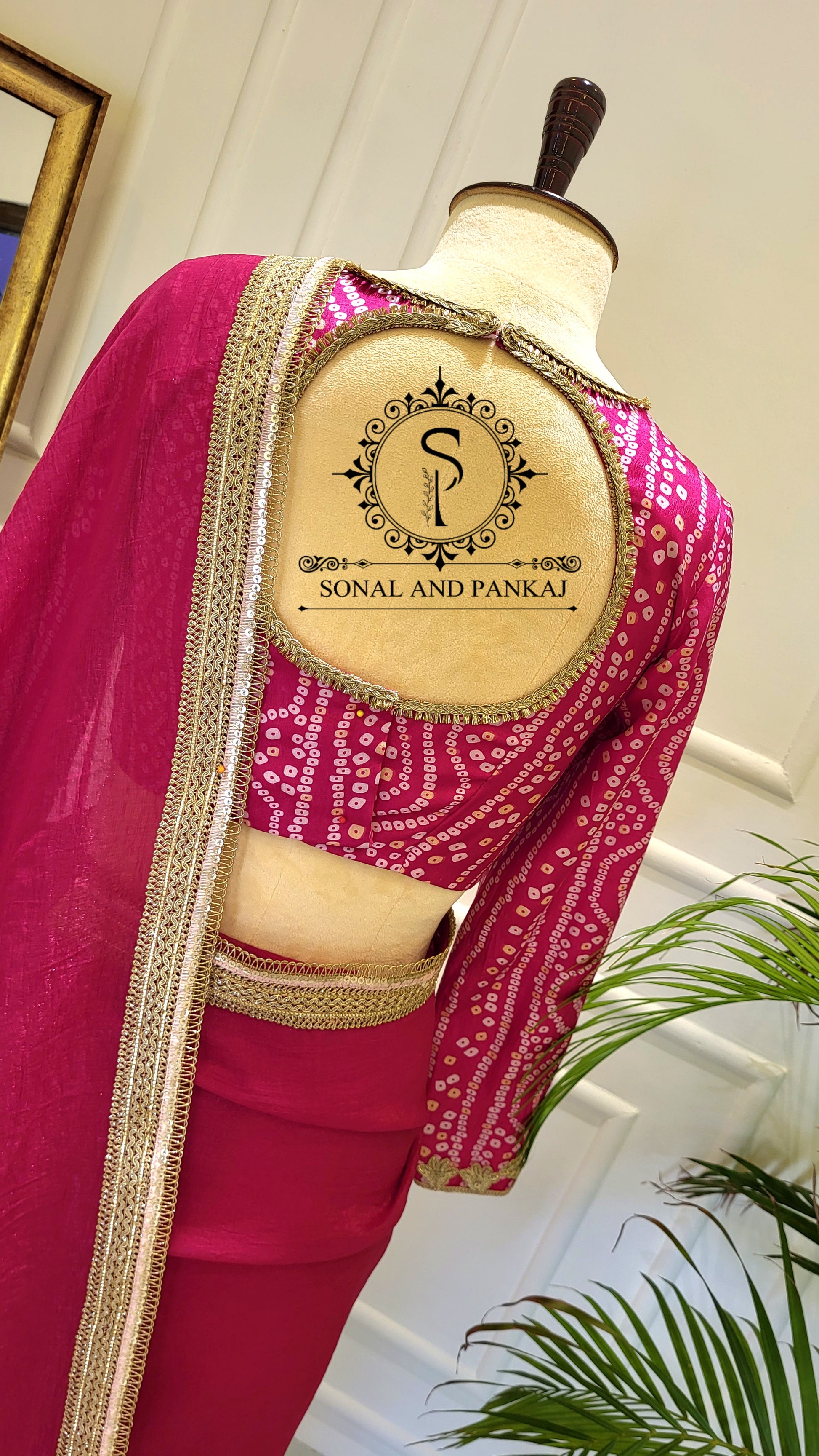 Pink Bandhani Yoke Style Blouse With Magenta Pink Saree.