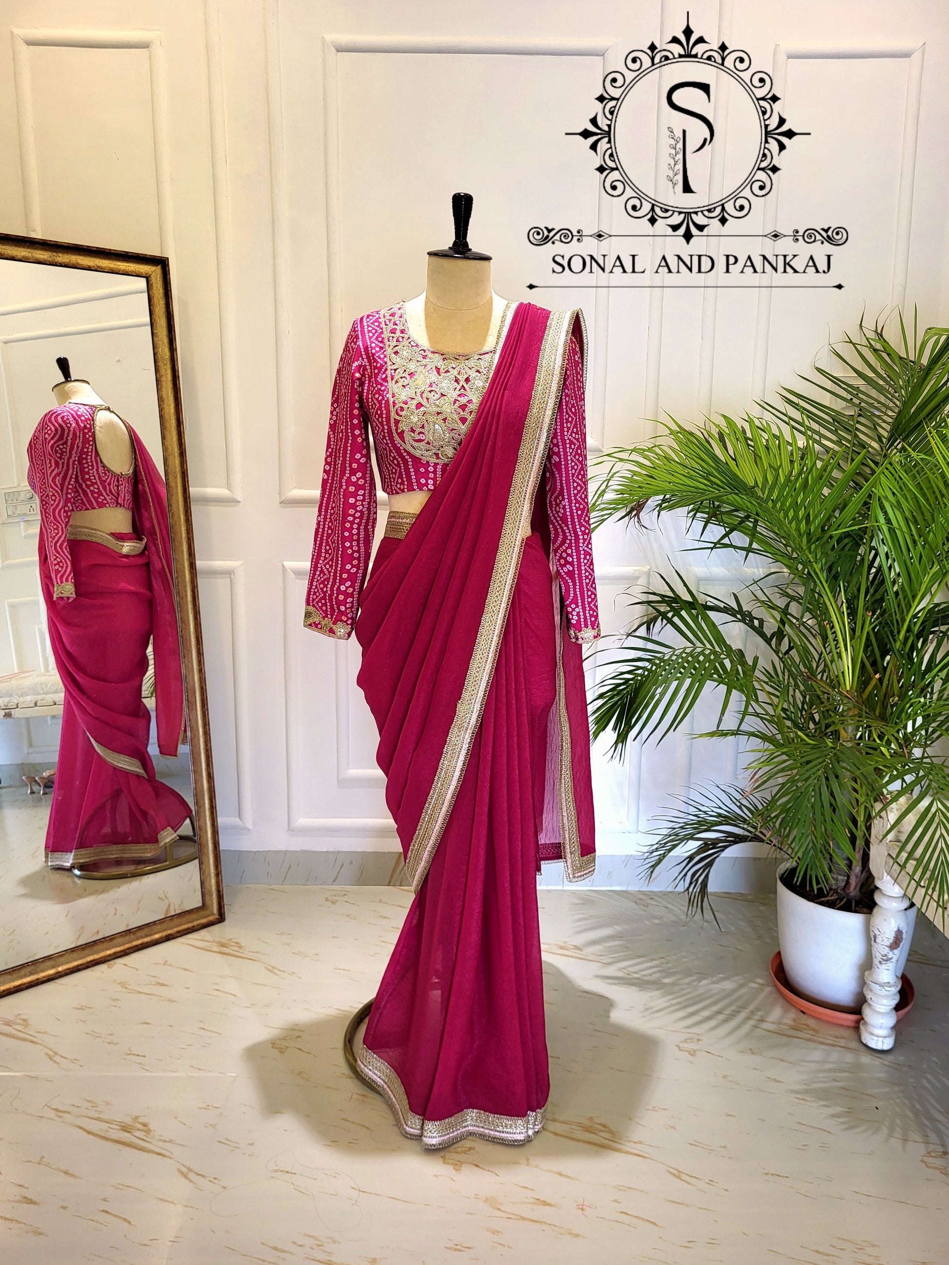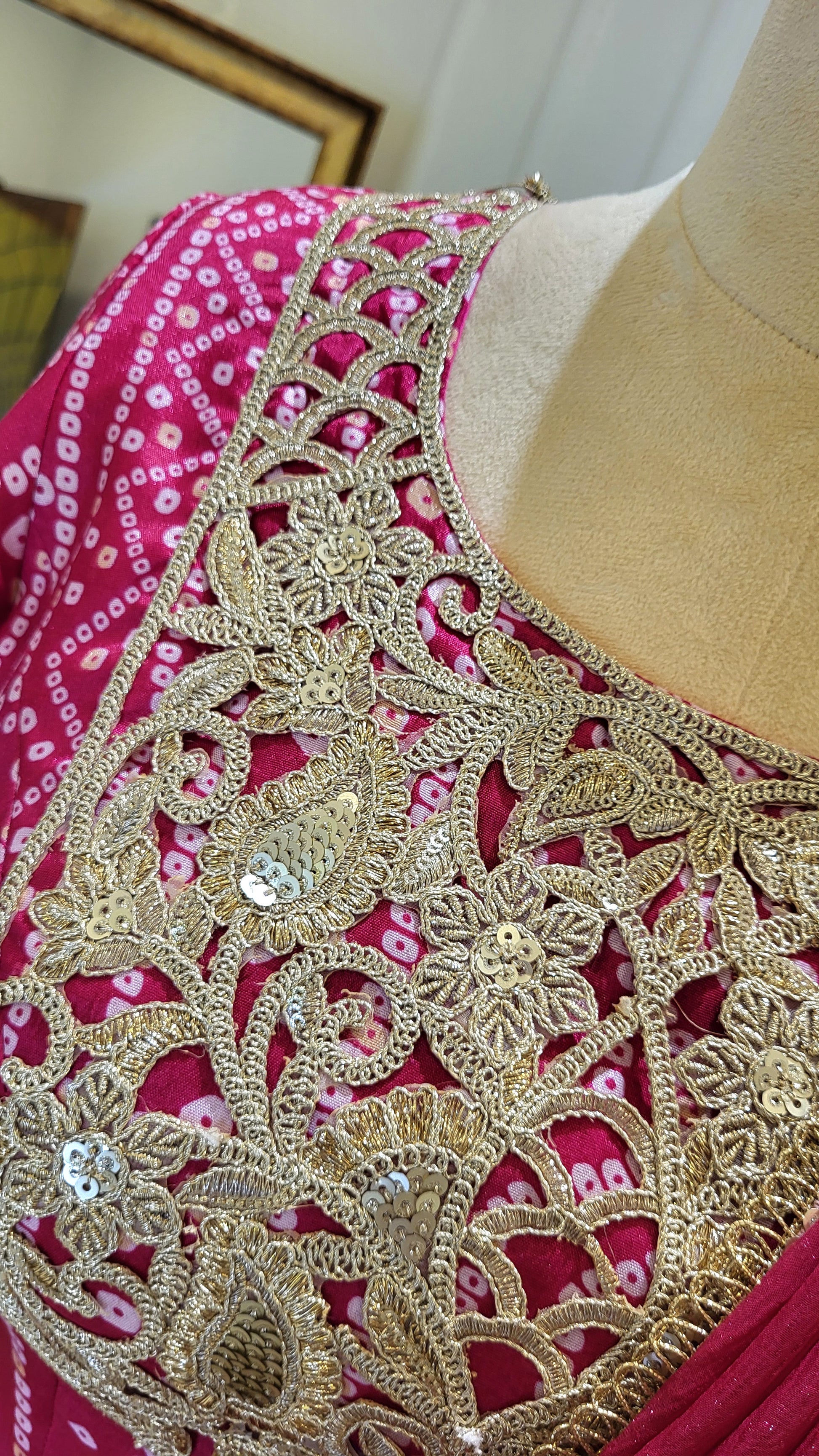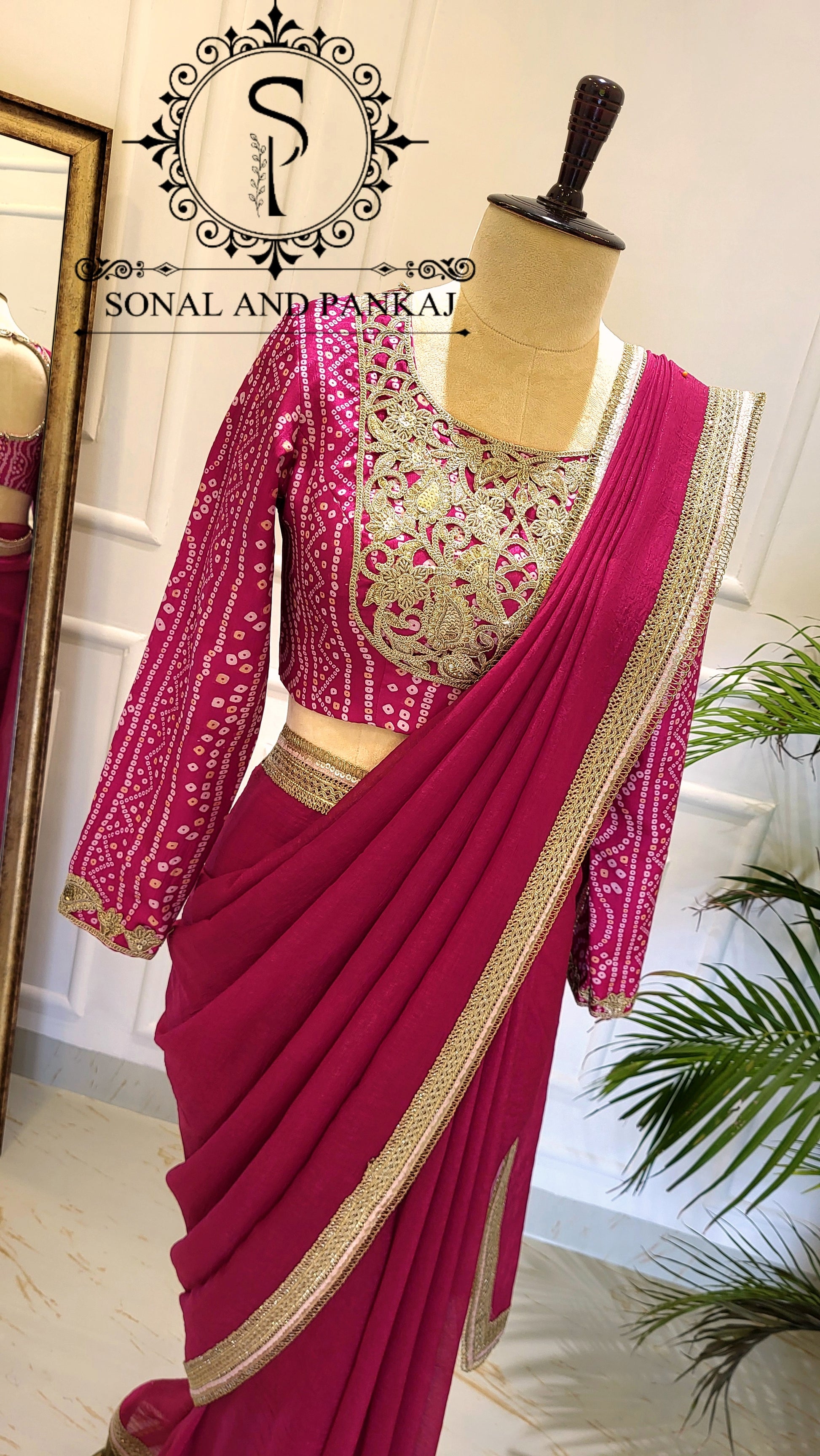 Pink Bandhani Yoke Style Blouse With Magenta Pink Saree.