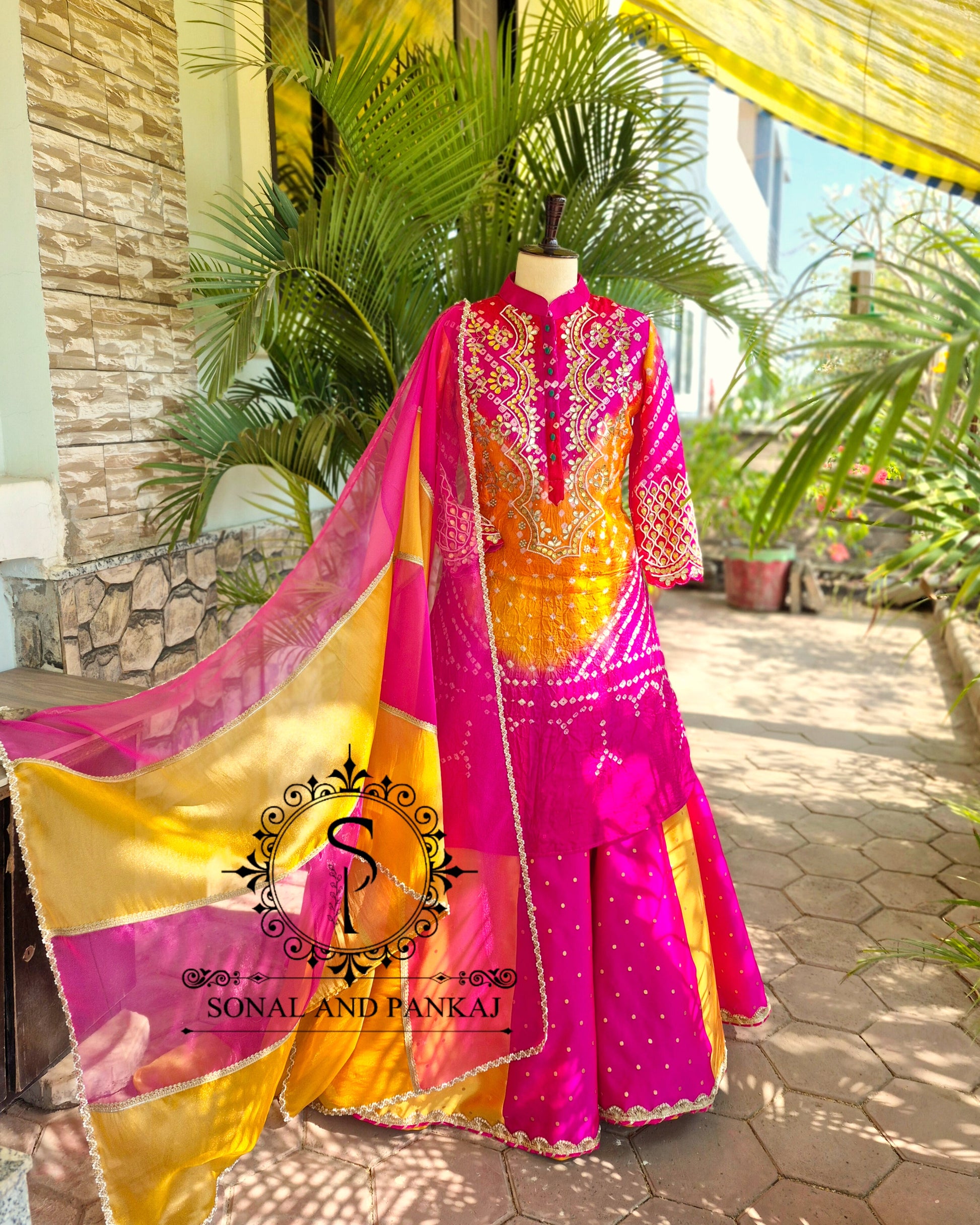 Handmade Bandhej Gotta Patti Hand Embroidered Kurti With Kalidaar Lehenga & Panneled Organza Duppatta With Elegant Pearl Borders.