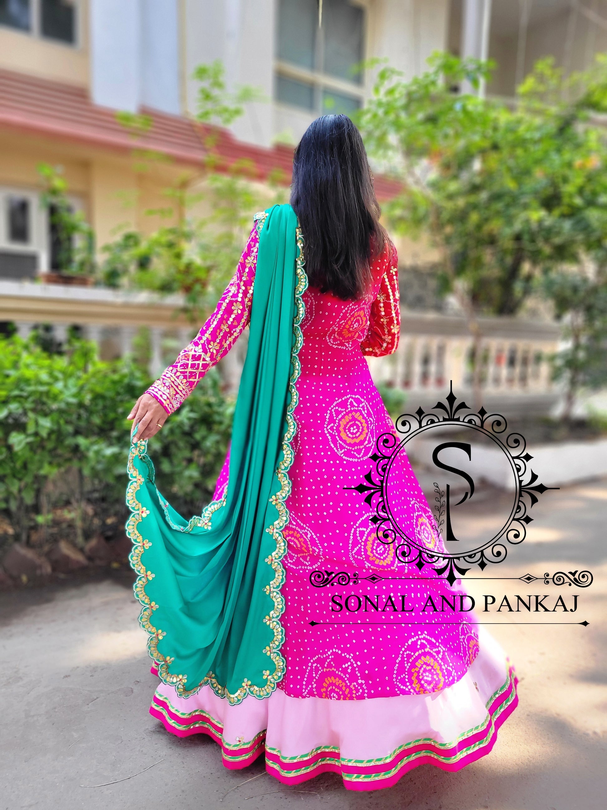 Pur bandhni kurti orné de travaux manuels gotta patti et d'un magnifique sari pré-plissé. Le placement des couleurs et l’imprimé bandhani peuvent changer à mesure qu’ils sont teints à la main. Sélectionnez une taille au-dessus de votre taille habituelle pour un port confortable.