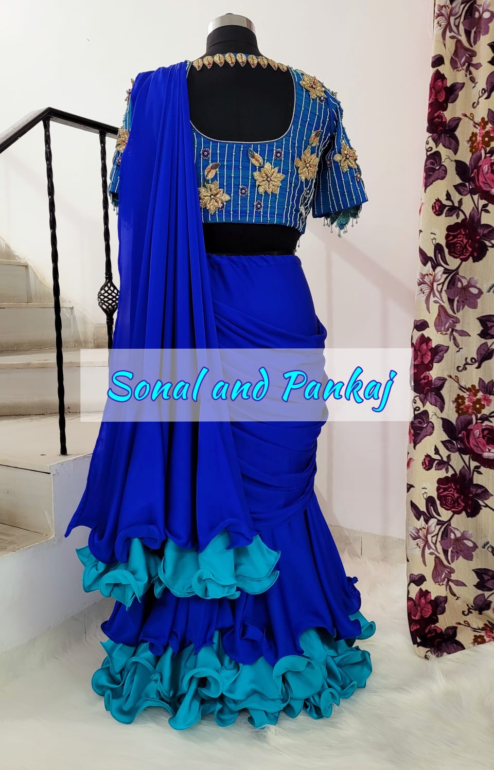 3D Peacock hand embroidered jacket style blouse with ready-to-wear layered ruffle saree.