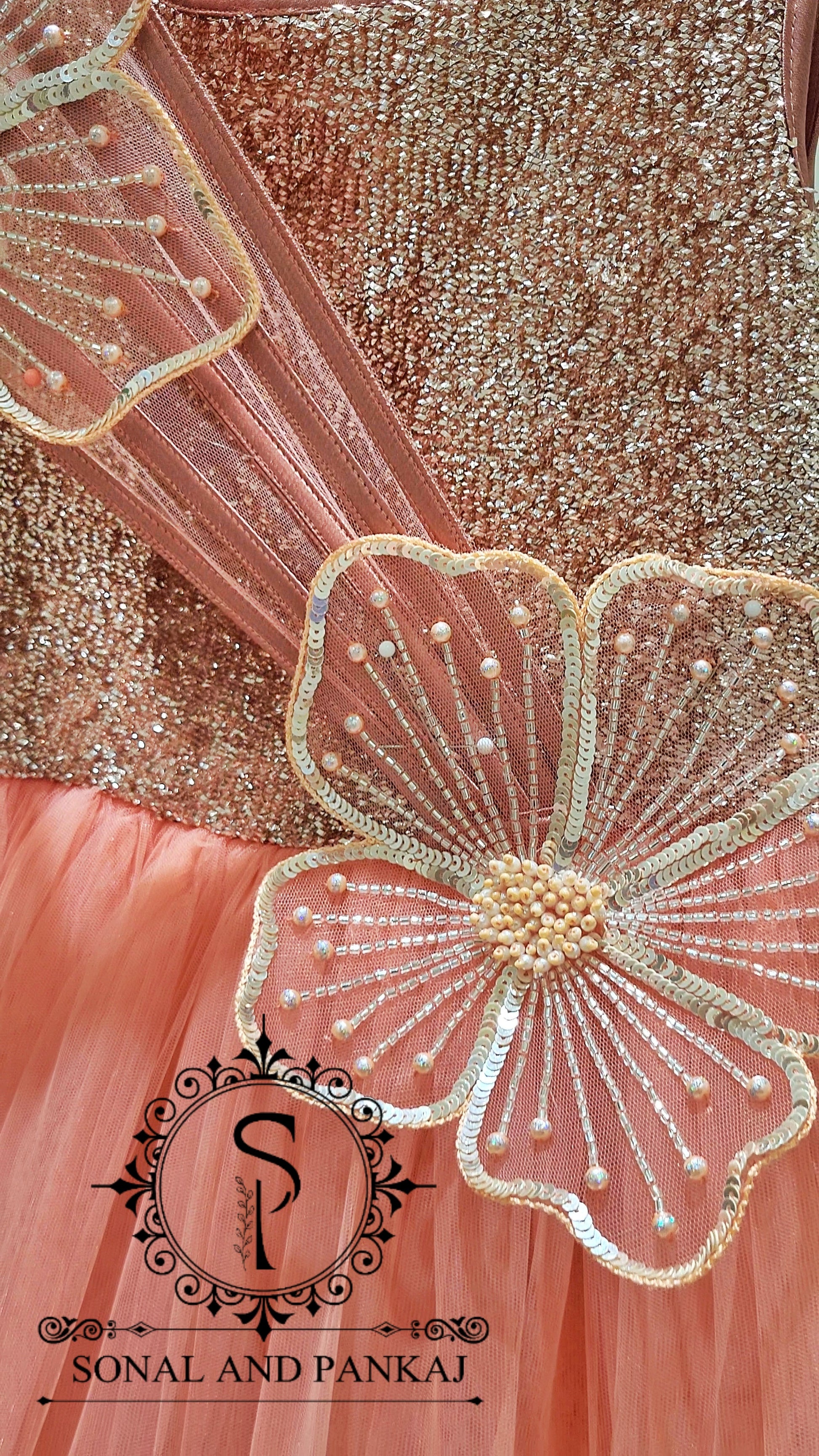 Work Details: 3d hand made flowers with cutdana, pearls & sequins hand embroidery.