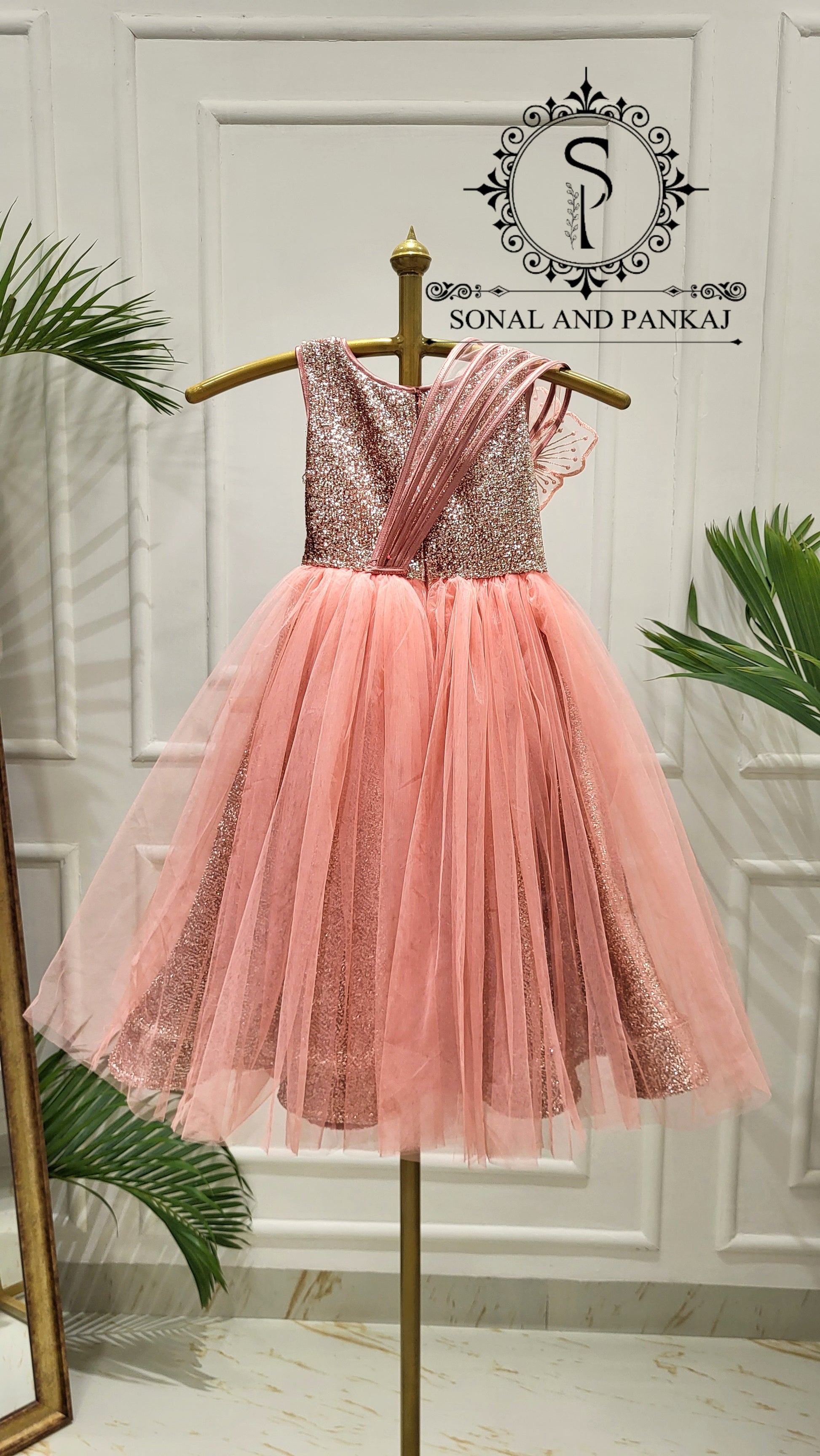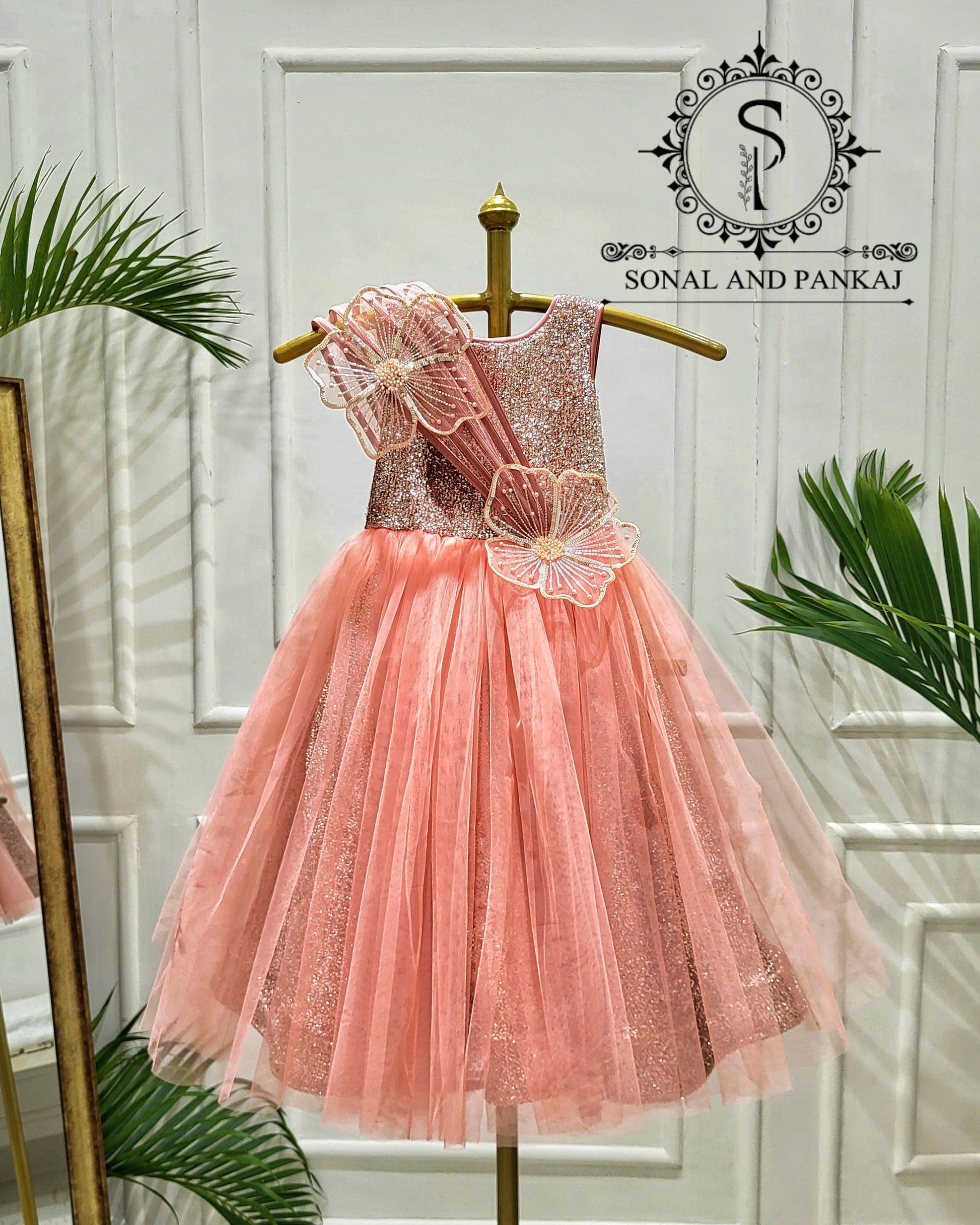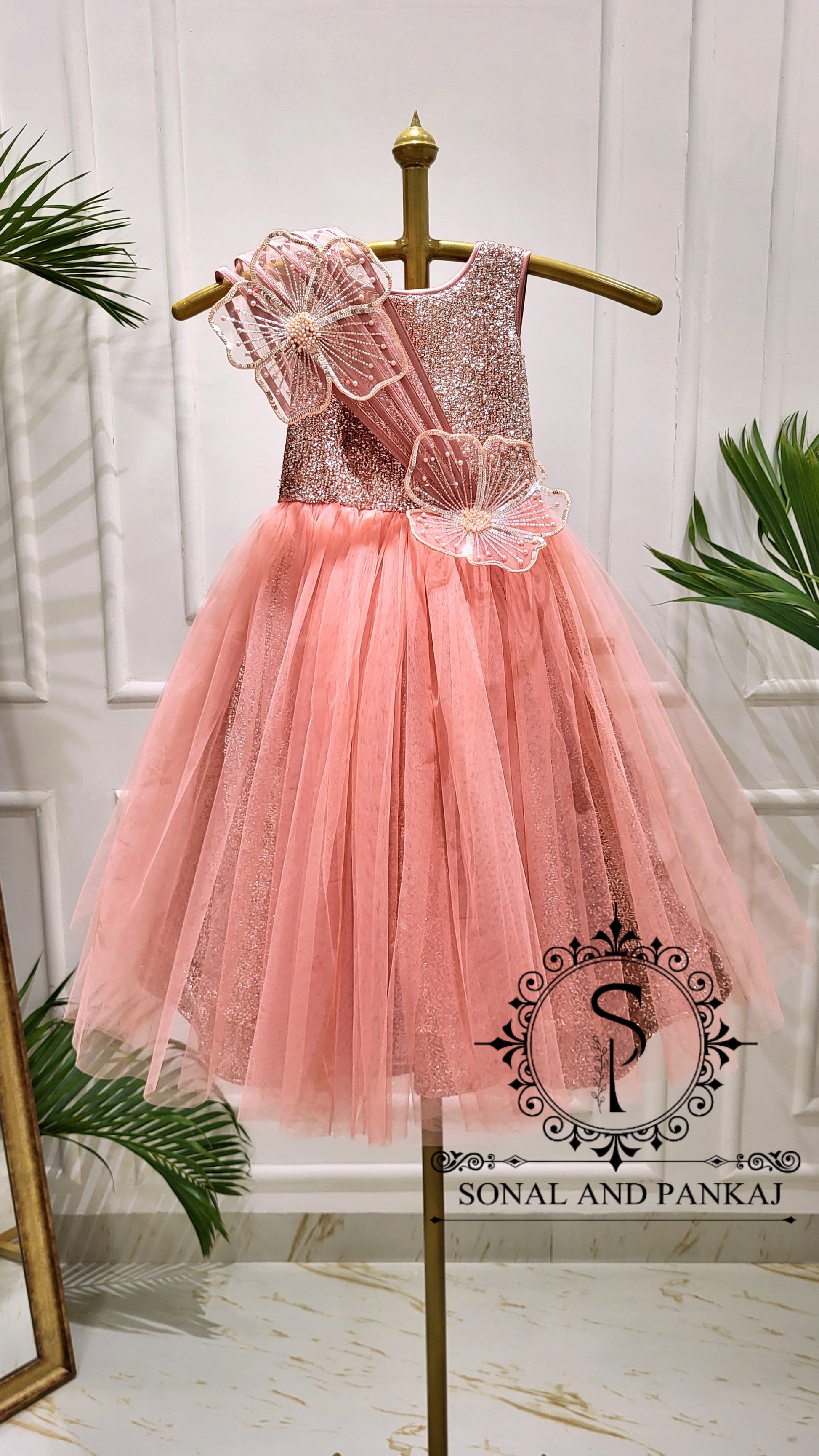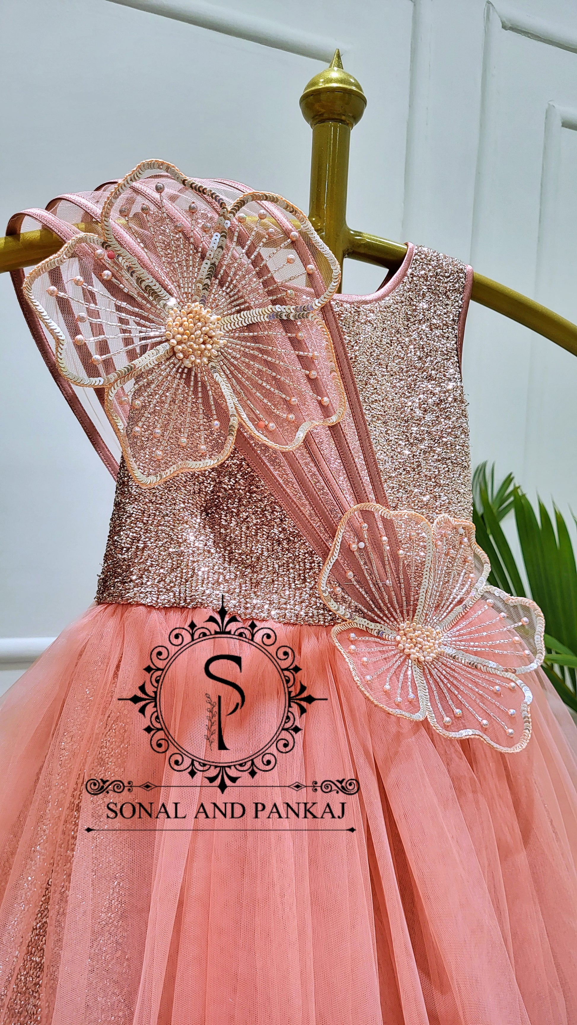 Designed to turn special occasions into storybook moments, the peach floral blossom gown blends whimsical charm with refined detailing. Let your child shine in a creation where artistry and imagination come together.