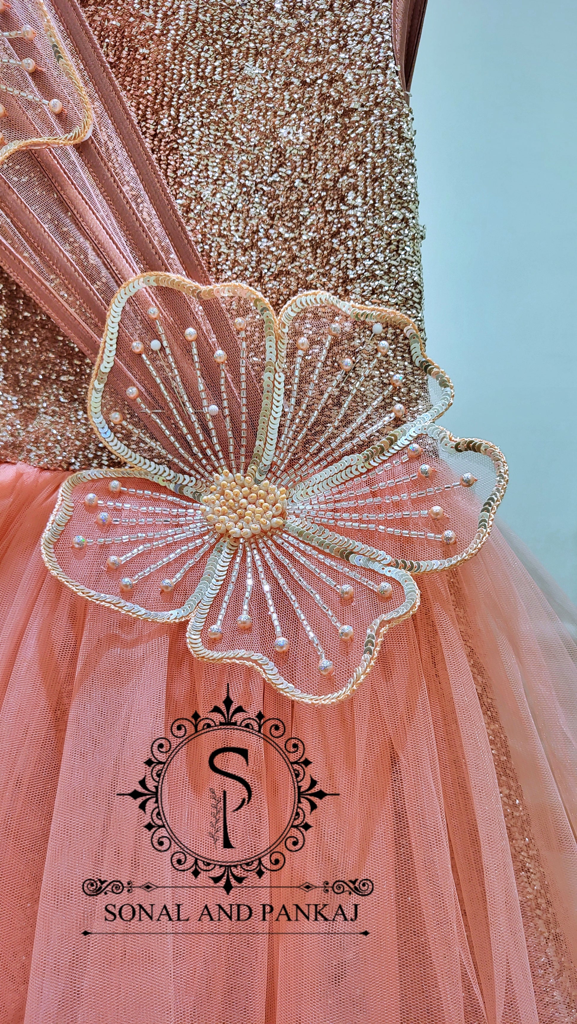 Handmade 3D embroidered flowers with pearl, cutdana & holographic sequins hand embroidery adorn the waist and shoulder, creating a luxurious focal point. Each blossom is meticulously stitched, reflecting hours of artisanal dedication.
