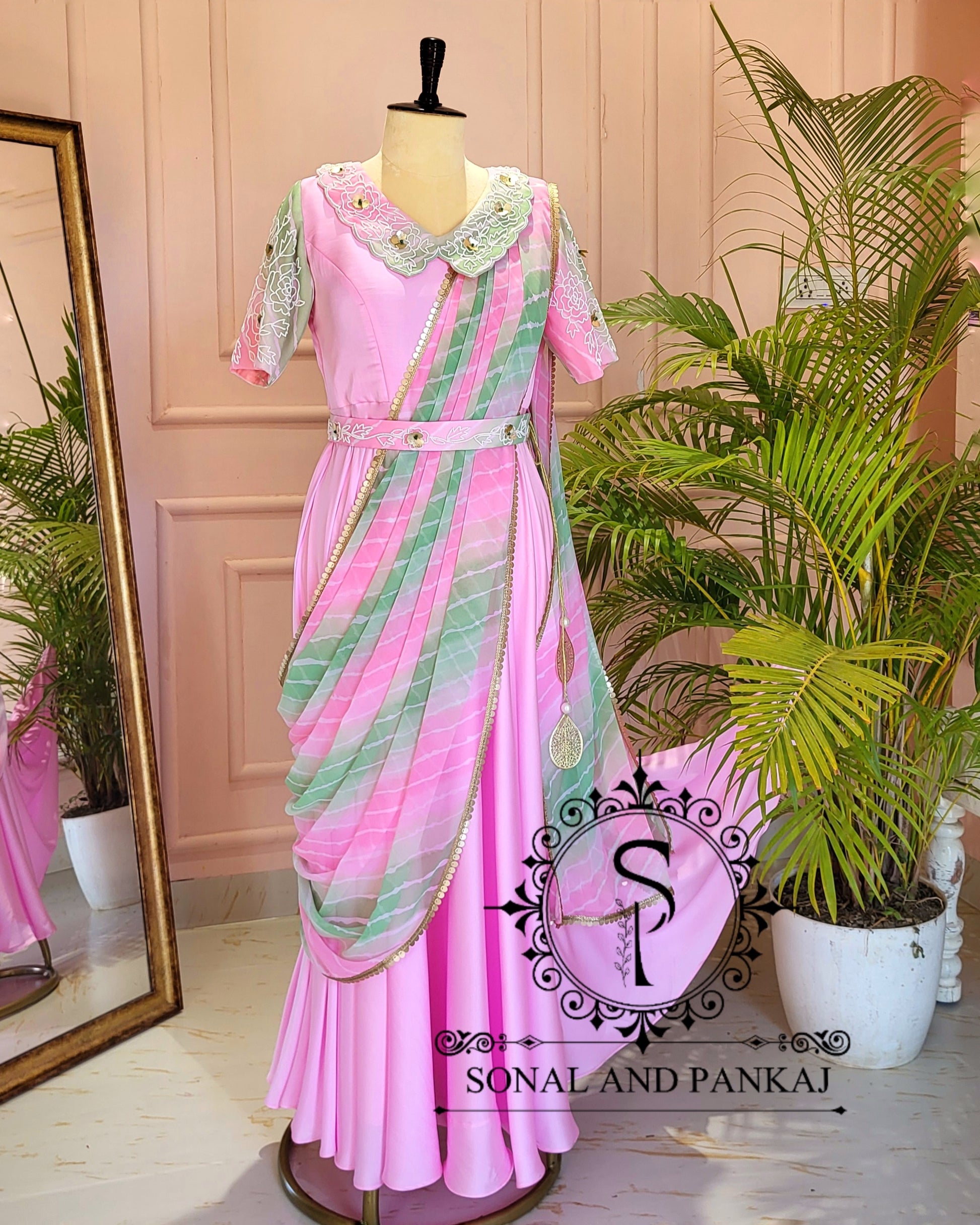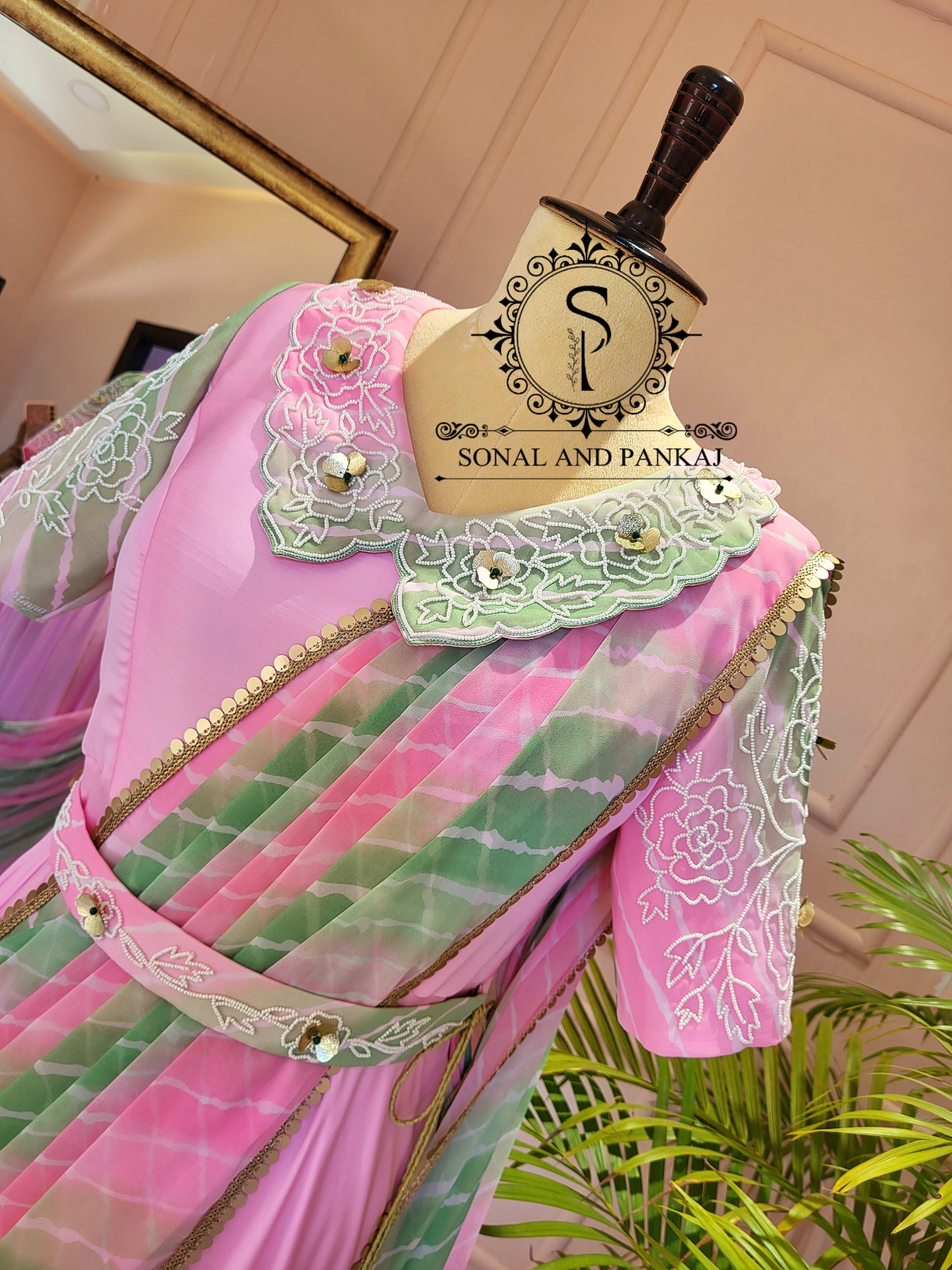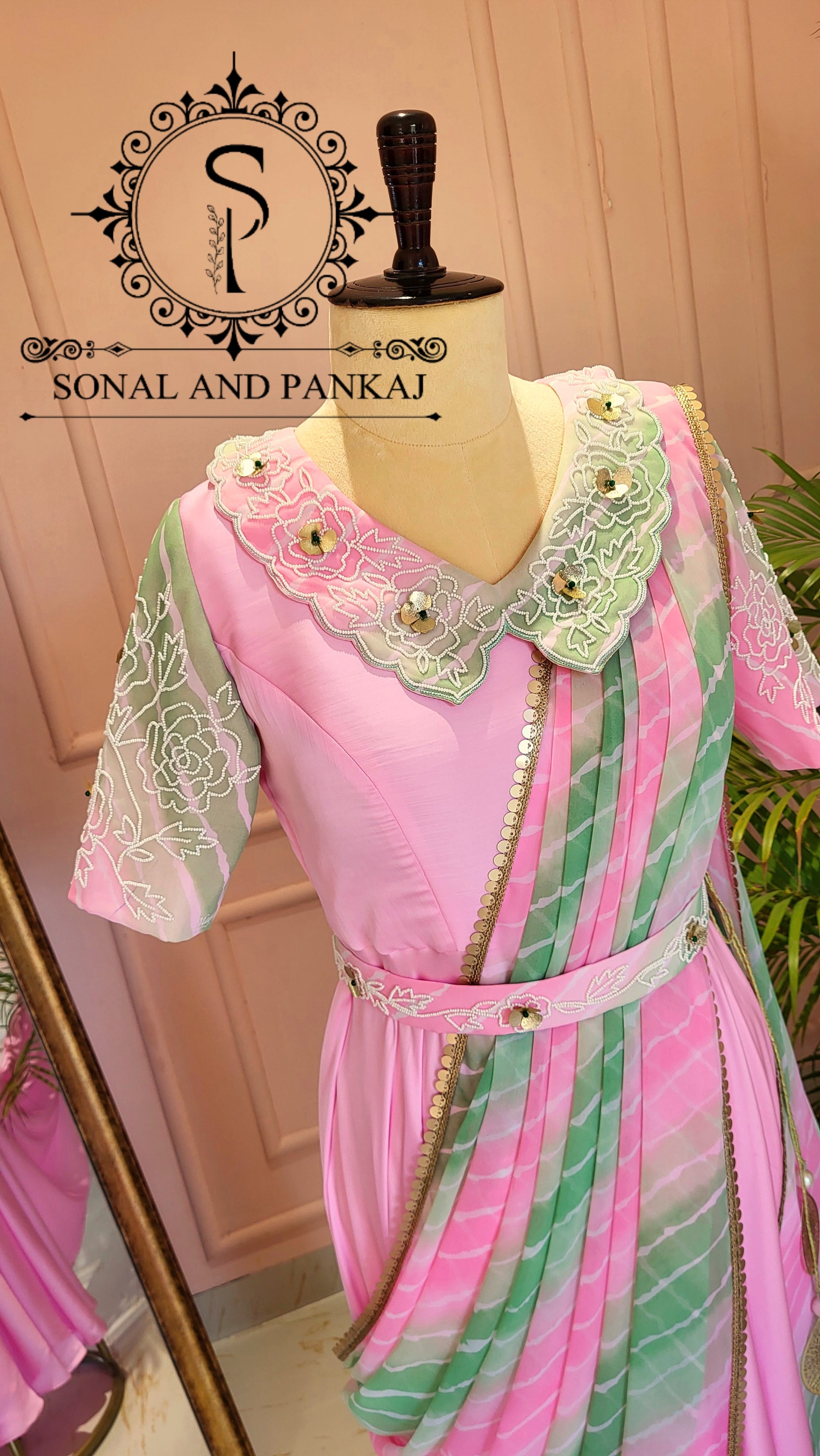 Description: Explore the realm of elegance with our Baby Pink & Pista Green Hand-Embroidered, Pearl Hand-Embroidery & shaded leheriya palloo ready-to-wear gown saree. This exquisite ensemble seamlessly blends contemporary gown styling with timeless hand-embroidered pearl craftsmanship, creating a captivating masterpiece. Adorn yourself with this creation, designed to grace any special occasion with unmatched sophistication and style.
