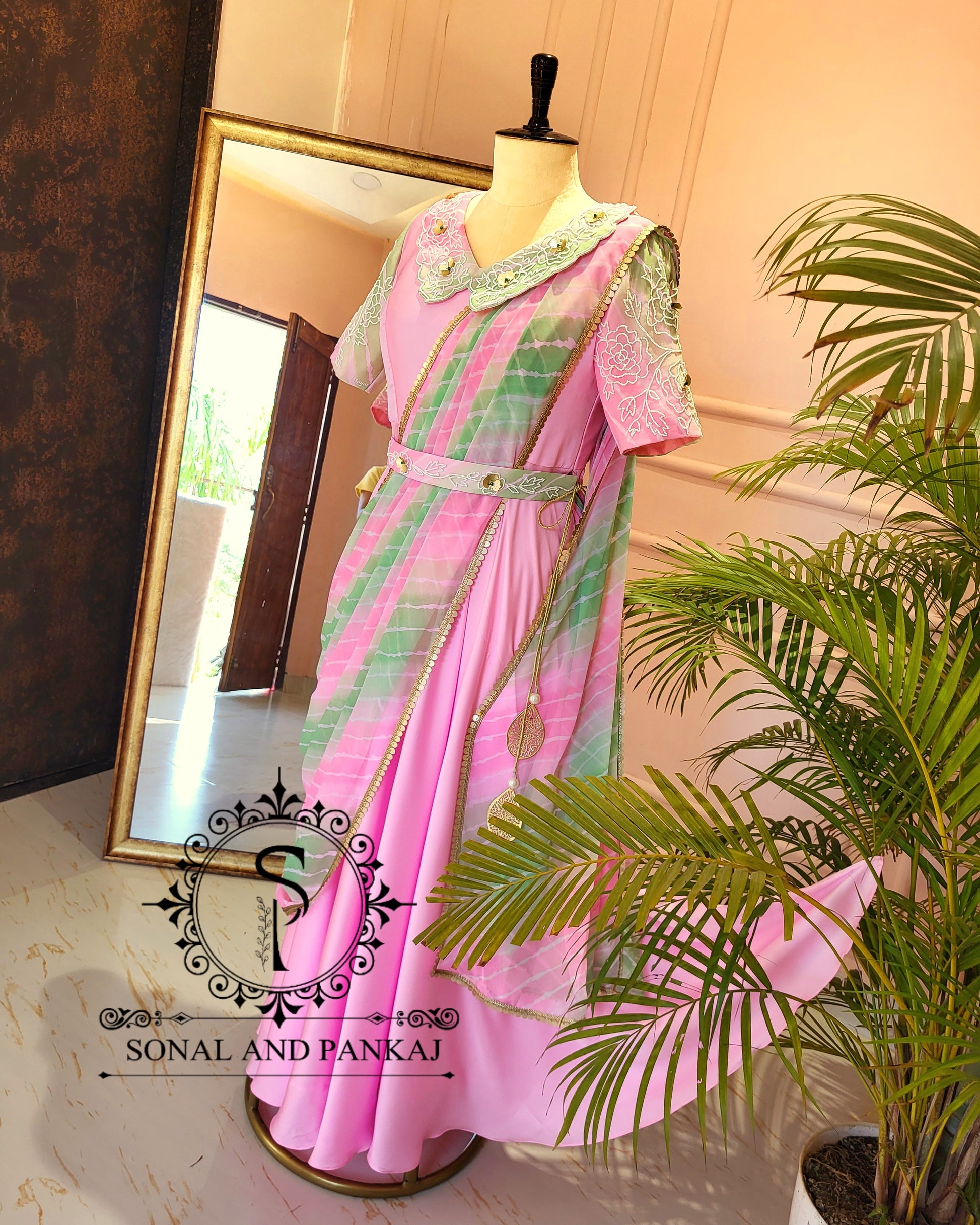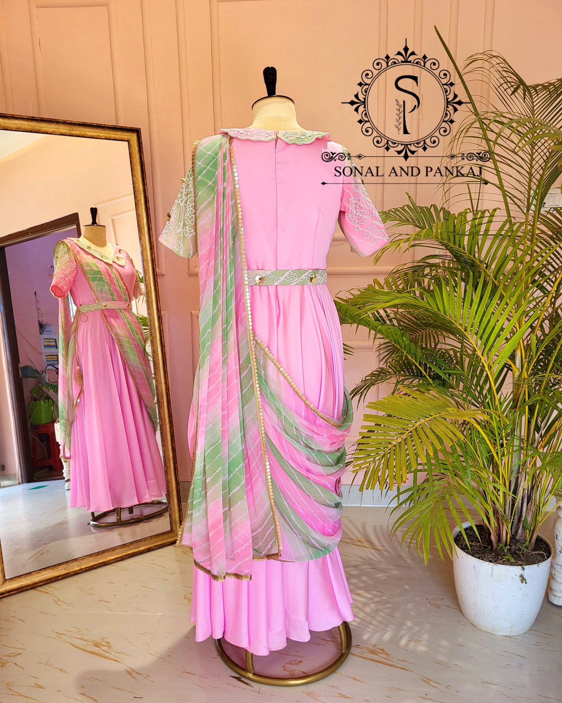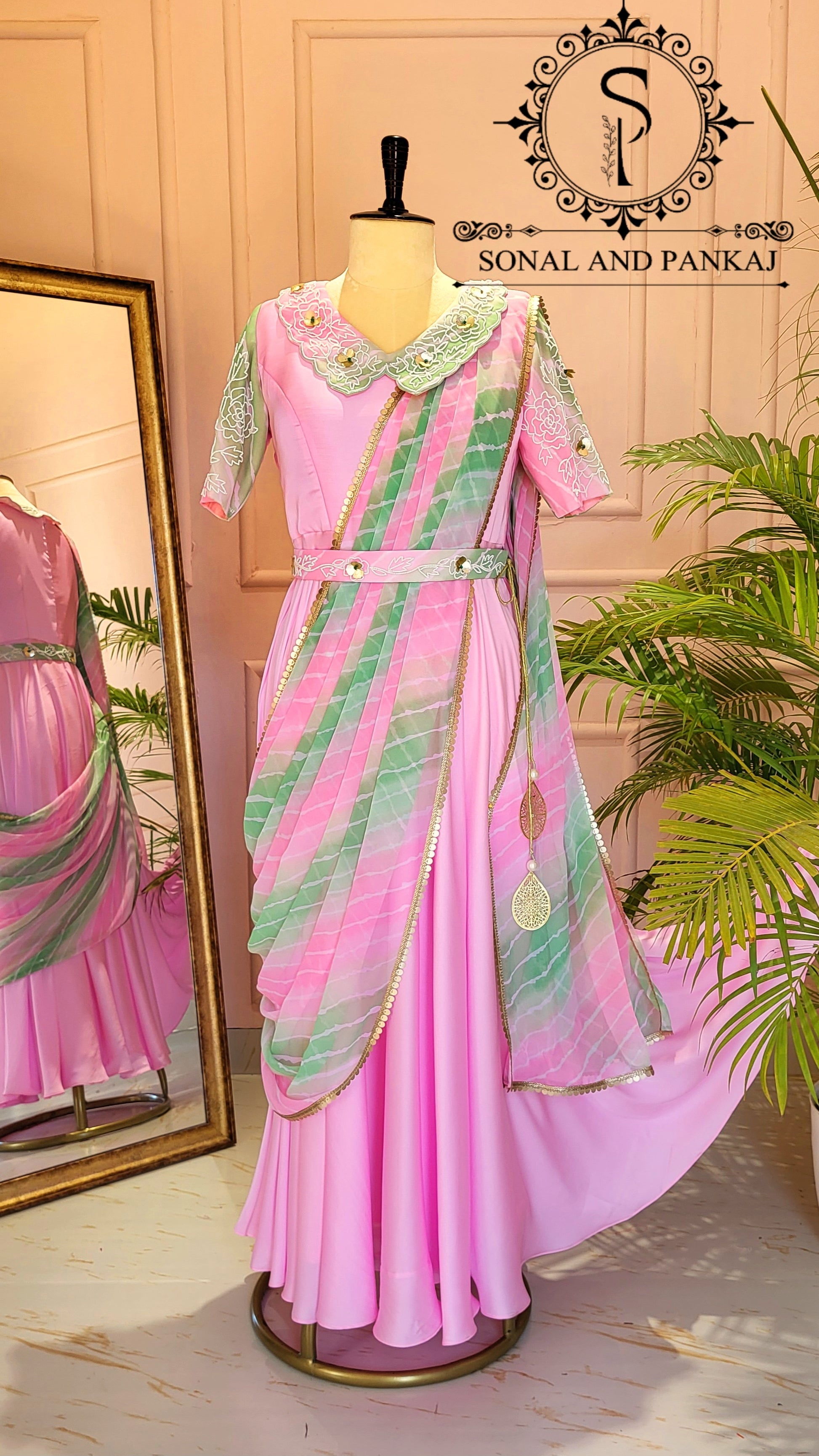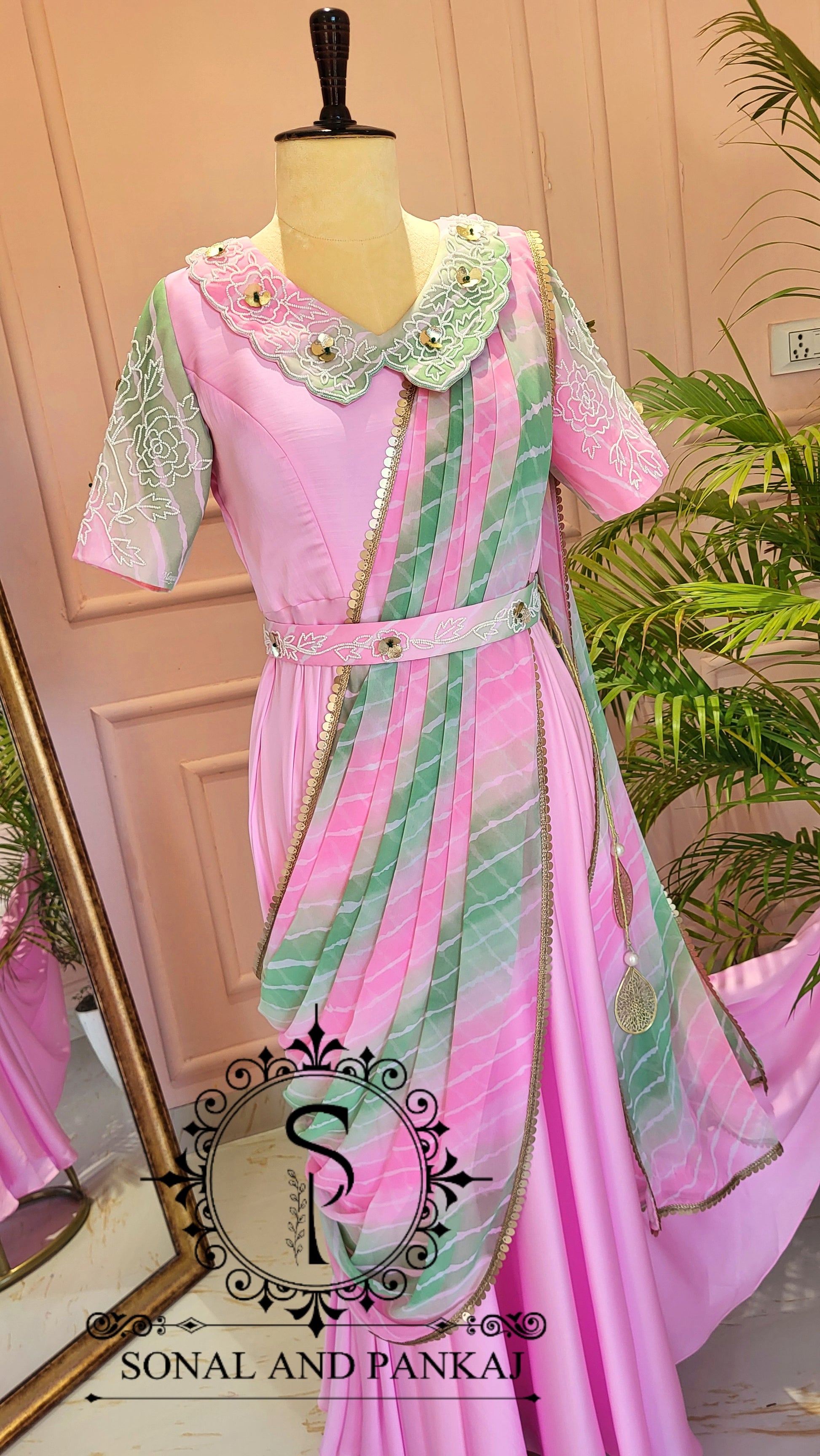 Description: Explore the realm of elegance with our Baby Pink & Pista Green Hand-Embroidered, Pearl Hand-Embroidery & shaded leheriya palloo ready-to-wear gown saree. This exquisite ensemble seamlessly blends contemporary gown styling with timeless hand-embroidered pearl craftsmanship, creating a captivating masterpiece. Adorn yourself with this creation, designed to grace any special occasion with unmatched sophistication and style.
