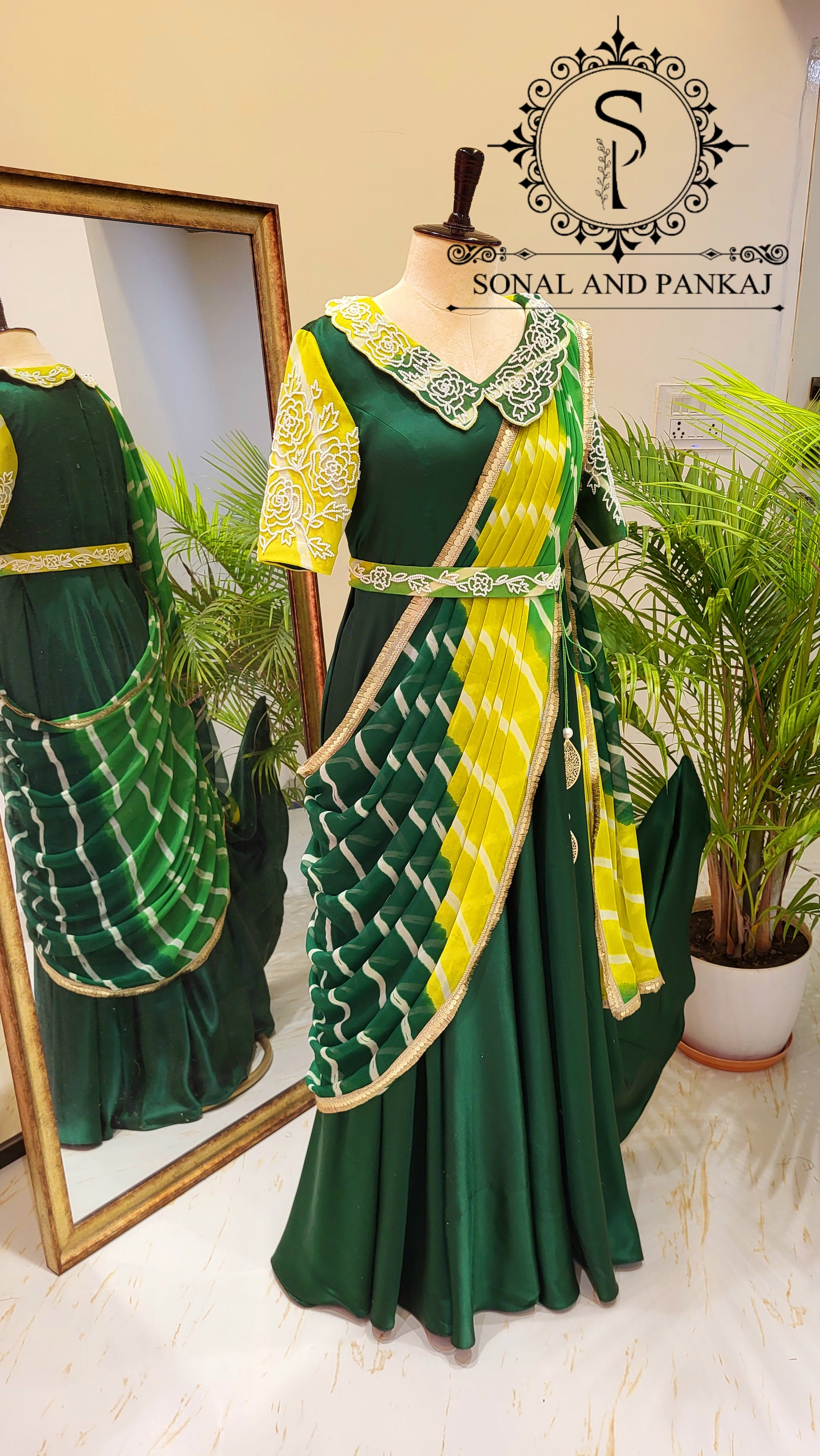 Bottle Green & Yellow Hand Embroidered Ready To Wear Gown Saree - SA01499