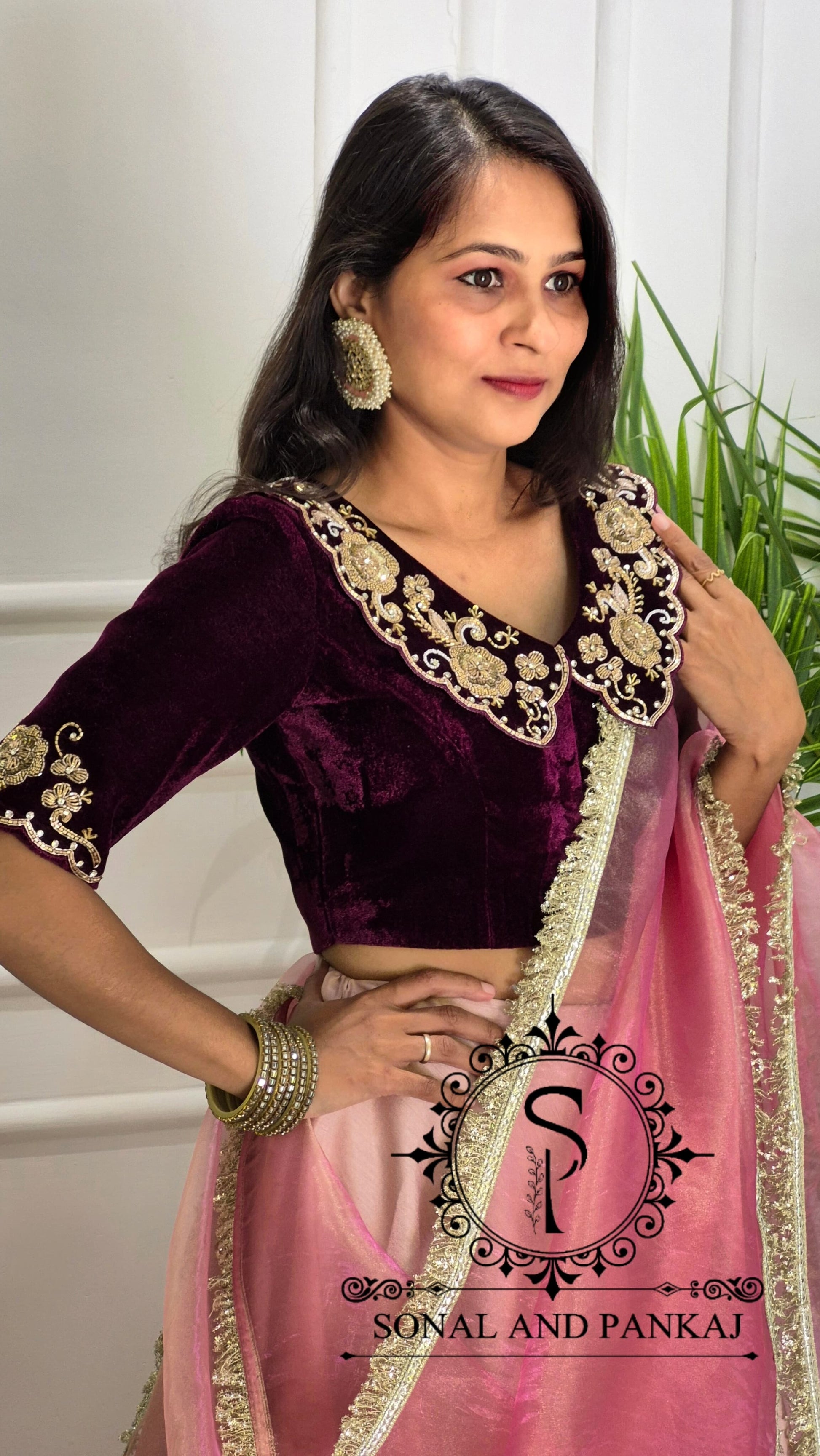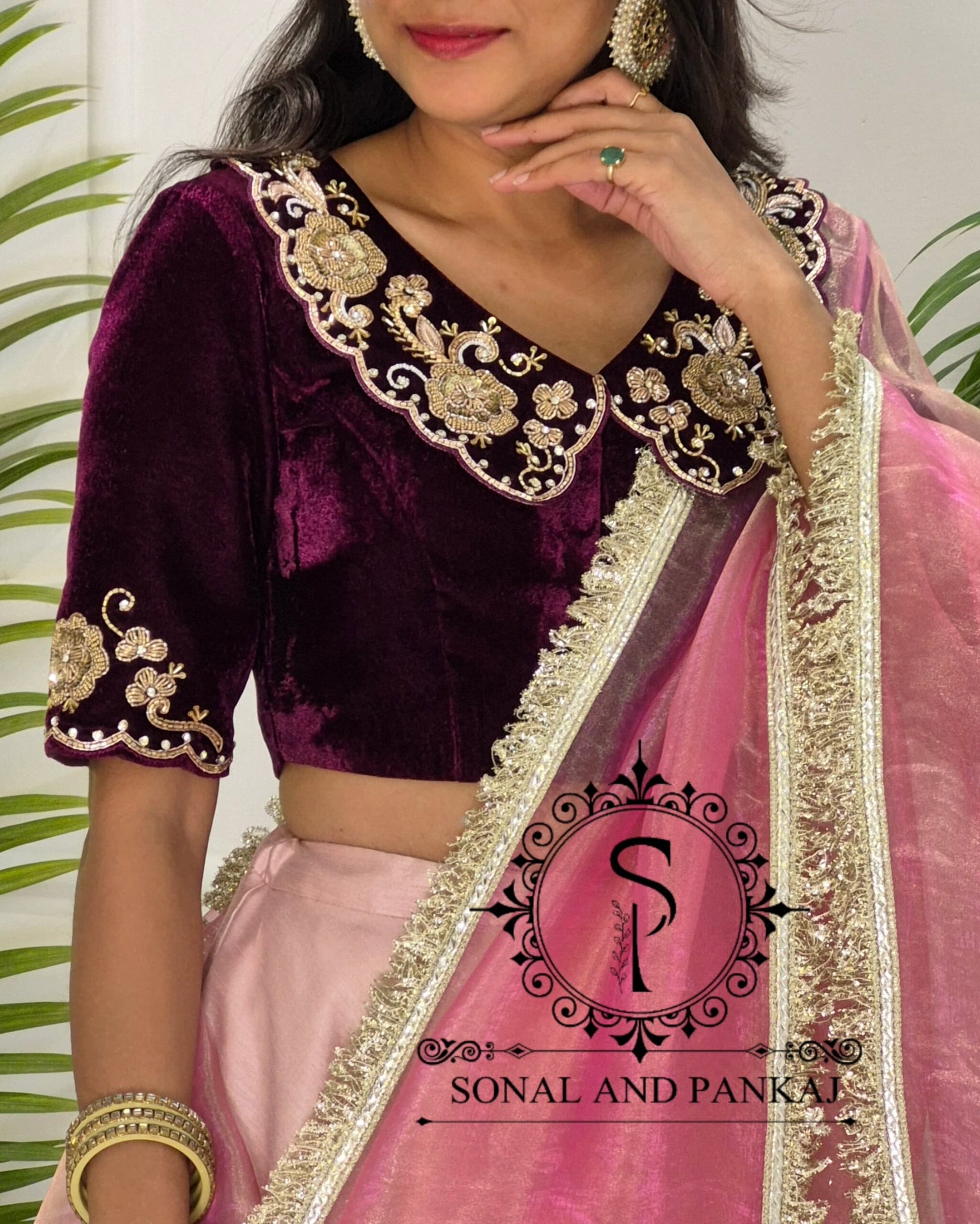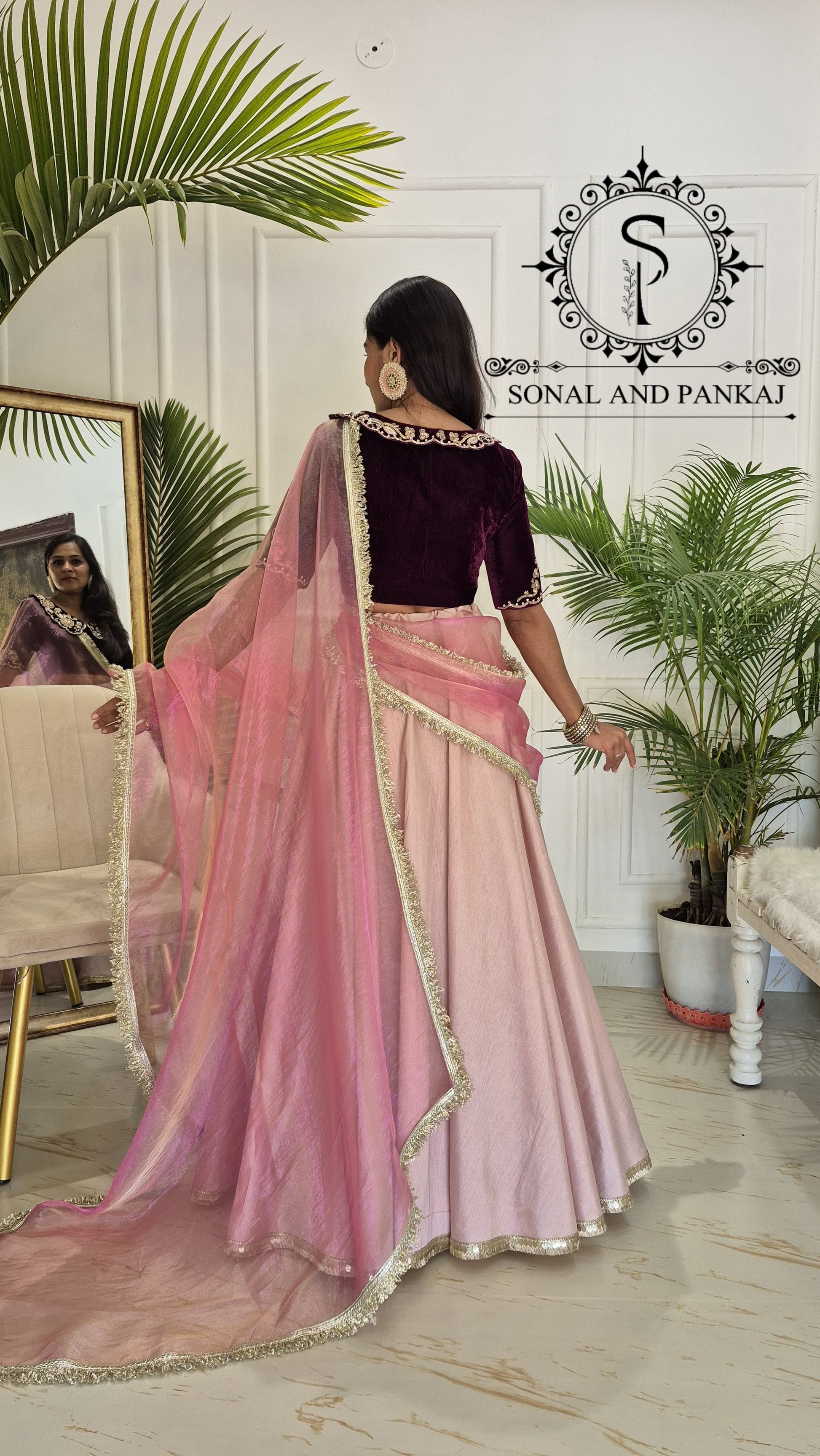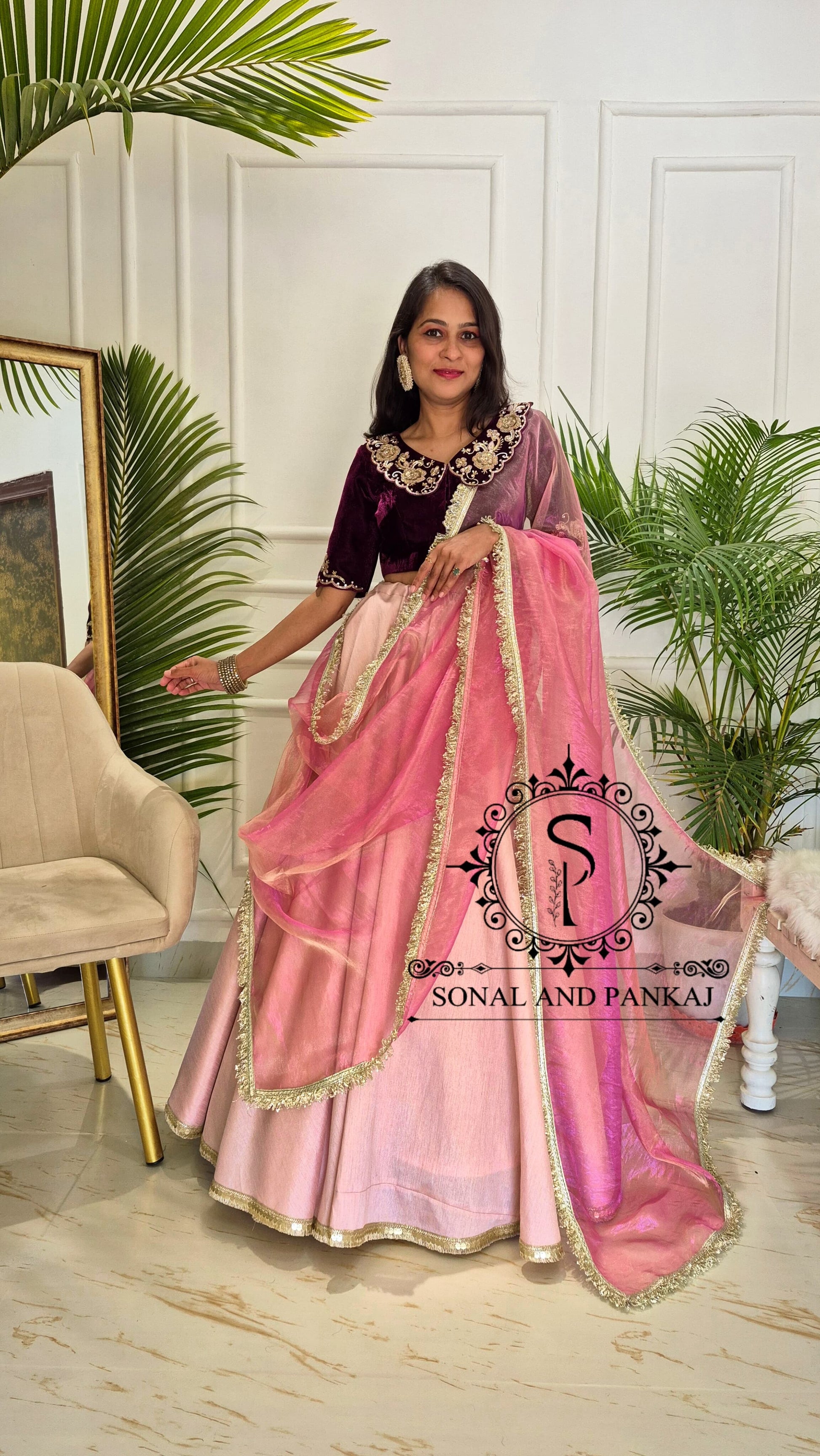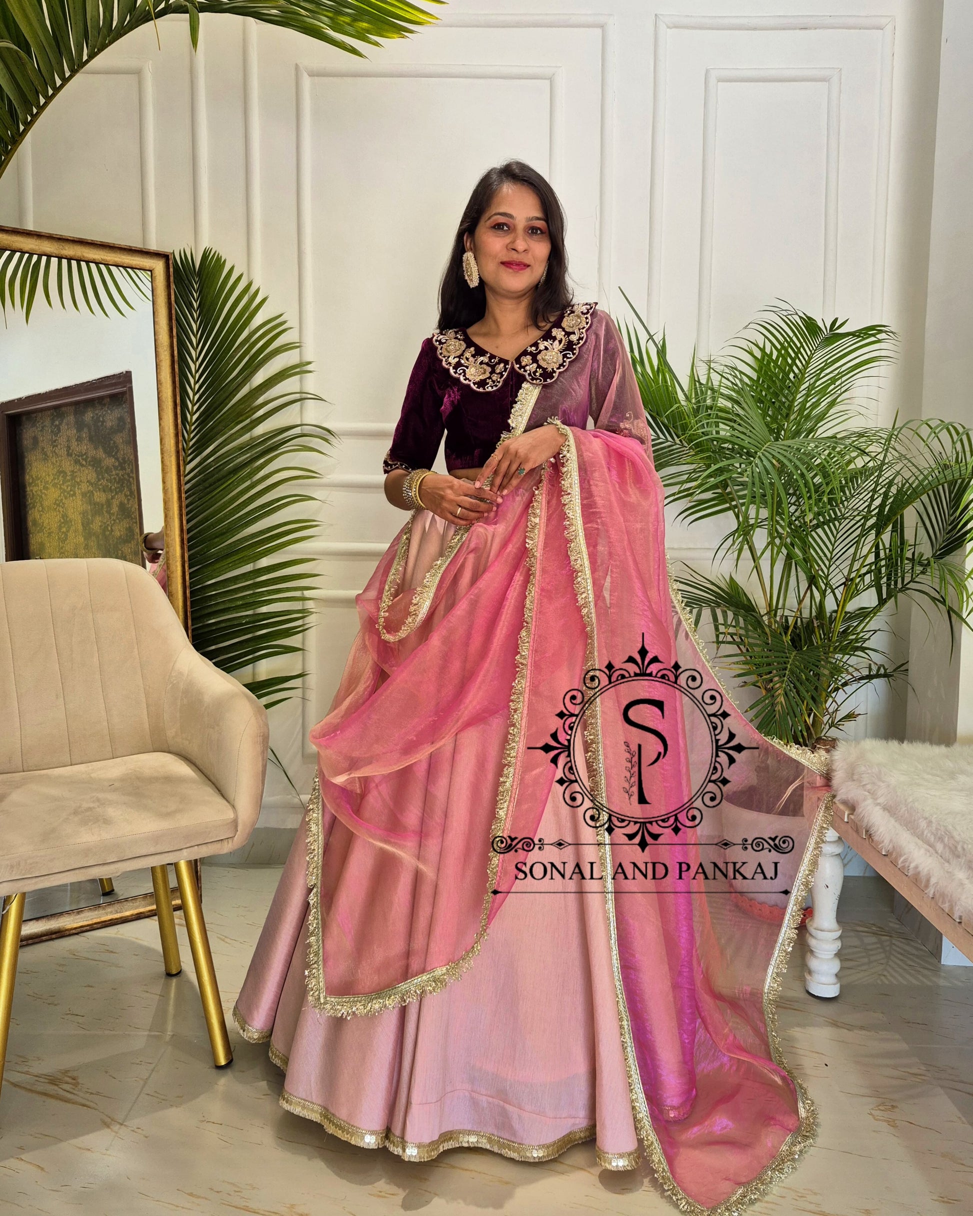 Fabrics: Velvet blouse, raw silk lehenga & dual tone glass tissue dupptta.