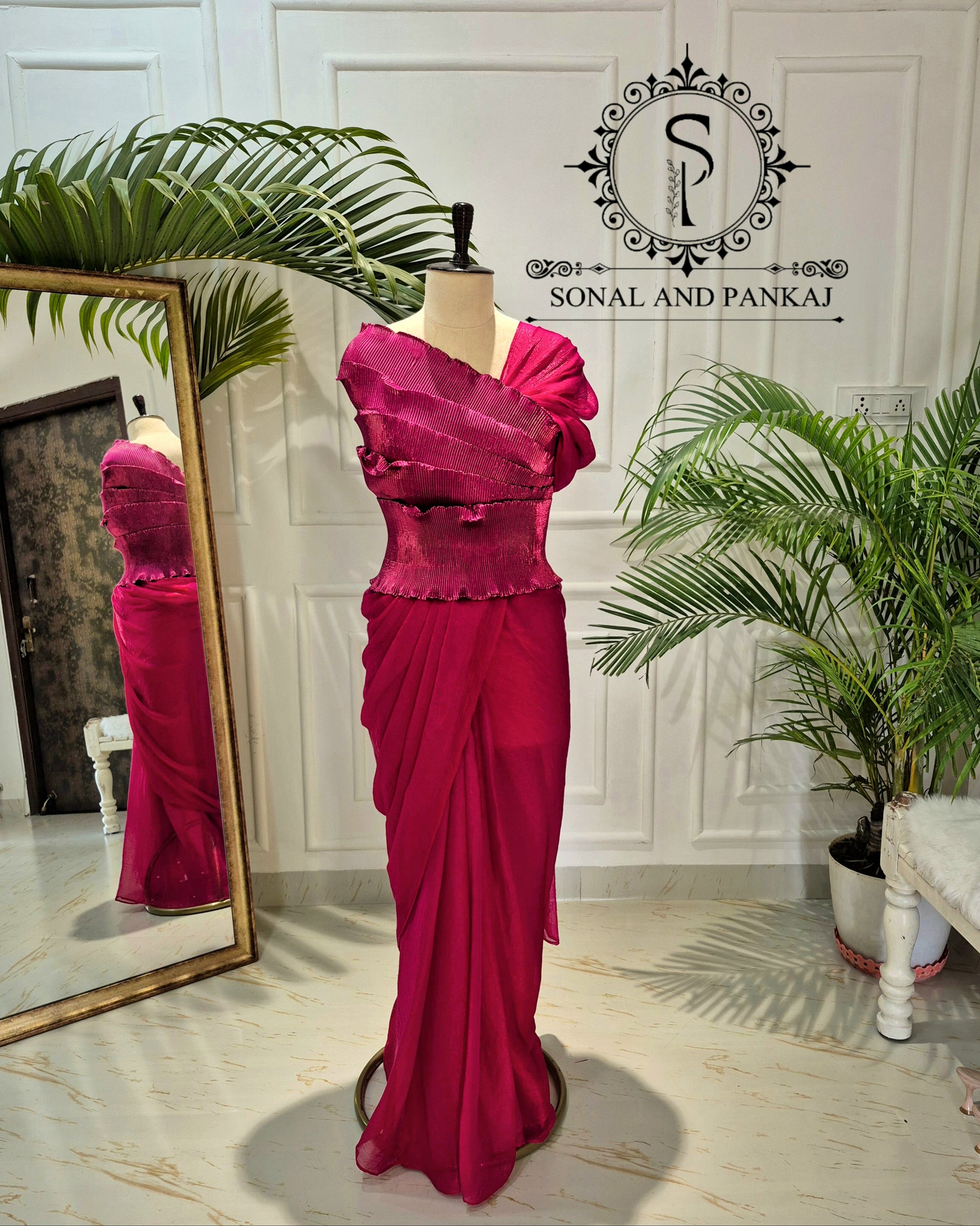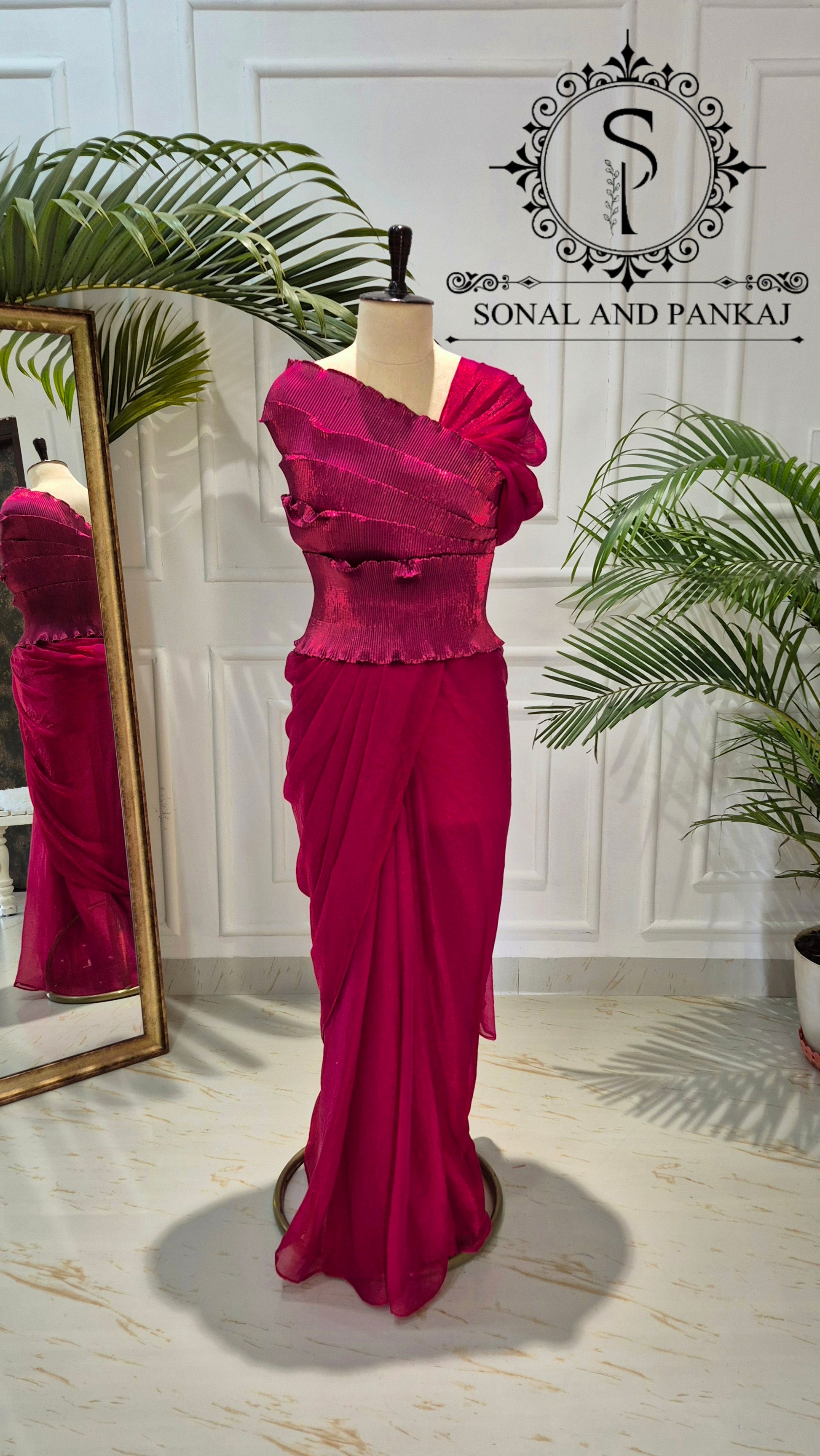 Description: Cherry pink stretchable top & fendy chiffon ready to drape pre-pleated saree.