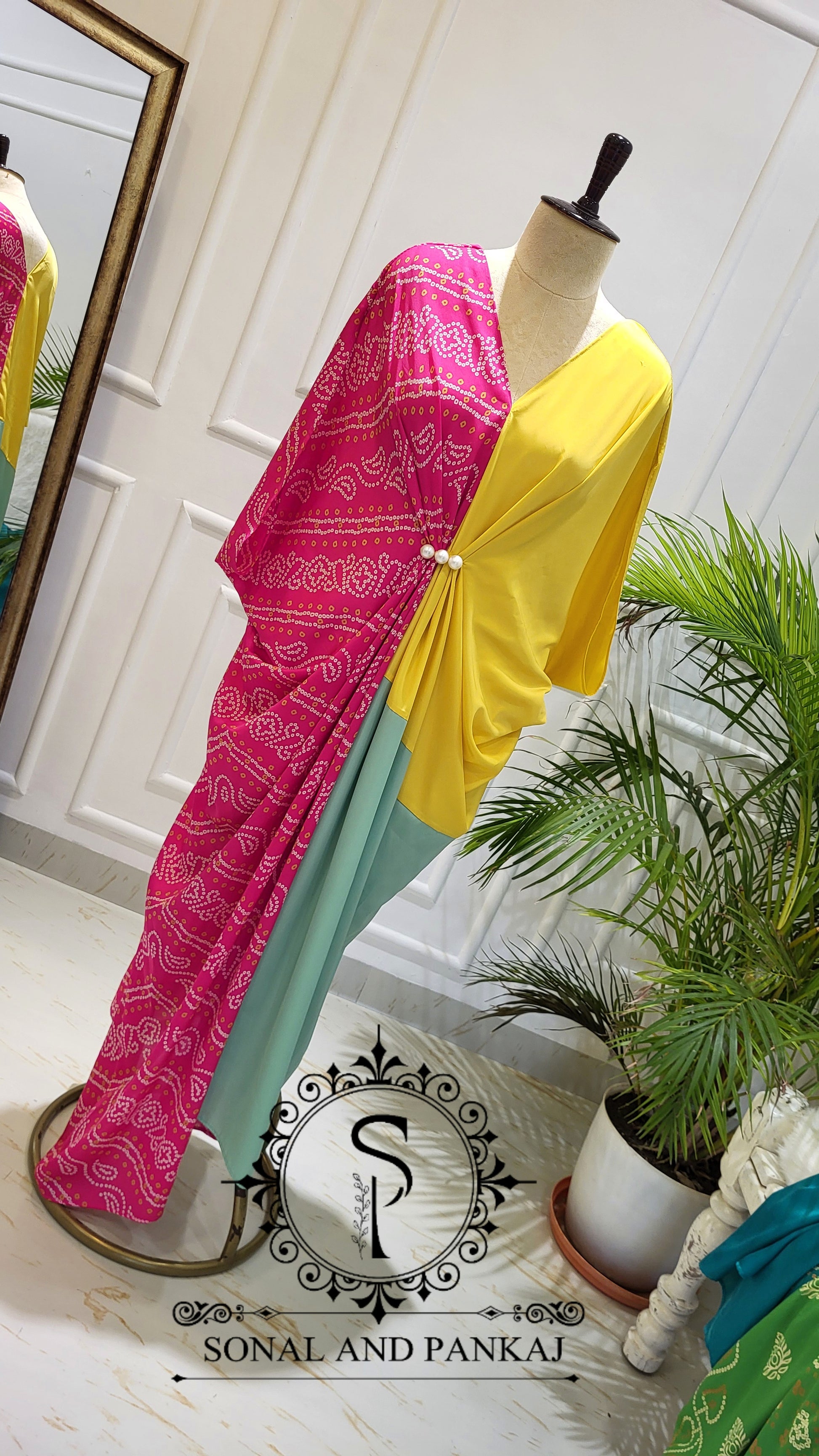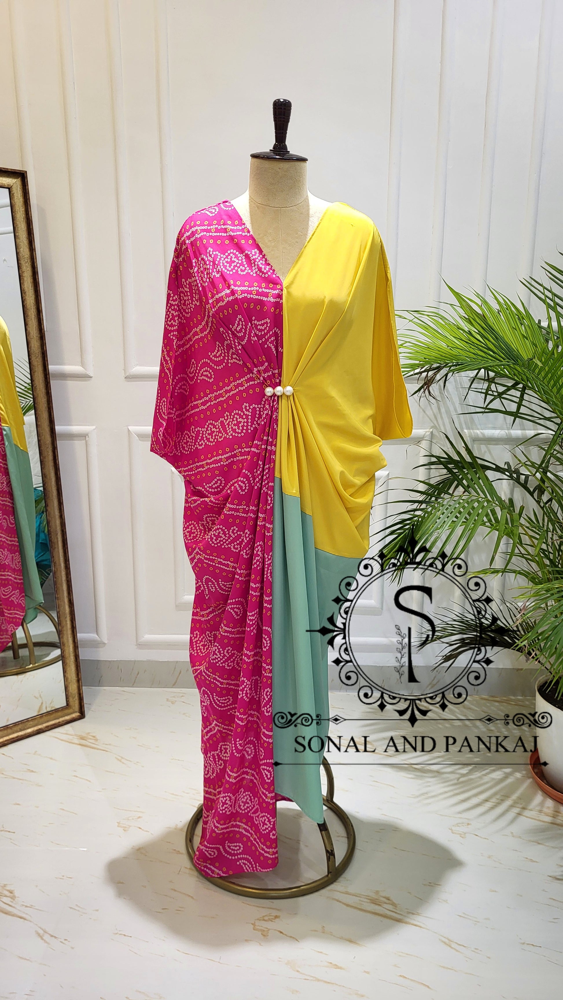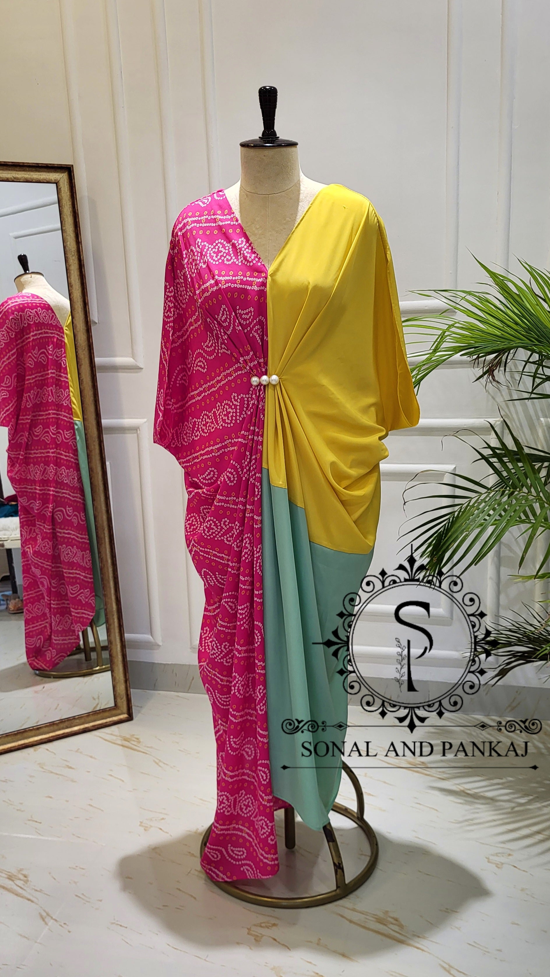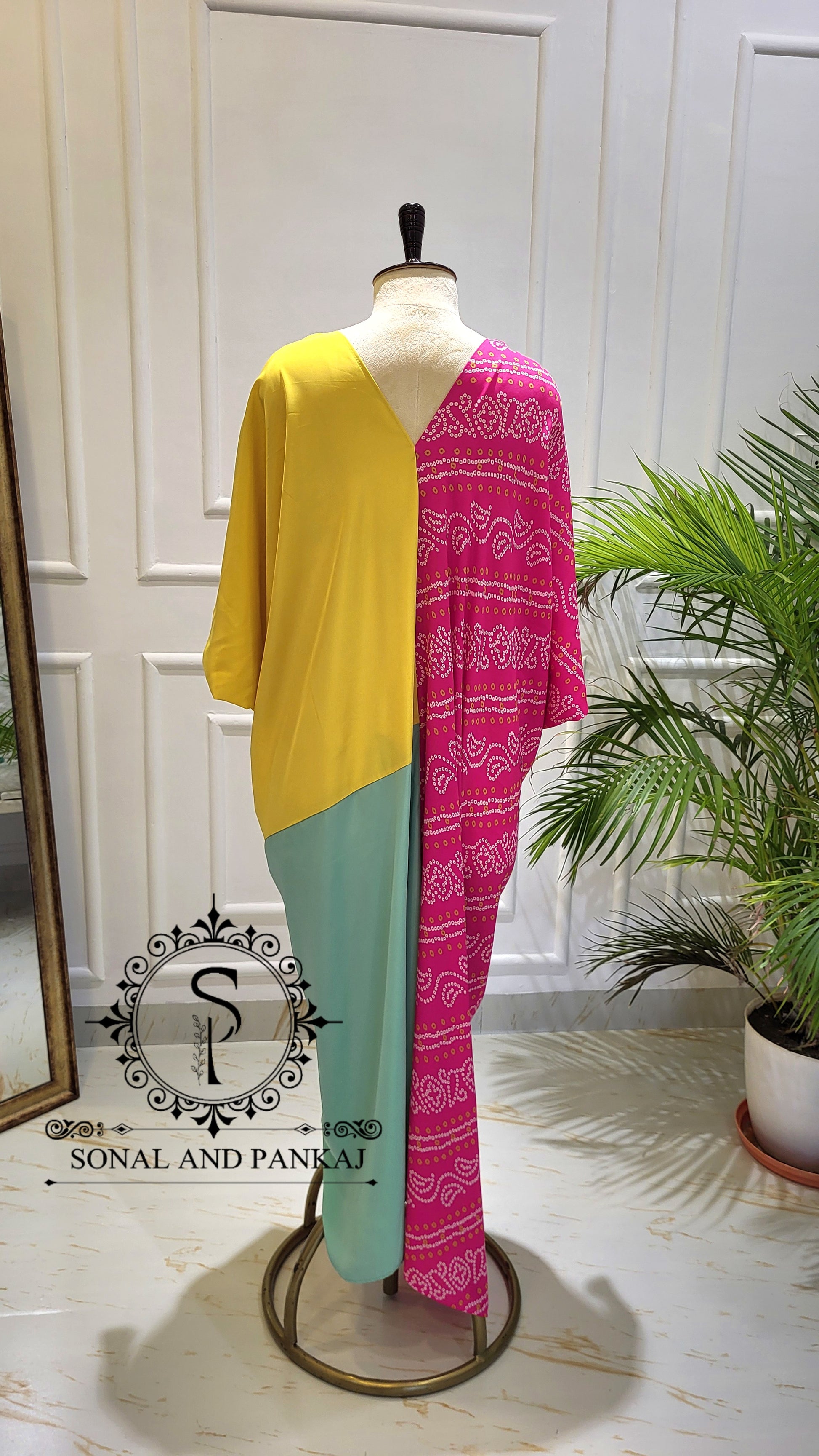 Designer Color Block Bandhani Kaftan - RW01509 (Pink & Yellow)