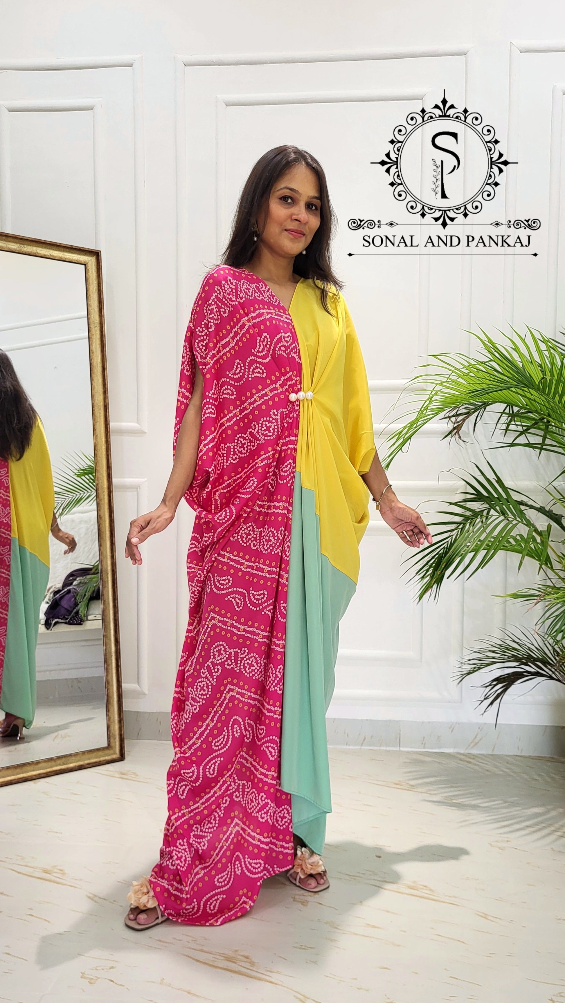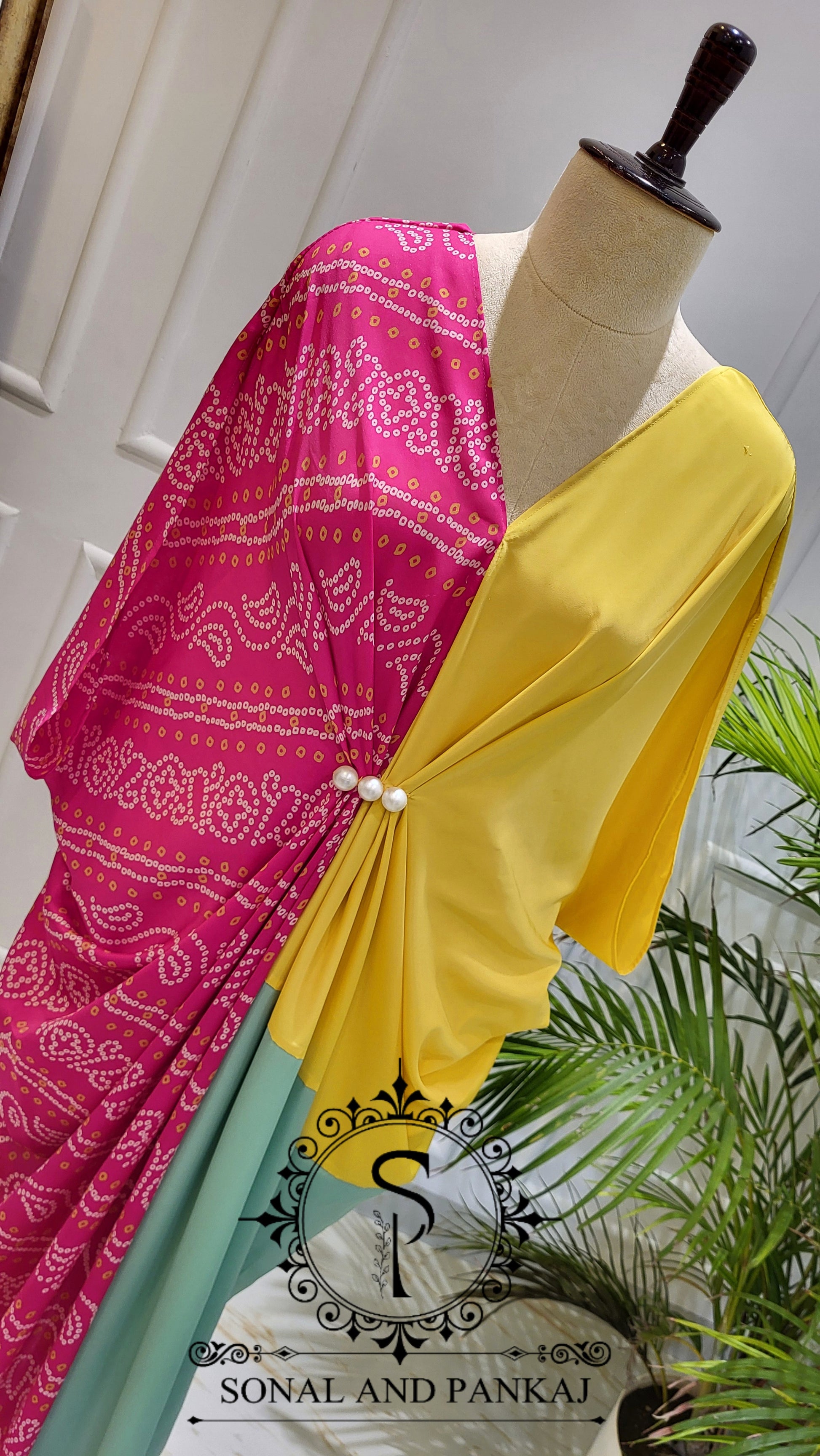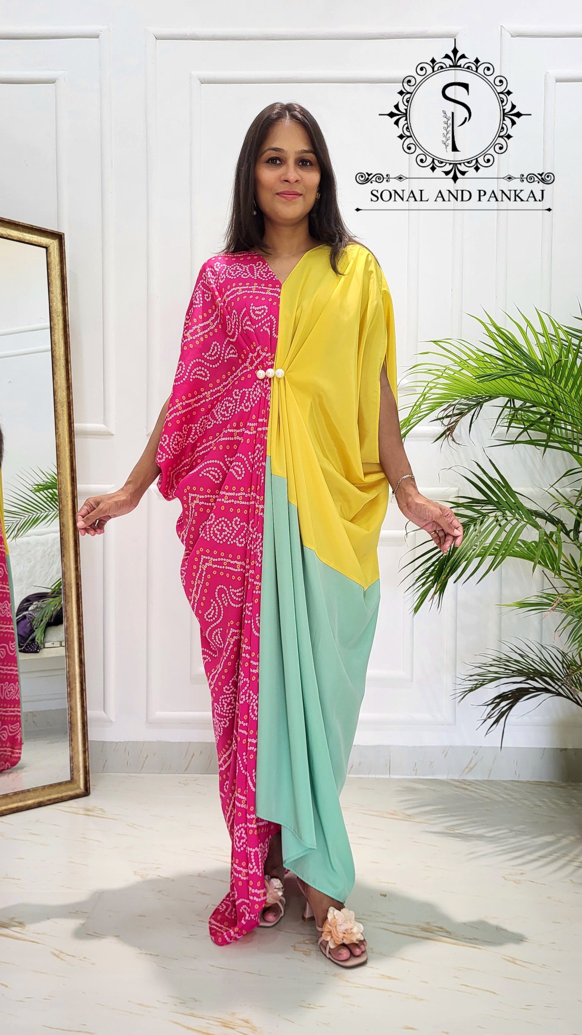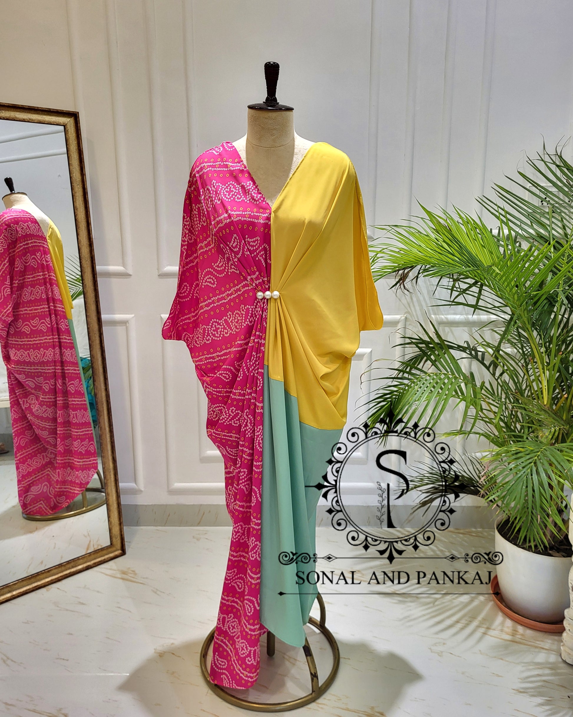 Designer Color Block Bandhani Kaftan - RW01509 (Pink & Yellow)