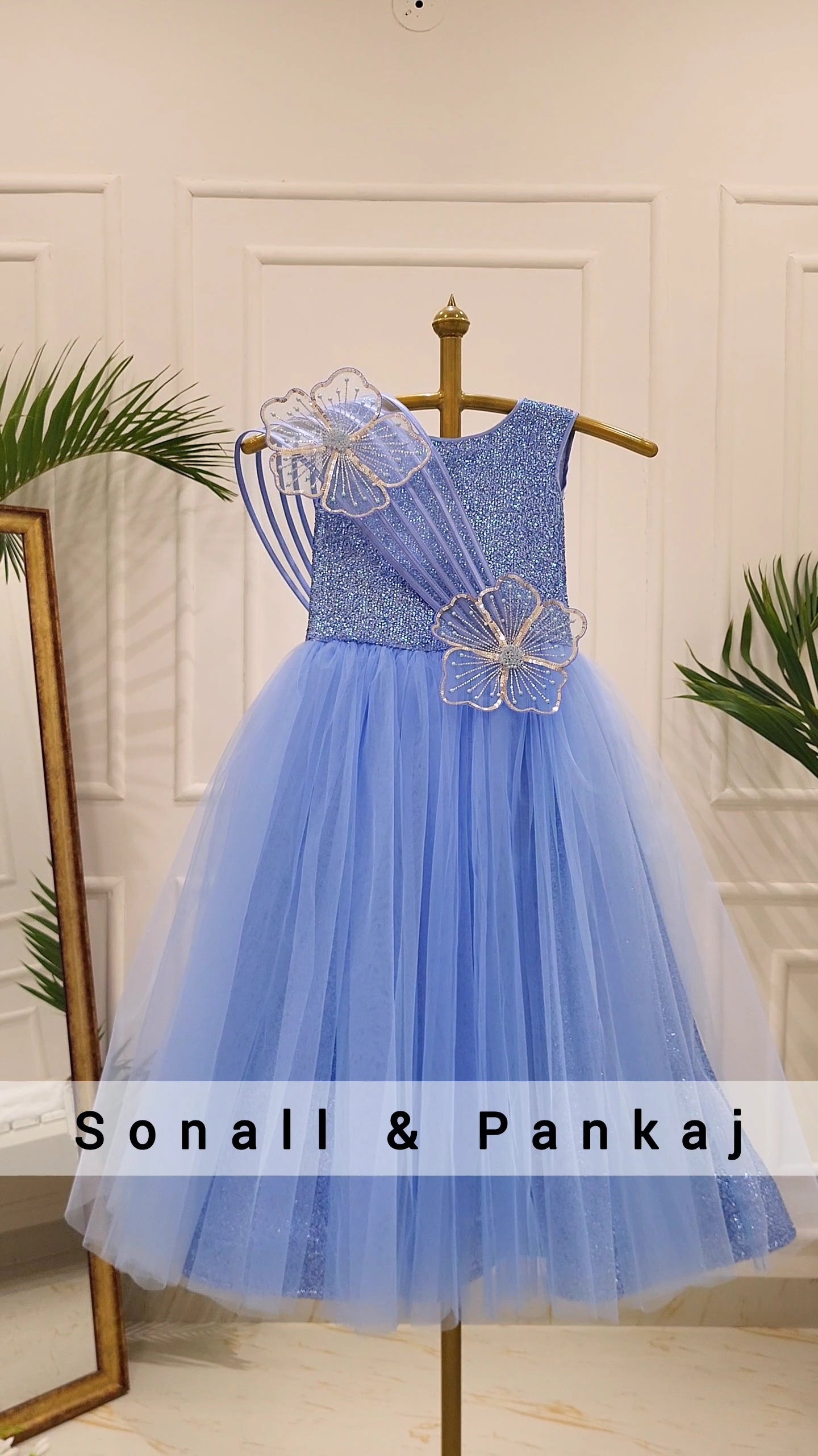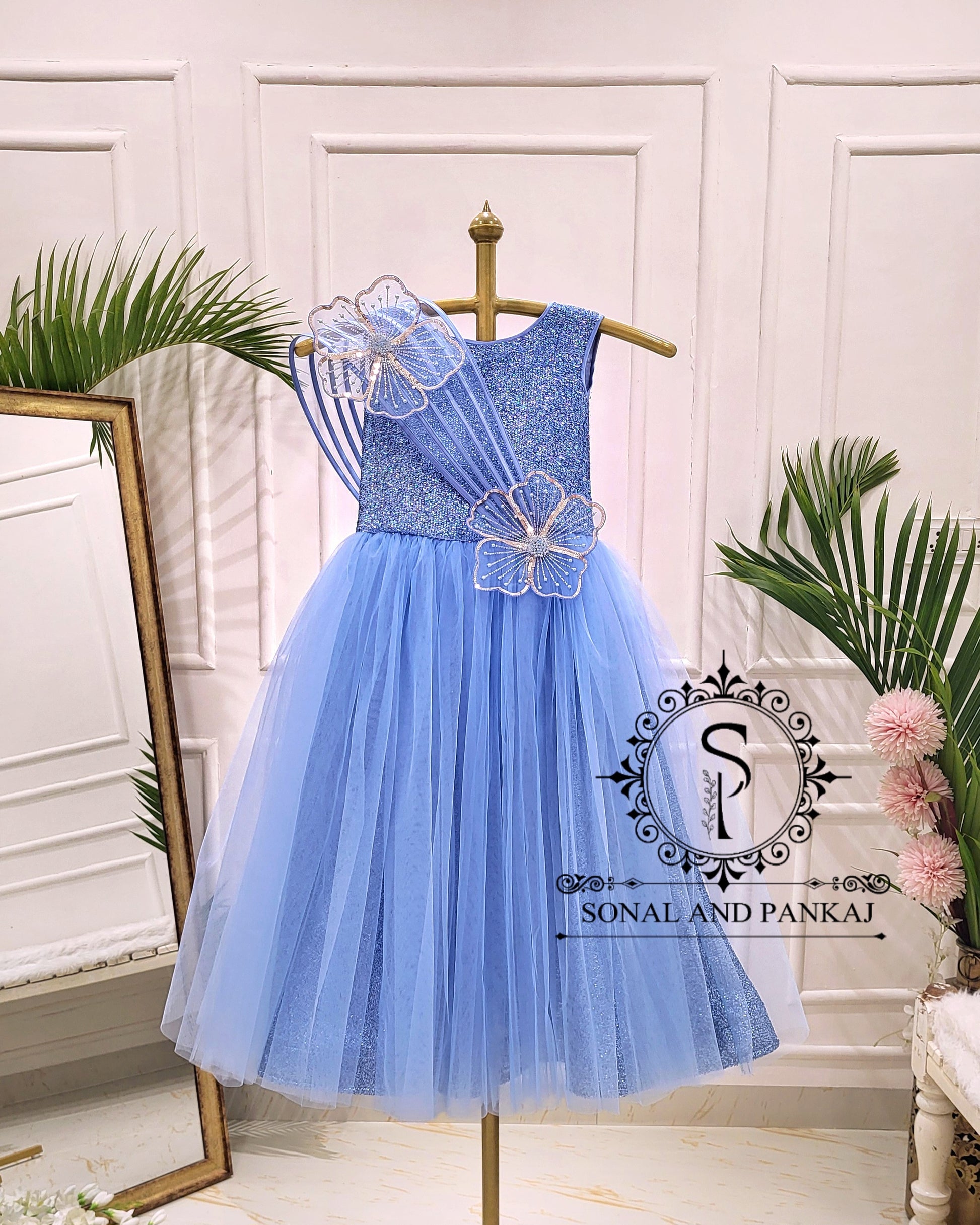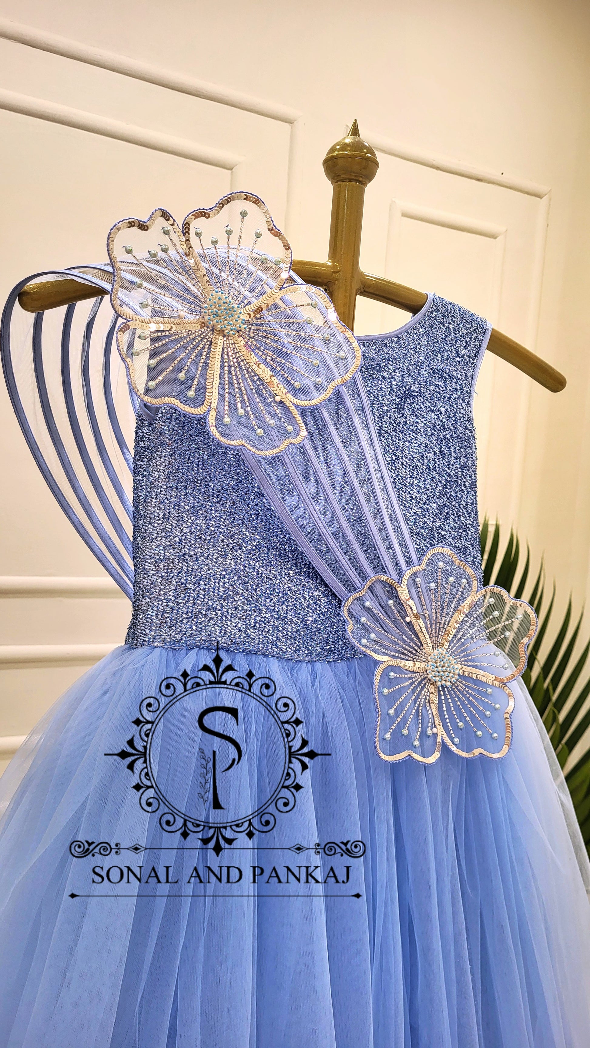 Designed to turn special occasions into storybook moments, the ice blue floral blossom gown blends whimsical charm with refined detailing. Let your child shine in a creation where artistry and imagination come together.