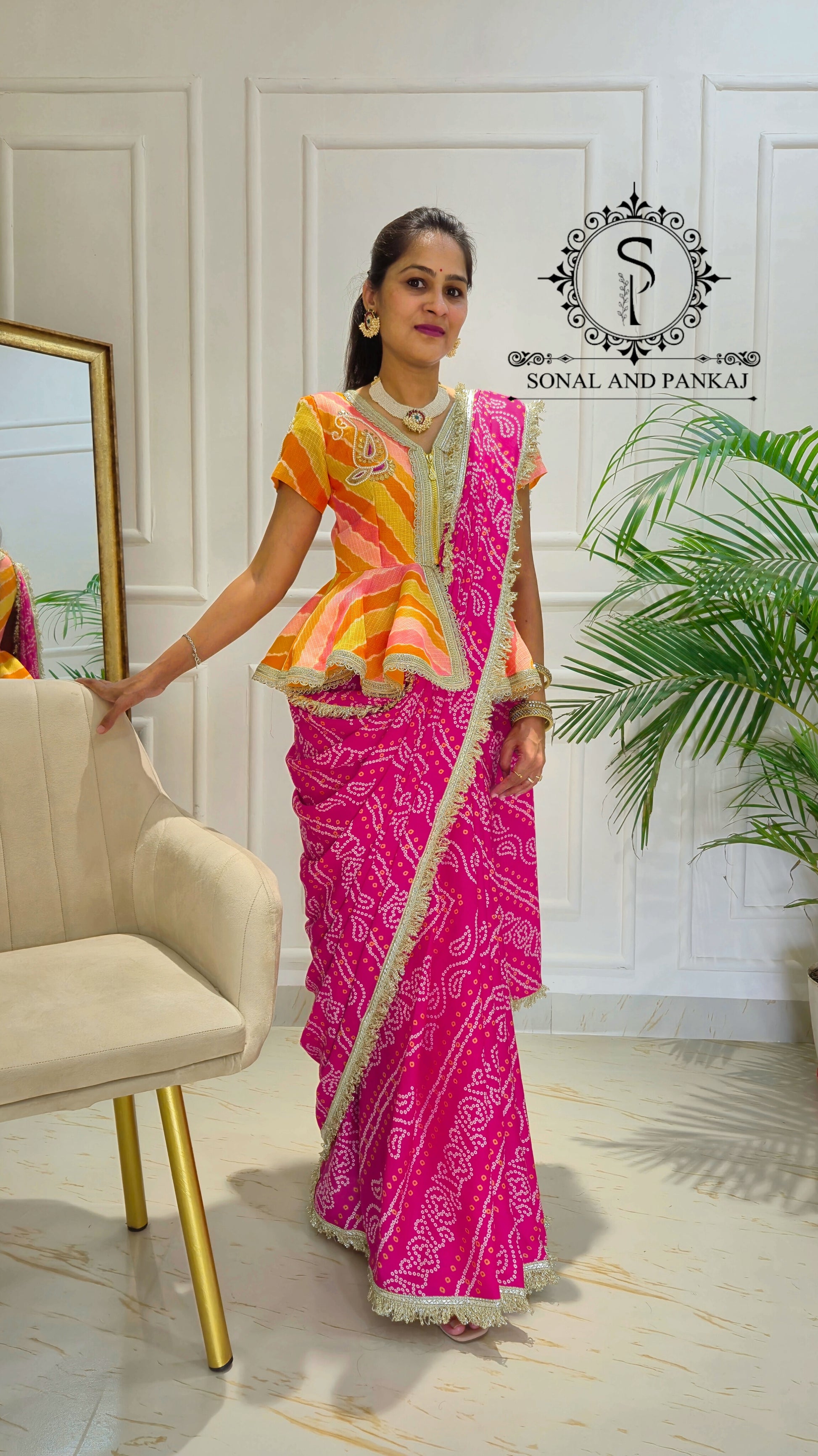 Gotta Patti Hand Embroidered Shaded Peplum Style Top & Pink Bandhani Print Saree.