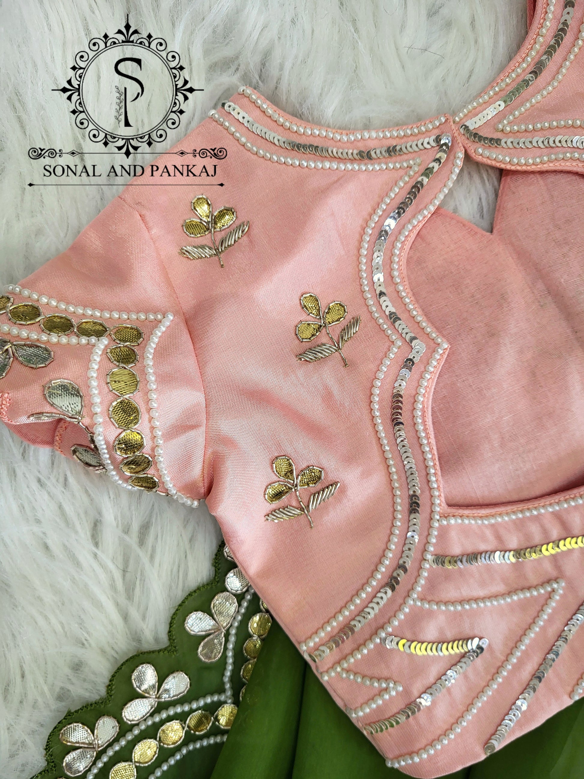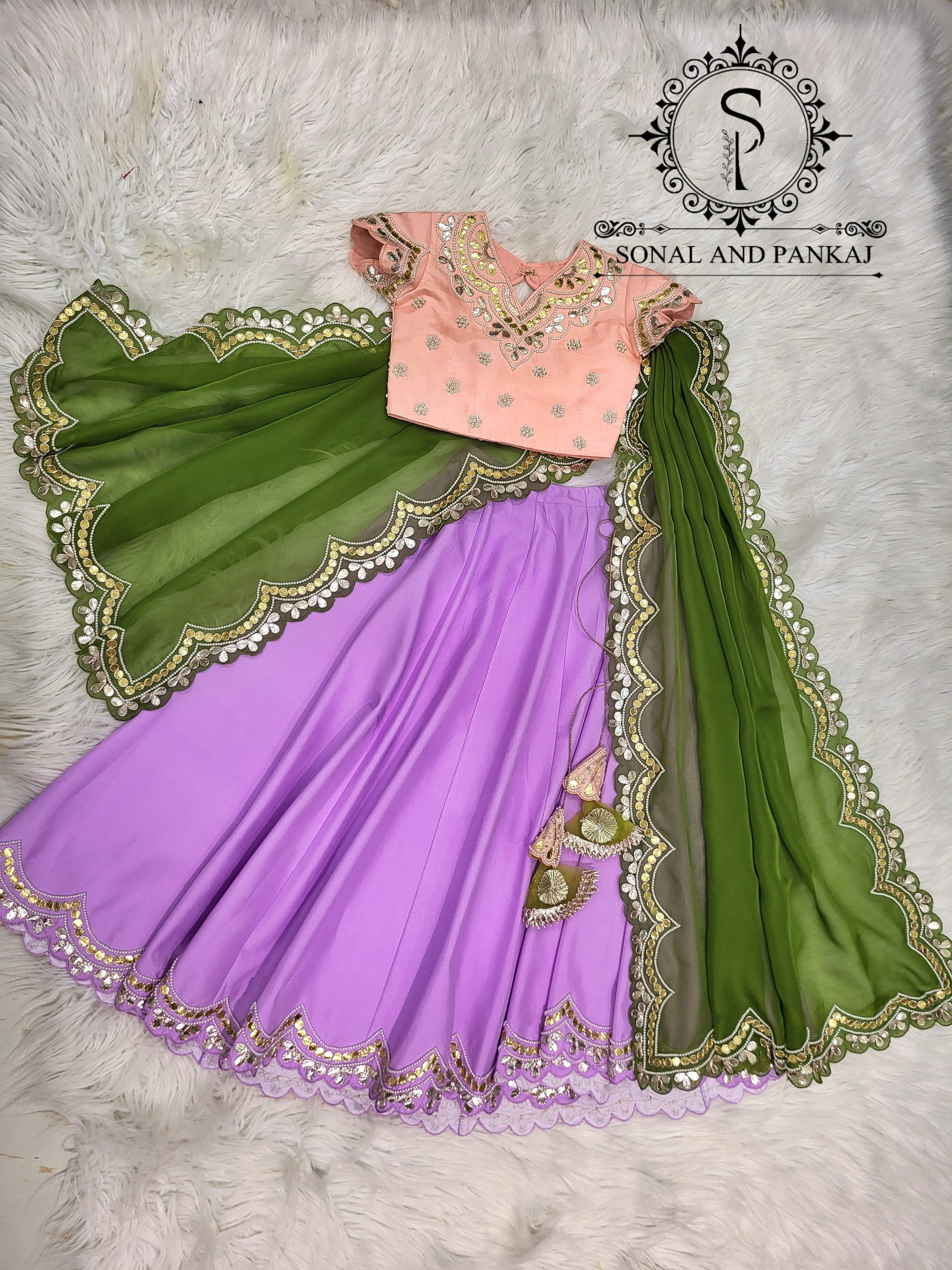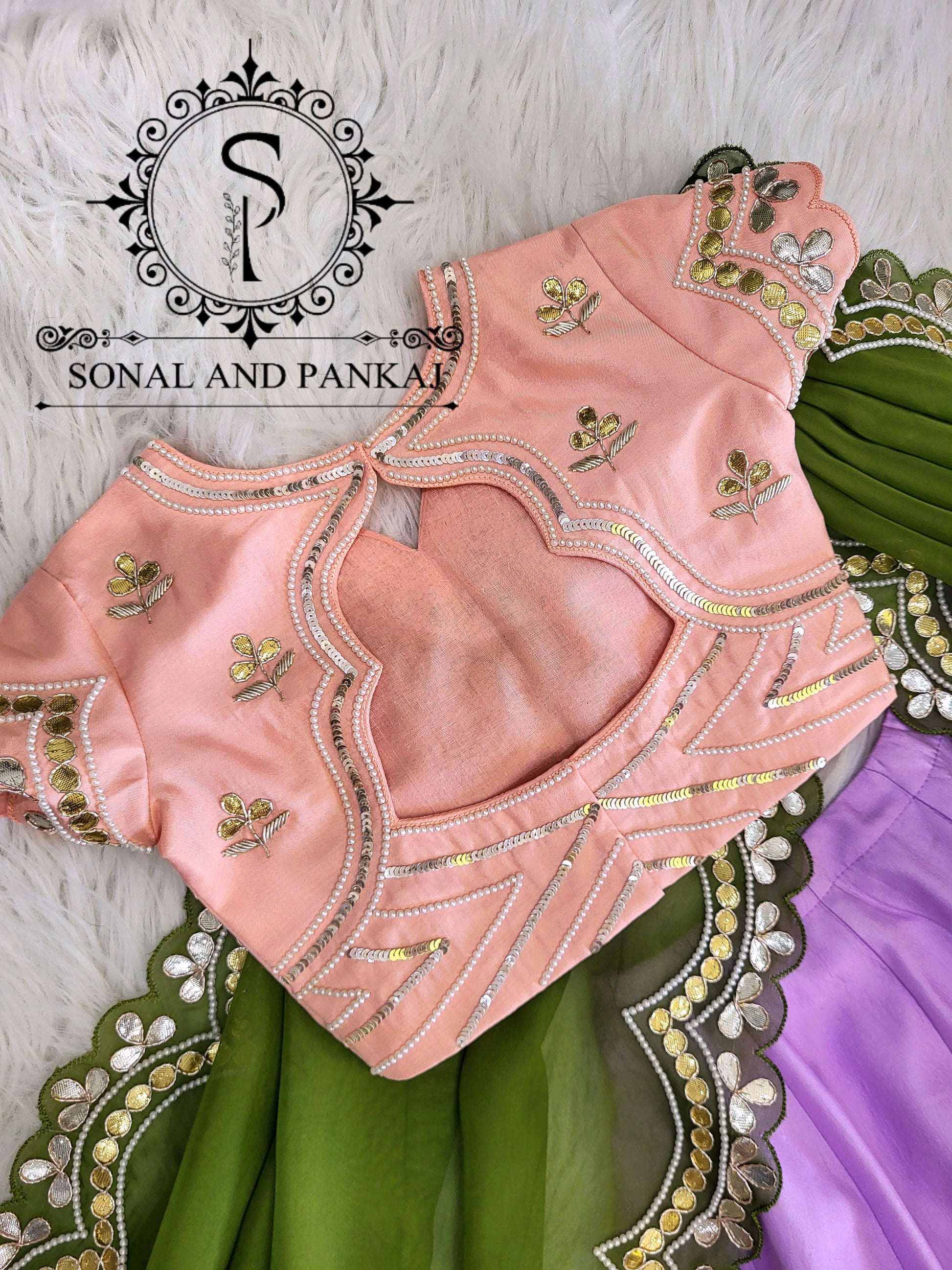 This dreamy lavender lehenga is like something out of a fairy tale! With pretty cutwork scallop borders that sparkle and swirl, it’s perfect for twirling at weddings or festivals and feeling super special. The outfit comes with a shiny peach blouse that looks like a soft sunset, and a magical olive green dupatta made from organza fabric, decorated with golden stars like gotta patti, pearl and sequins. It’s a celebration outfit that makes every little girl feel like royalty - ready to dance, smile, and shine like a star!
