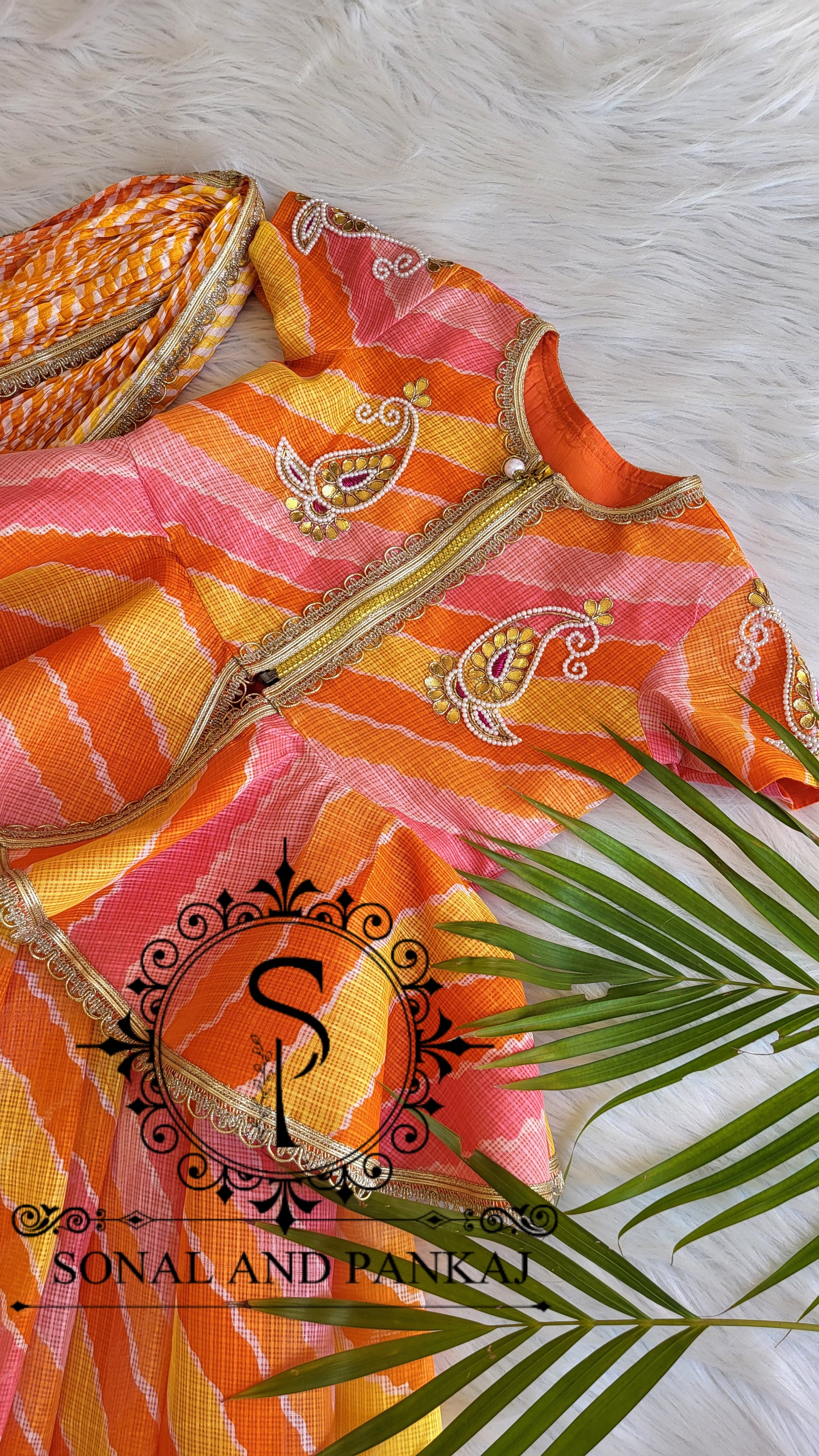 Introducing our exquisite Kids Lehenga Choli, adorned with crushed Dupatta in our signature Leheriya Print and intricate Gotta Patii work. Crafted from comfortable fabrics and showcasing a vibrant color palette, this stunning outfit is sure to delight your little princess. A must-have in every young girl's wardrobe, our designs beautifully connect your child to India's rich heritage through traditional fabrics, motifs, and handwork. Rooted in Rajasthan's cultural legacy, our creations promise to pass on the essence of Indian tradition to the next generation.