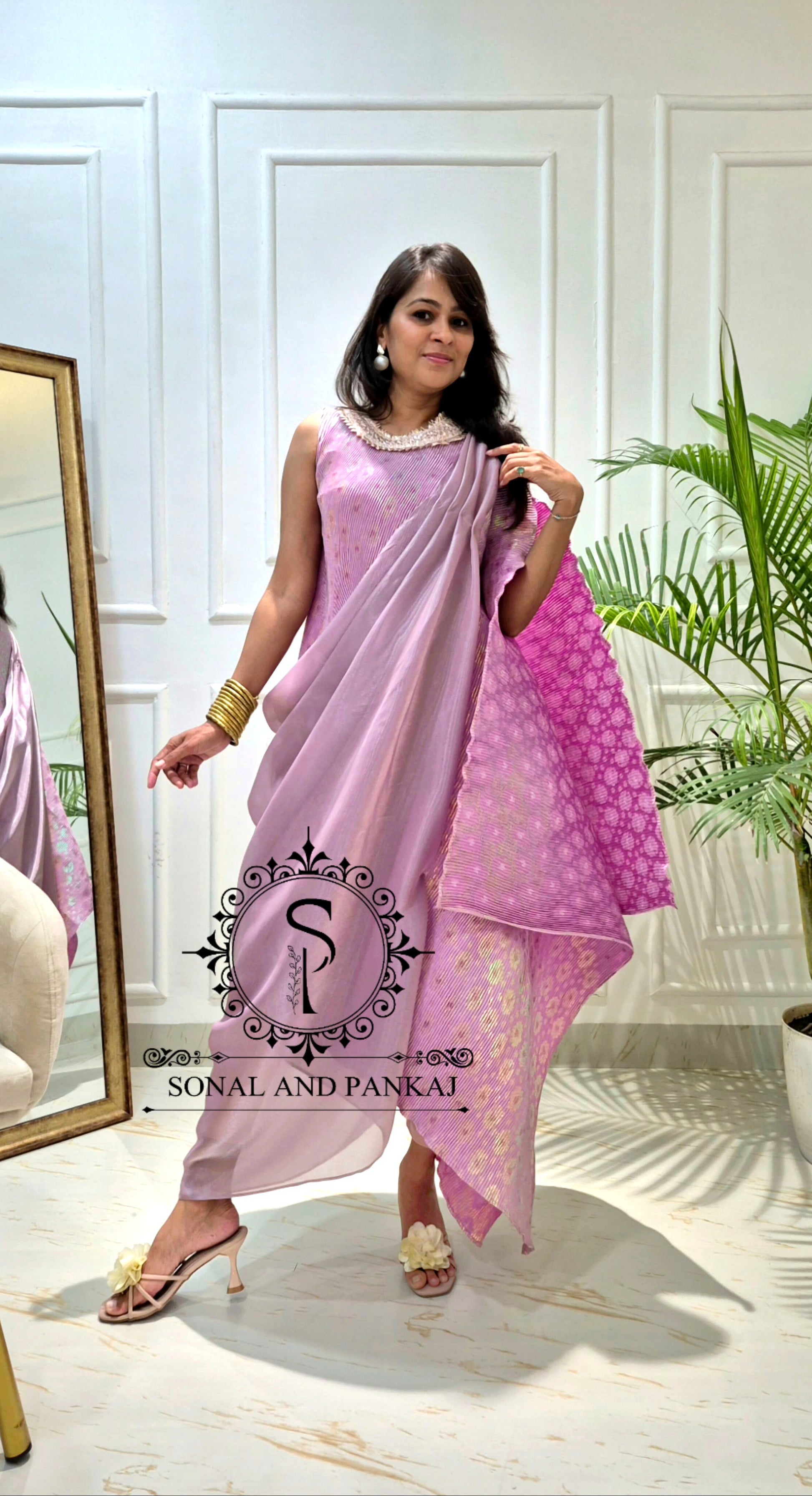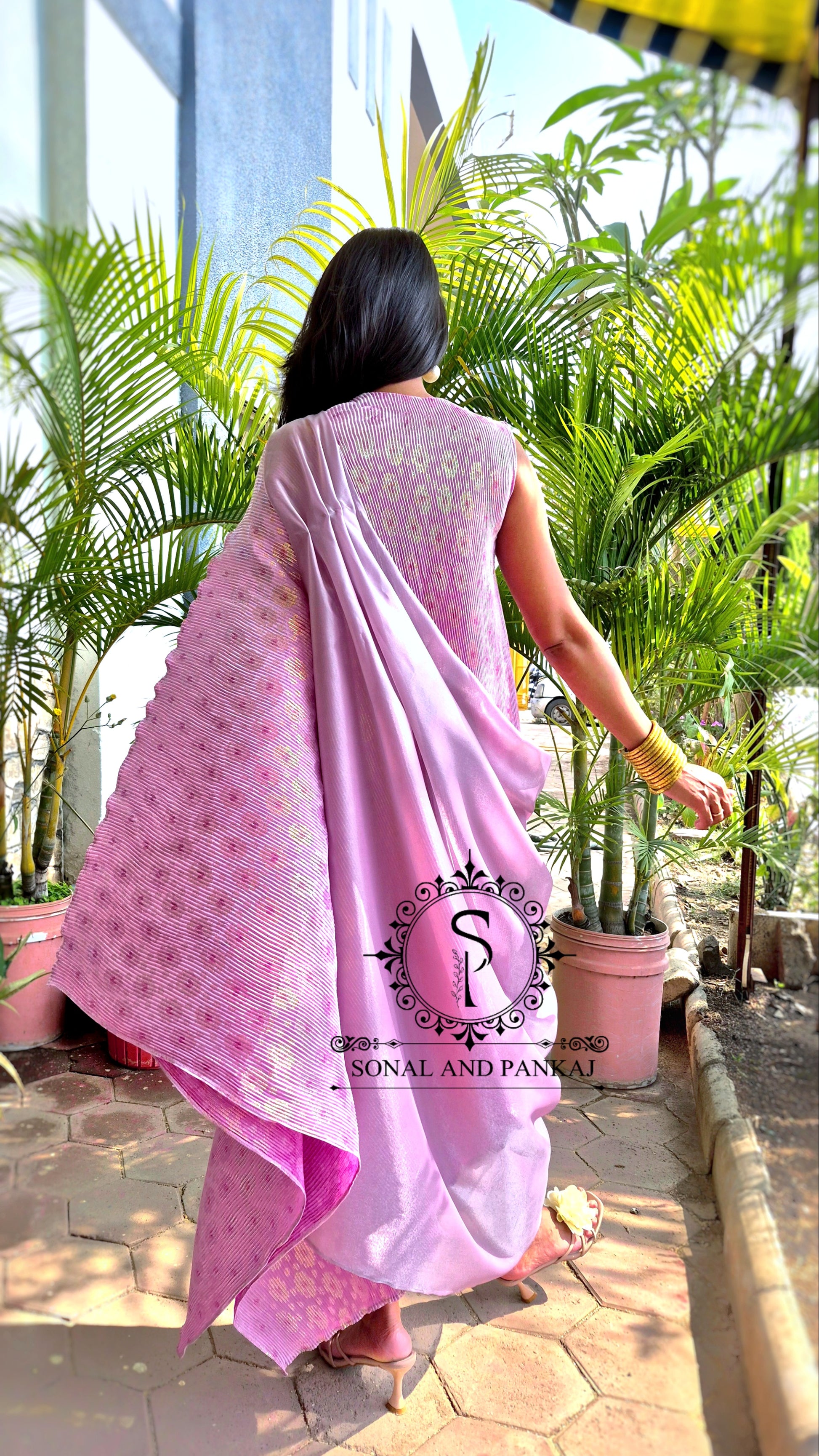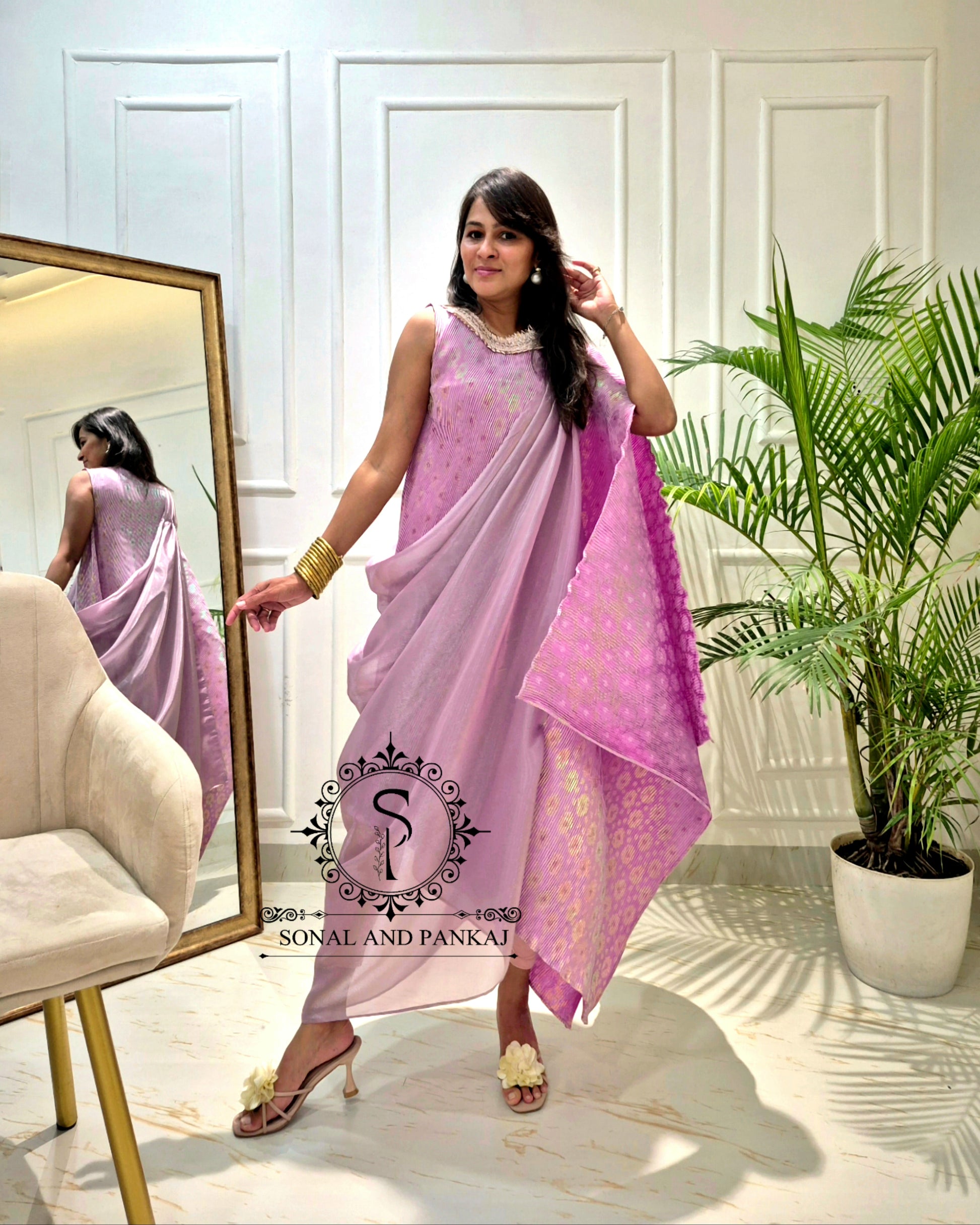 Lusty Lavender Metallic Pleated Resort Wear Kaftan With Cowl Cape - RW01644