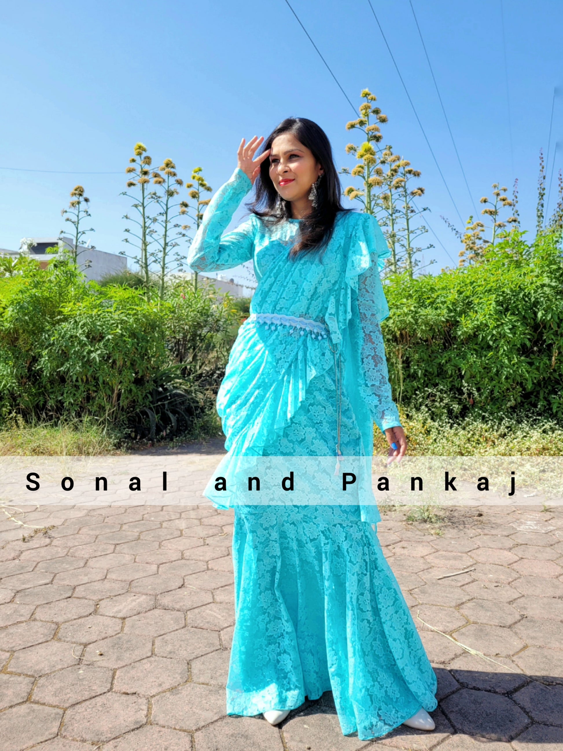 Description: In ethereal whispers of sky and turquoise hues, a ready-to-wear saree unfurls like a dream. Delicate floral lacy net dance upon the pallu and blouse.