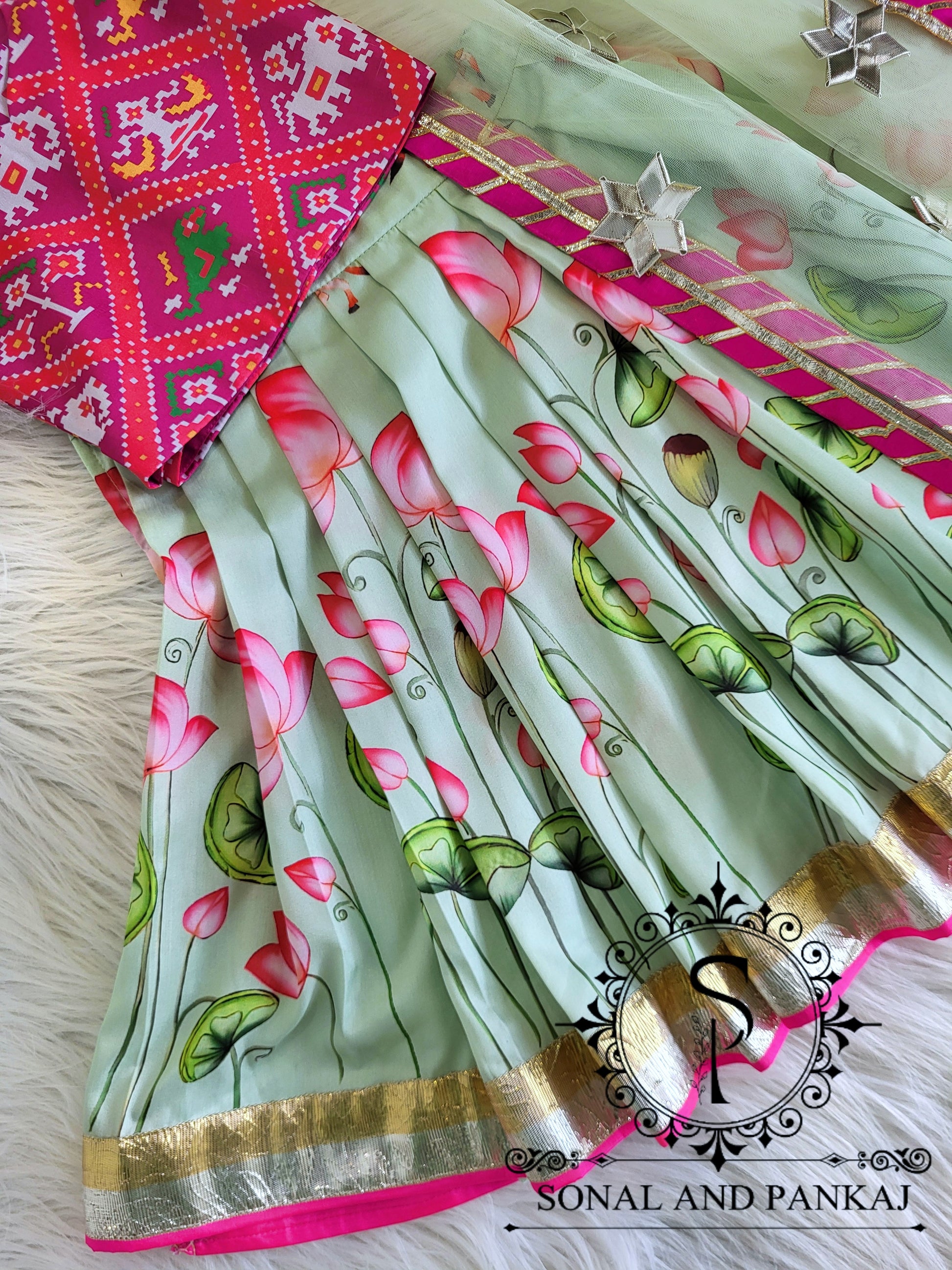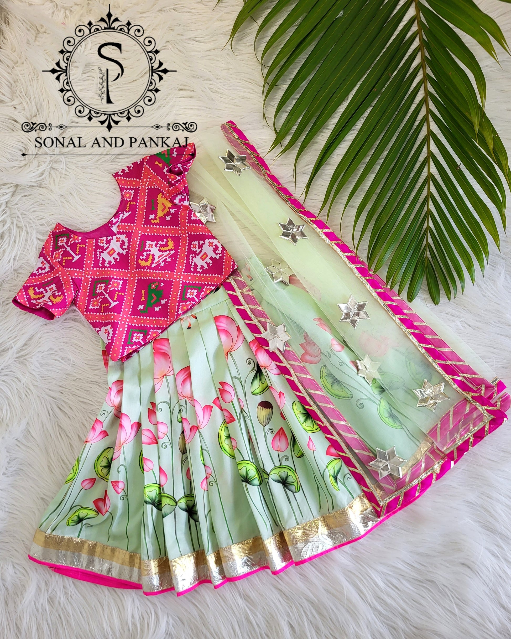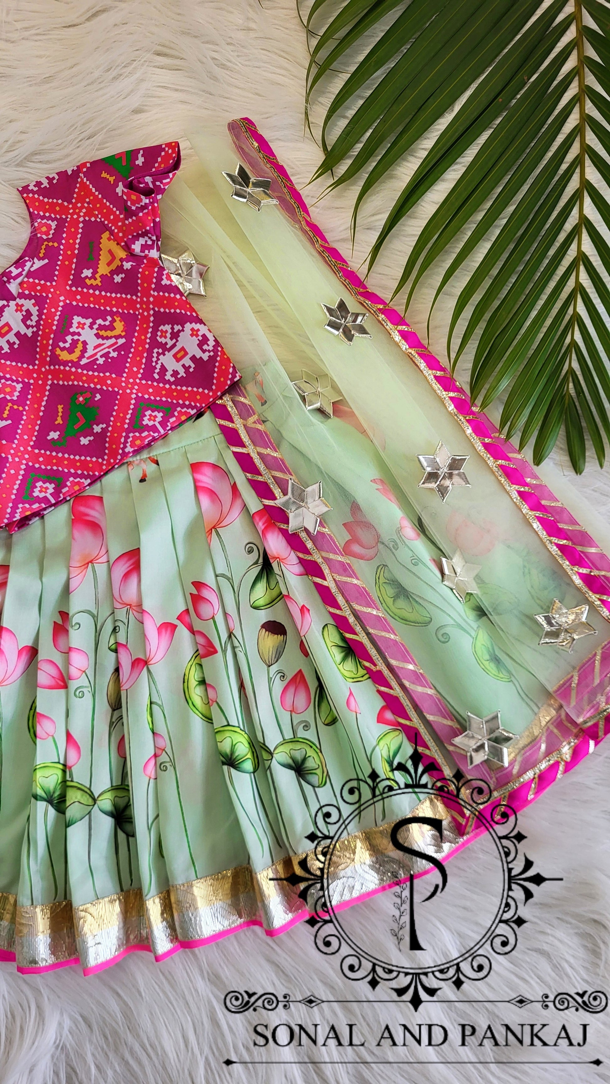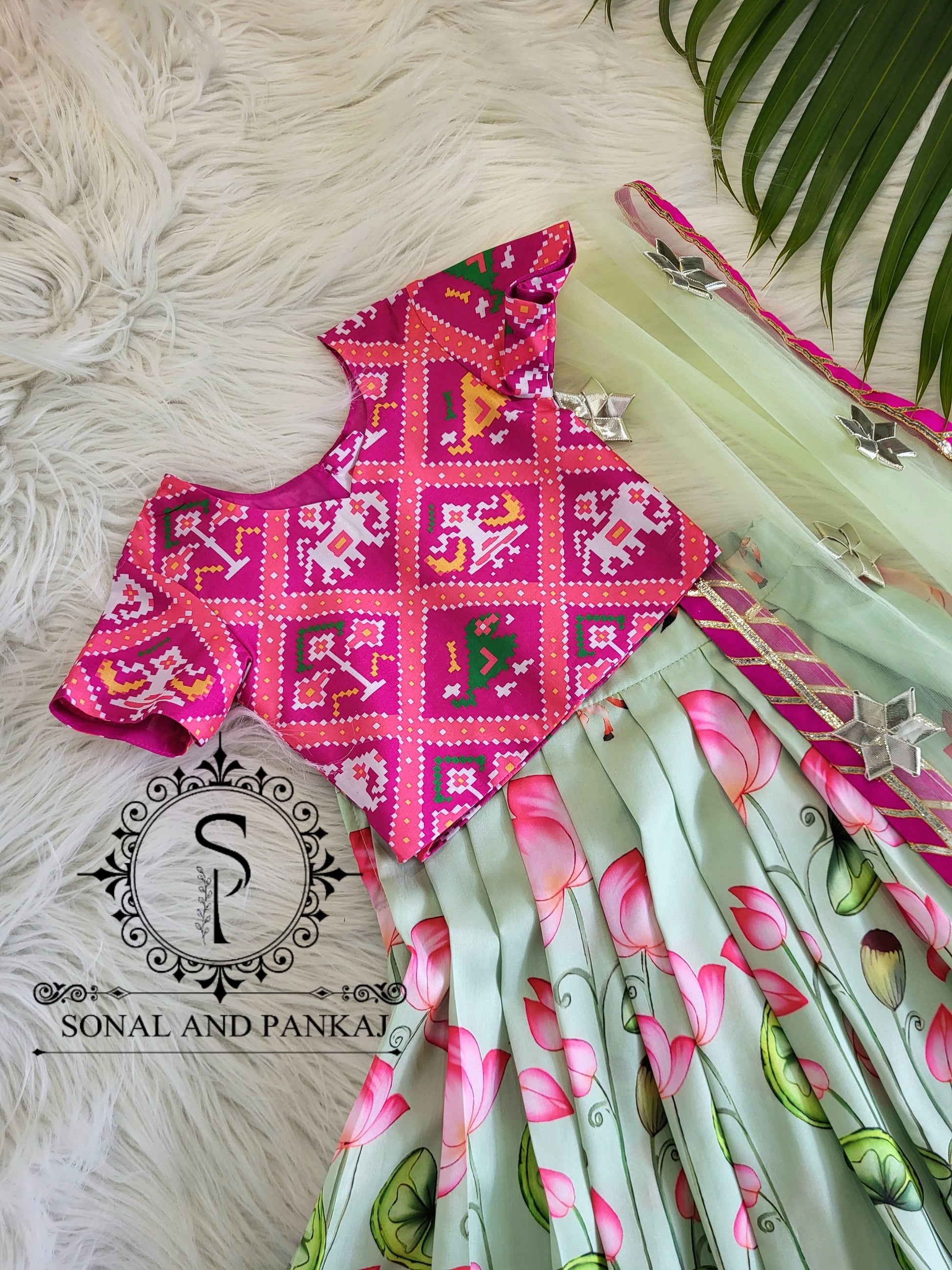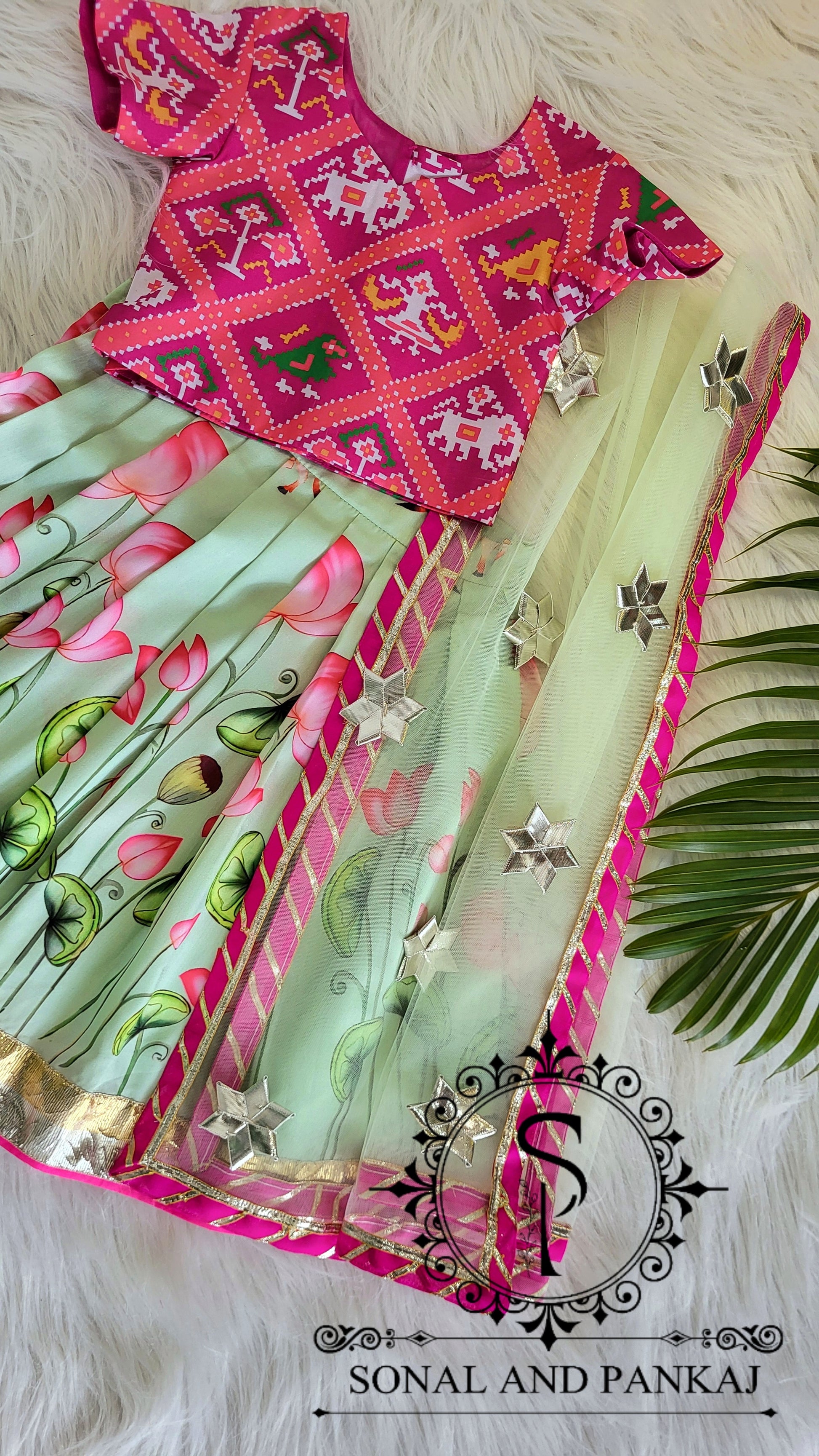 The outfit includes a matching pleated skirt, a patola print blouse, and a beautiful dupatta, perfect for twirling and dancing. Made with love and care, this outfit is a delightful blend of tradition and modernity, perfect for your little princess's special occasions.