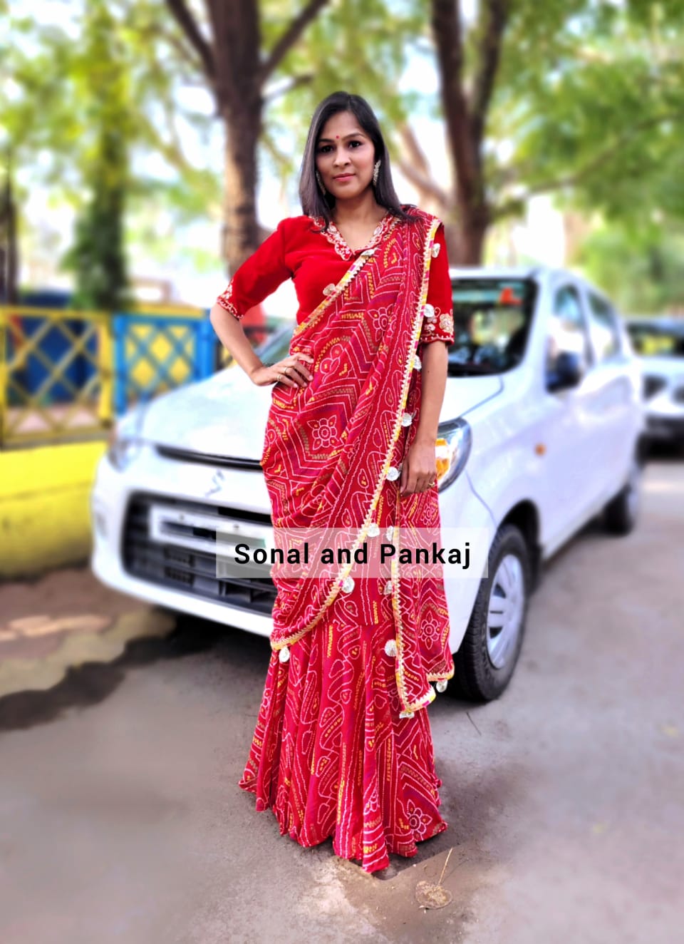 Description: Ready to wear bandhani print saree with hand embroidered velvet blouse.