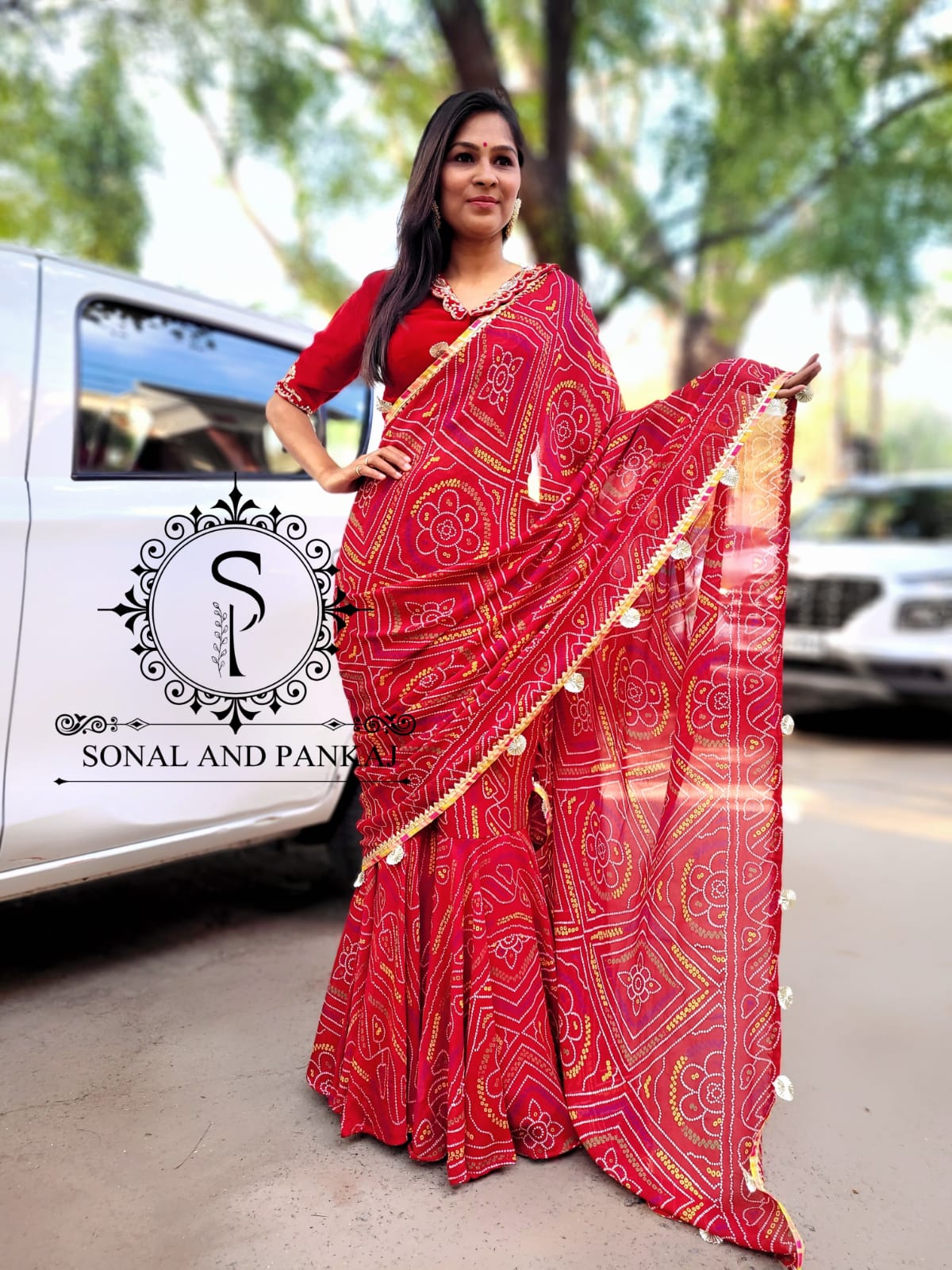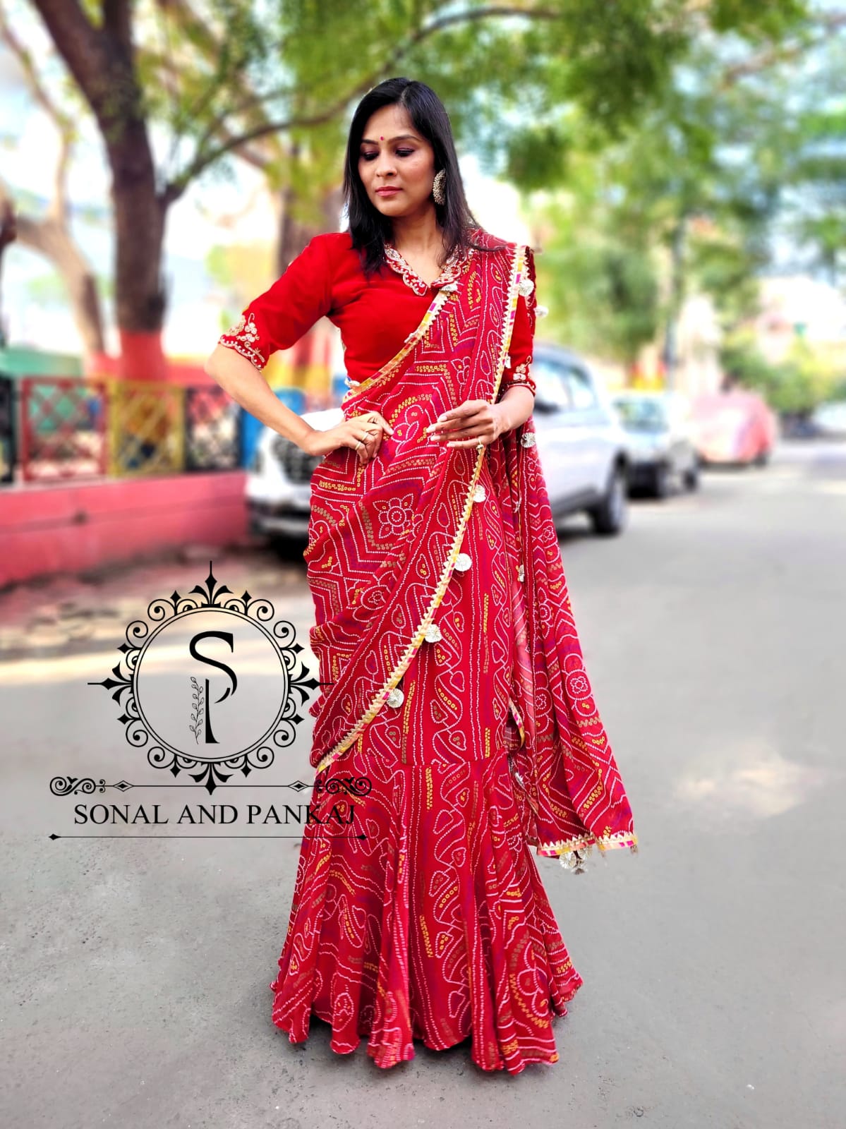 Ready To Wear Red Bandhani Print Saree With Hand Embroidered Blouse - SA00806