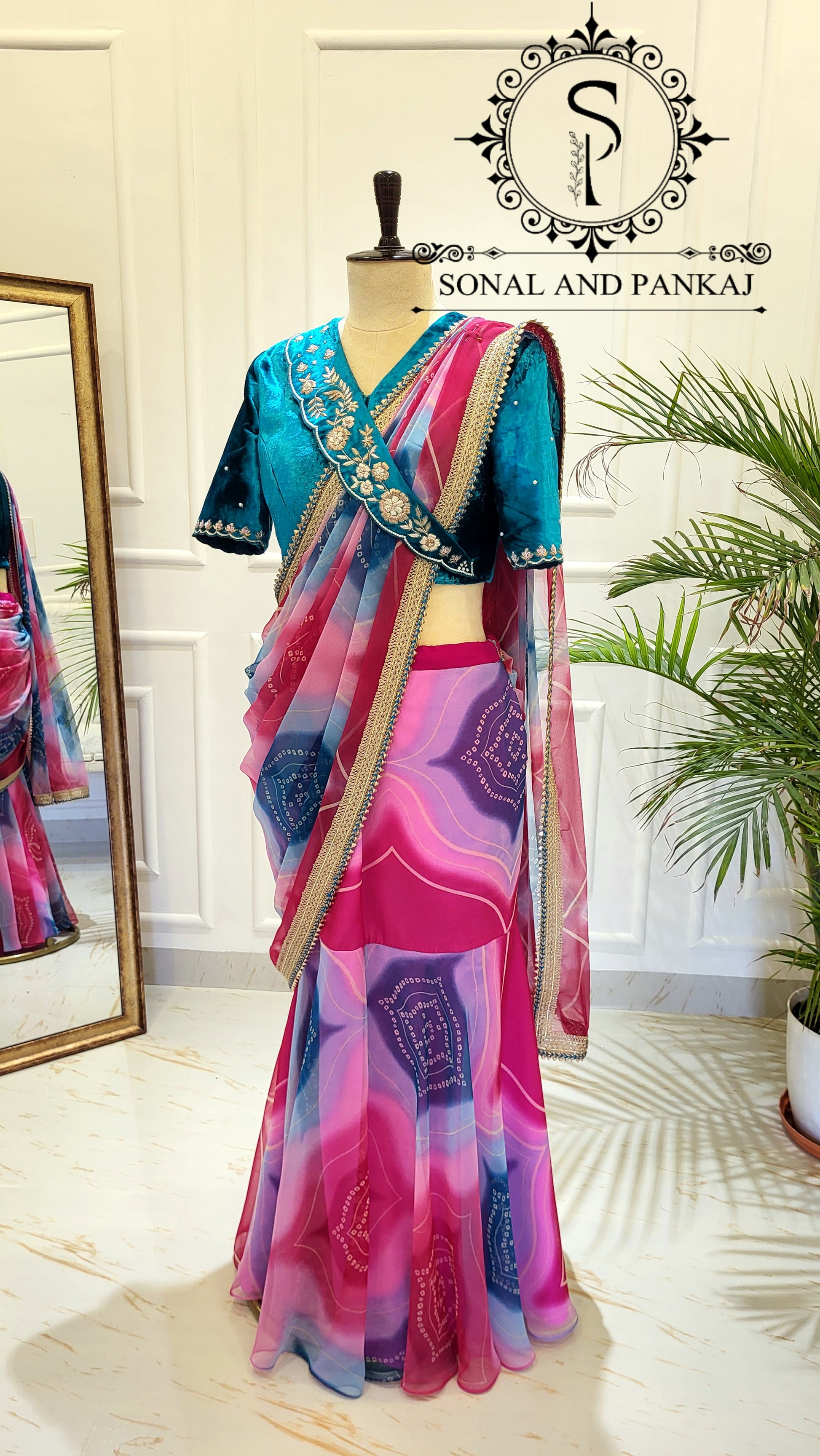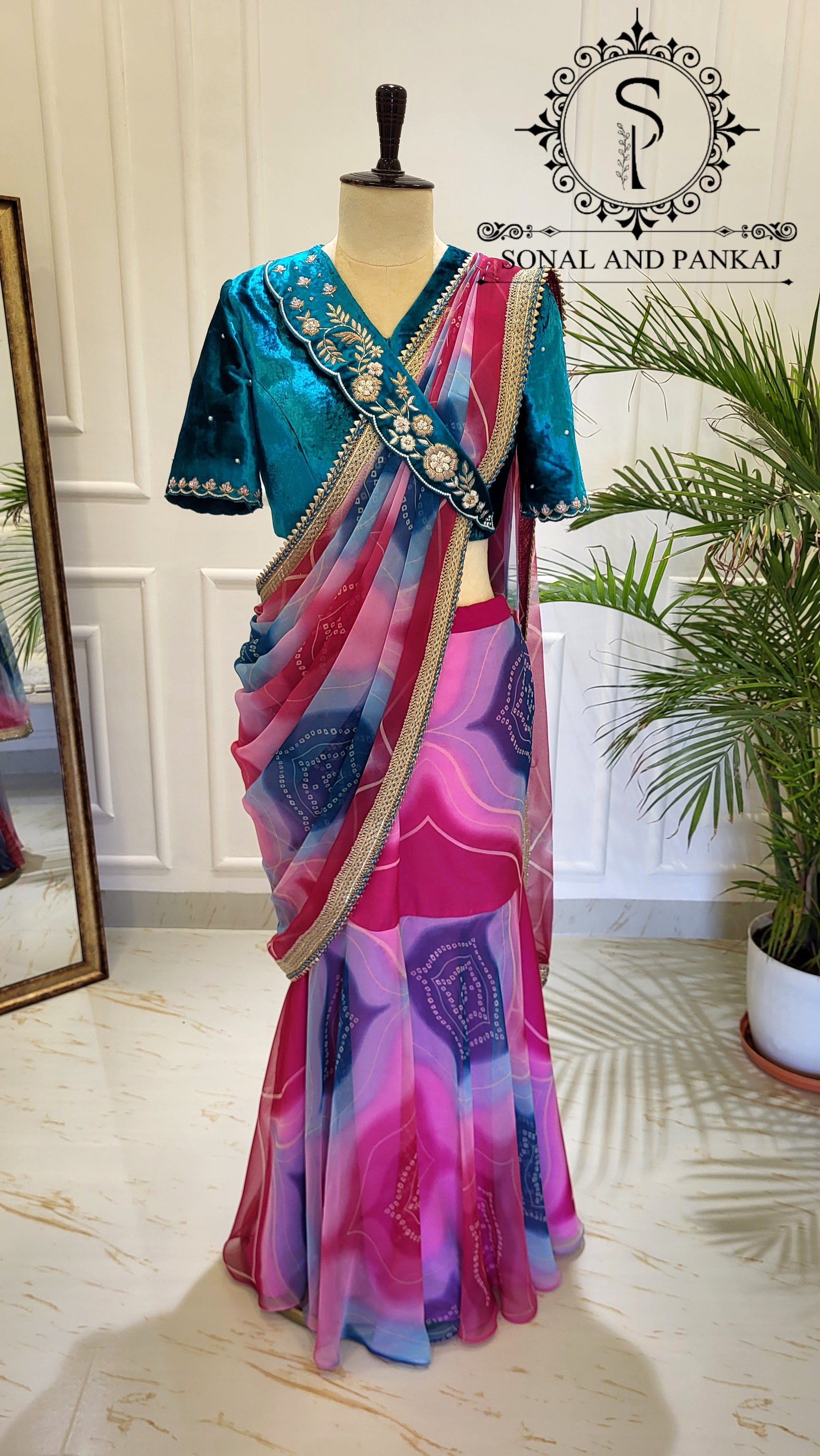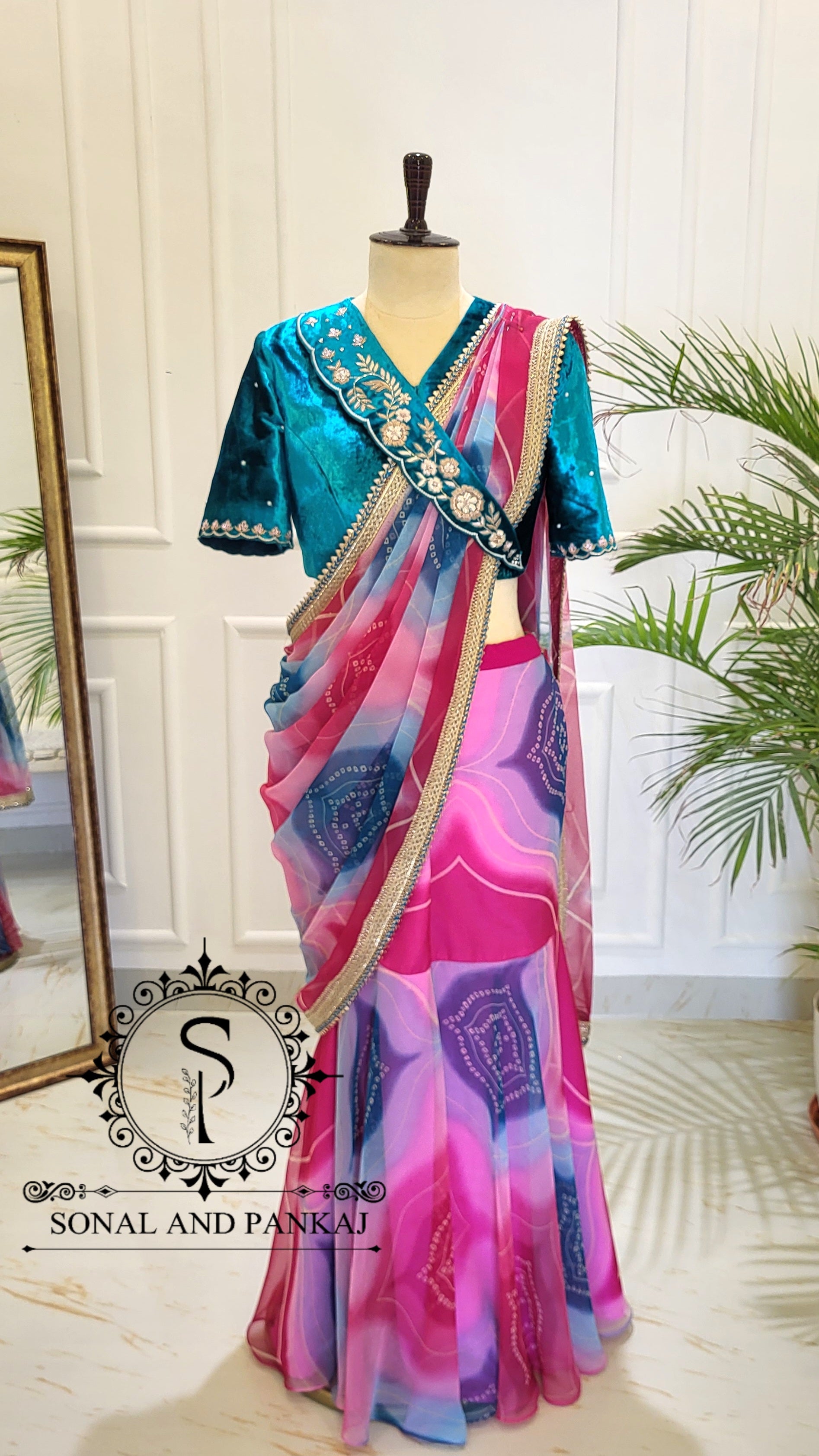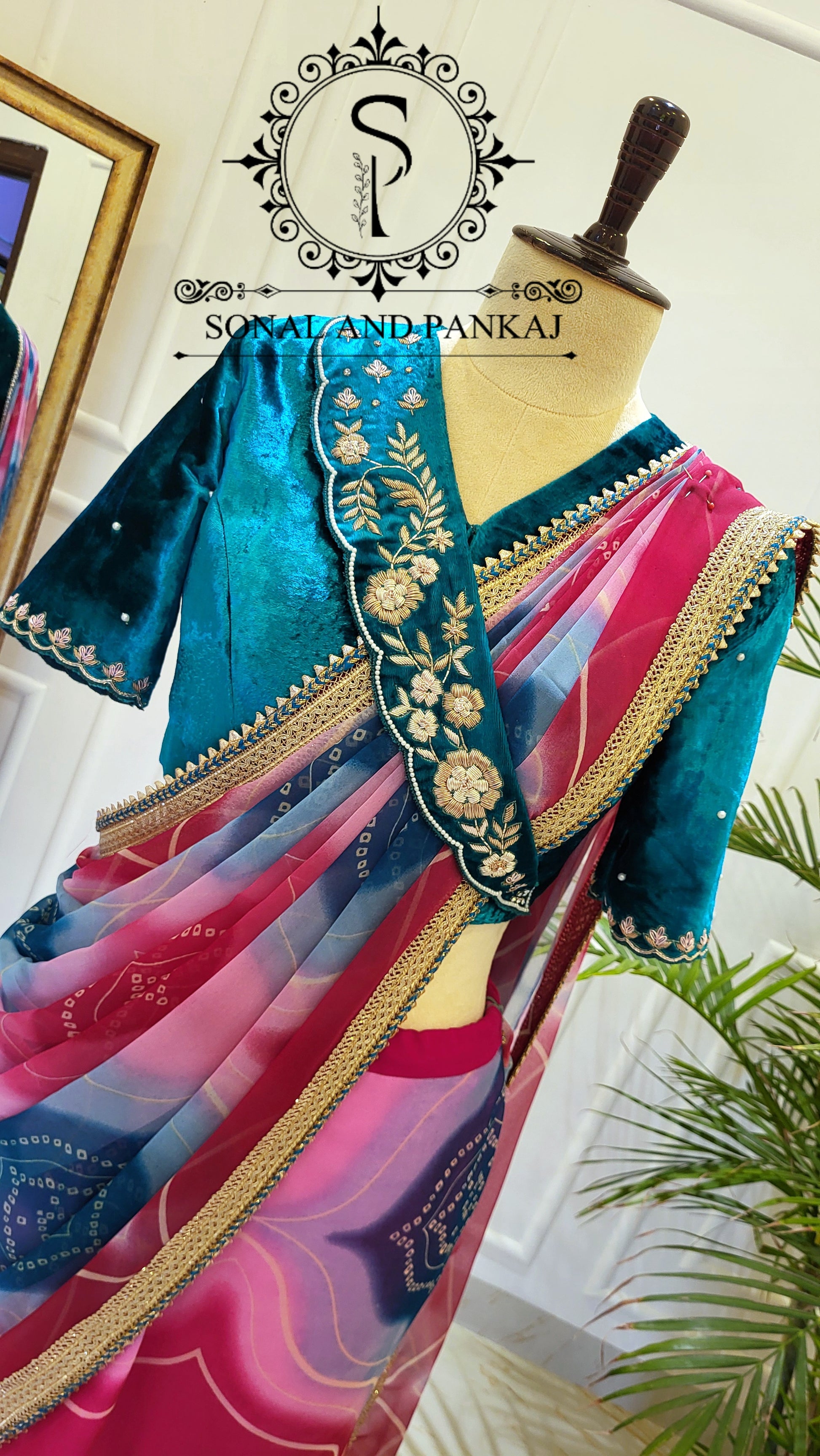 Description: Ready to wear bandhani print saree with zardozi hand embroidered velvet blouse.