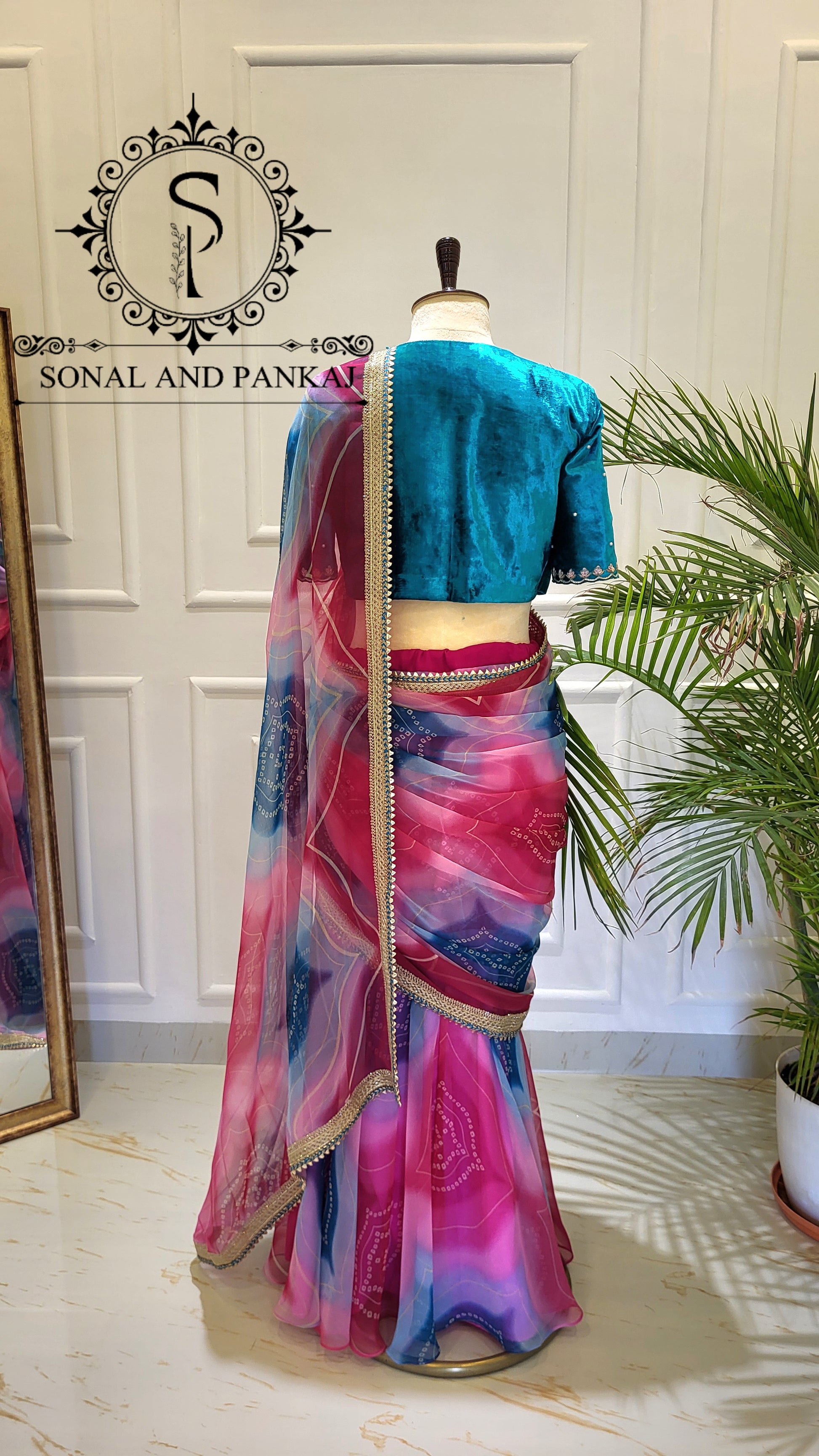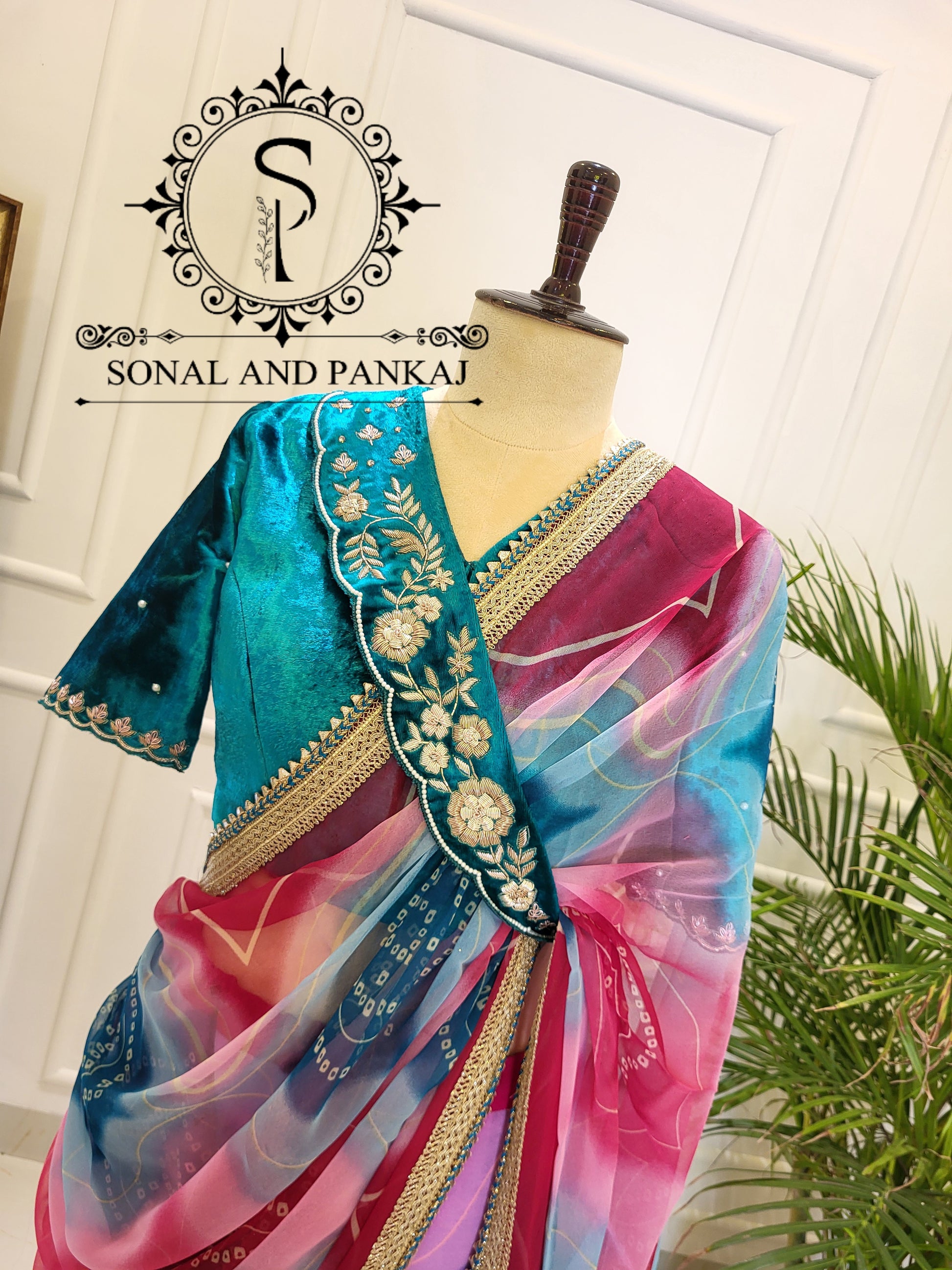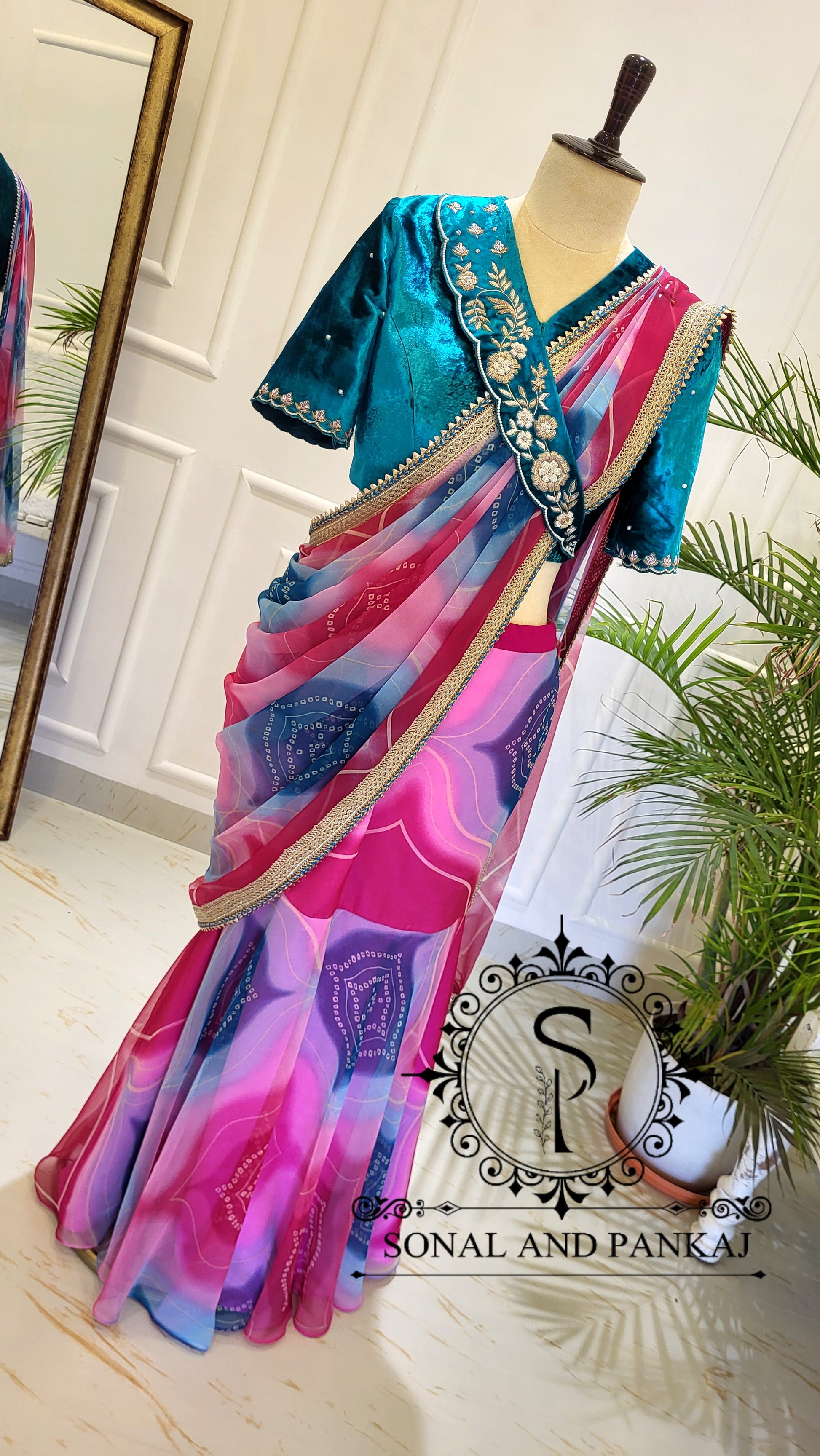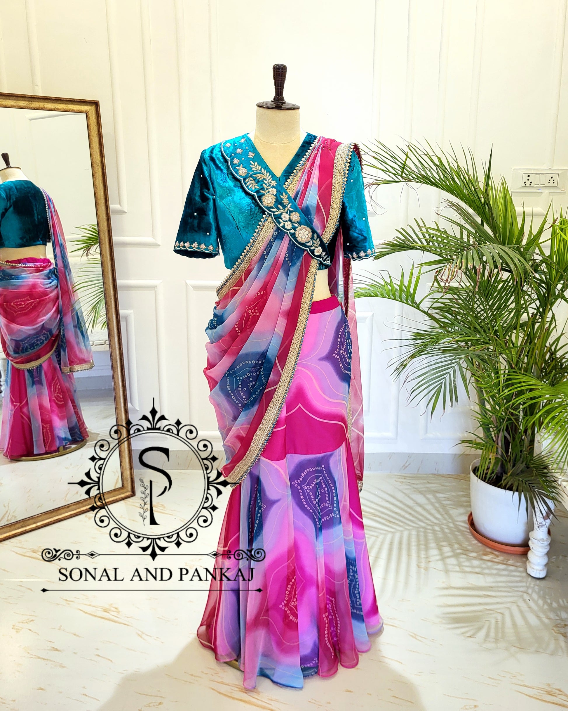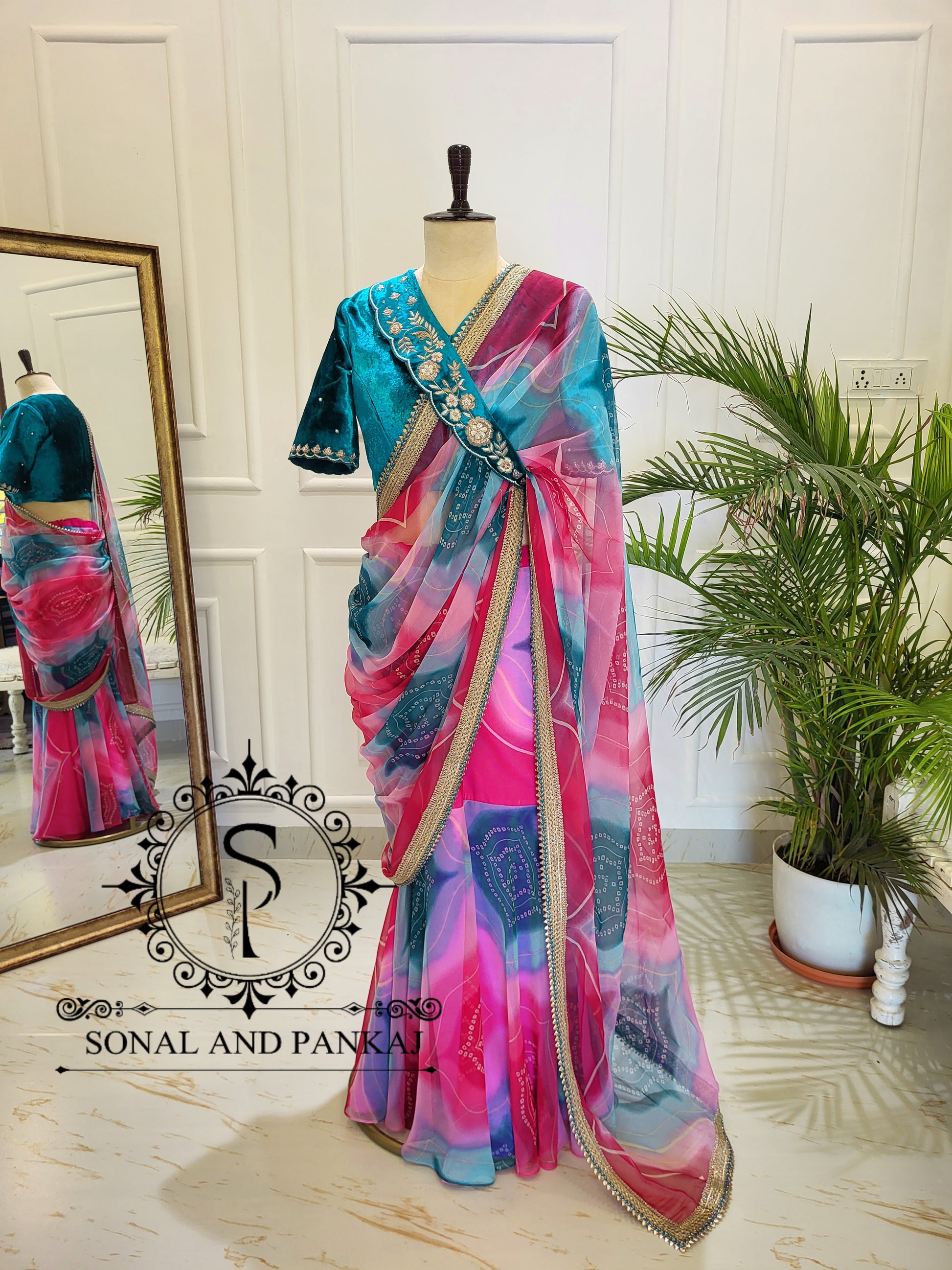 Description: Ready to wear bandhani print saree with zardozi hand embroidered velvet blouse.