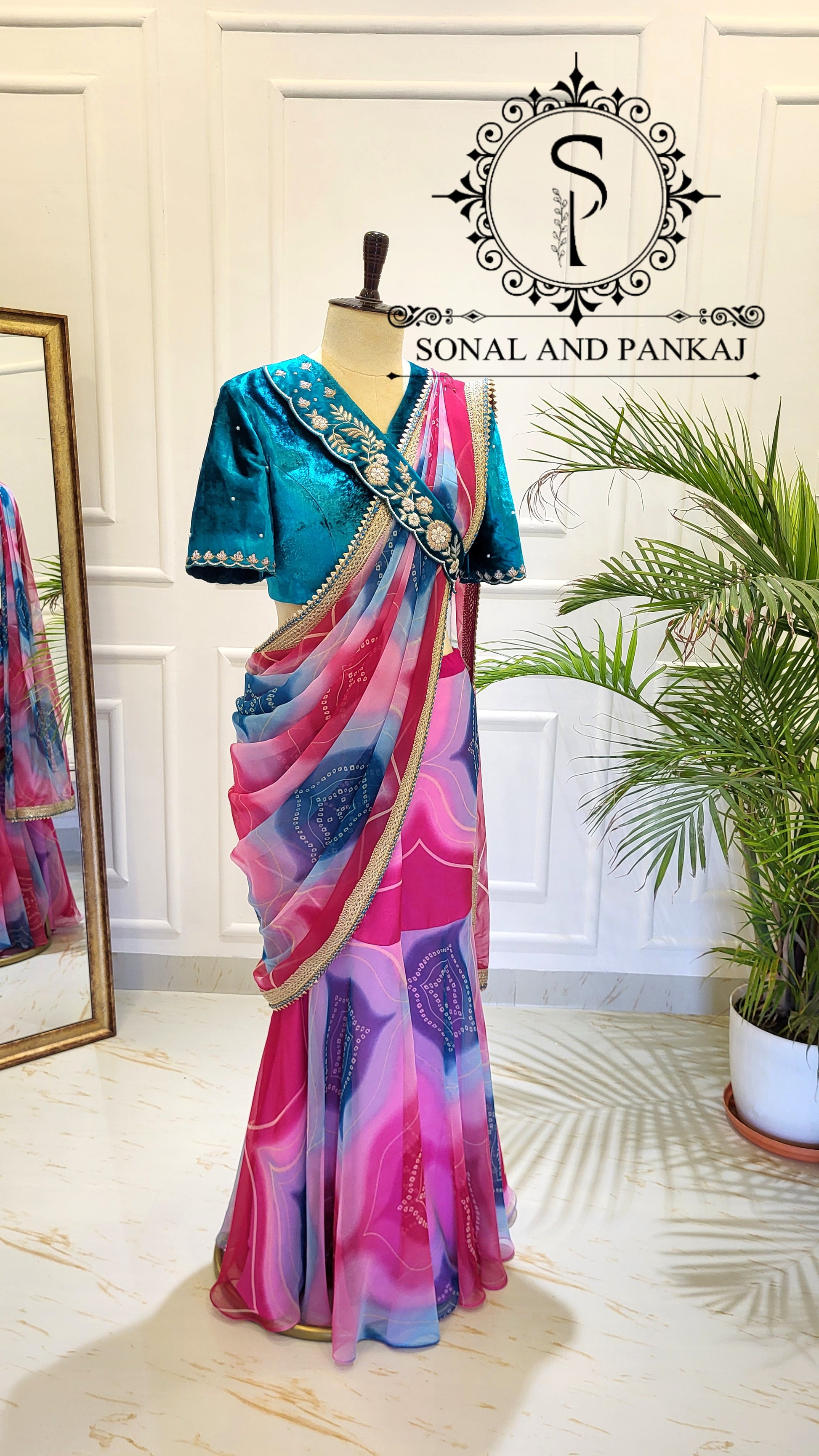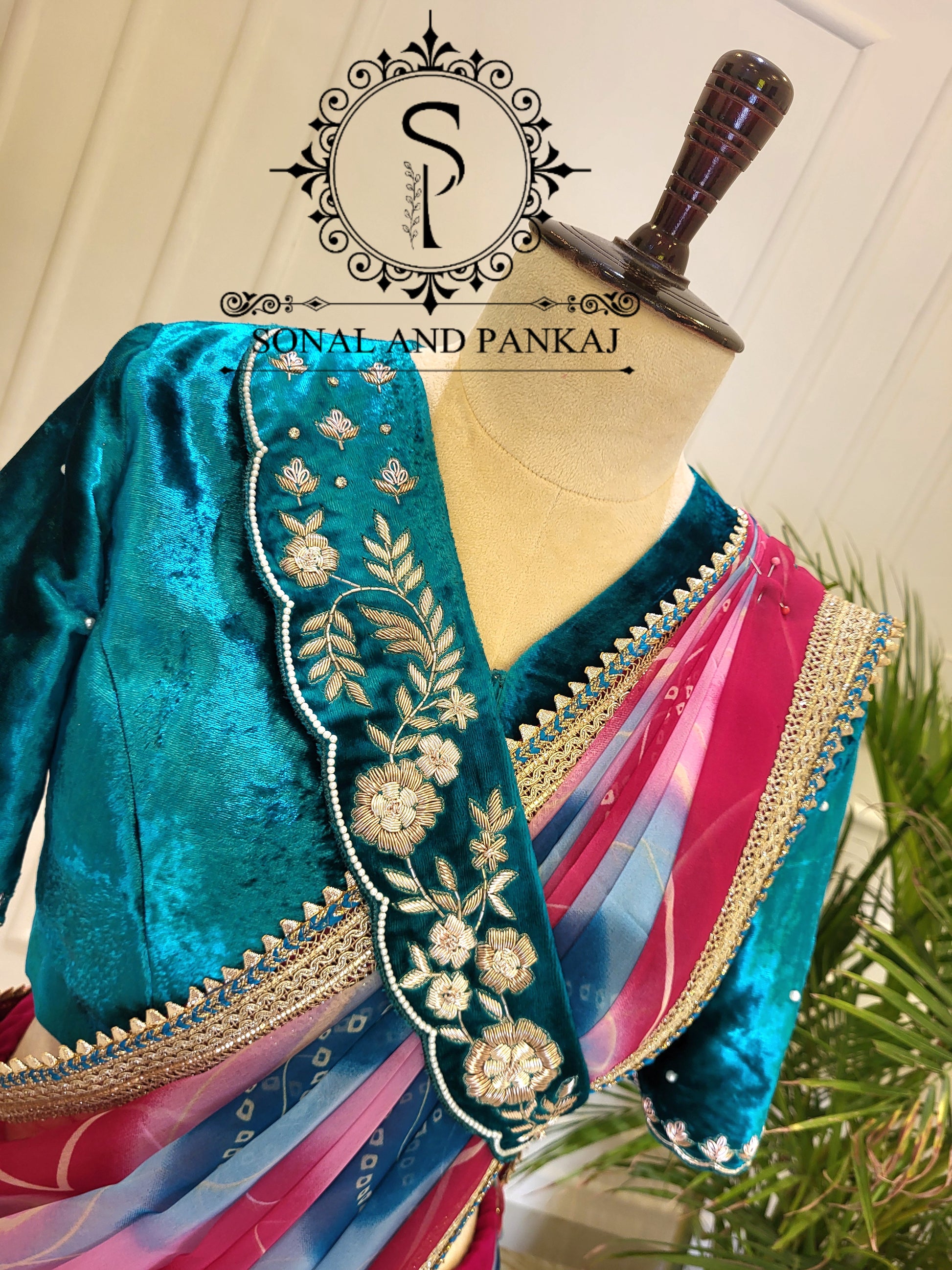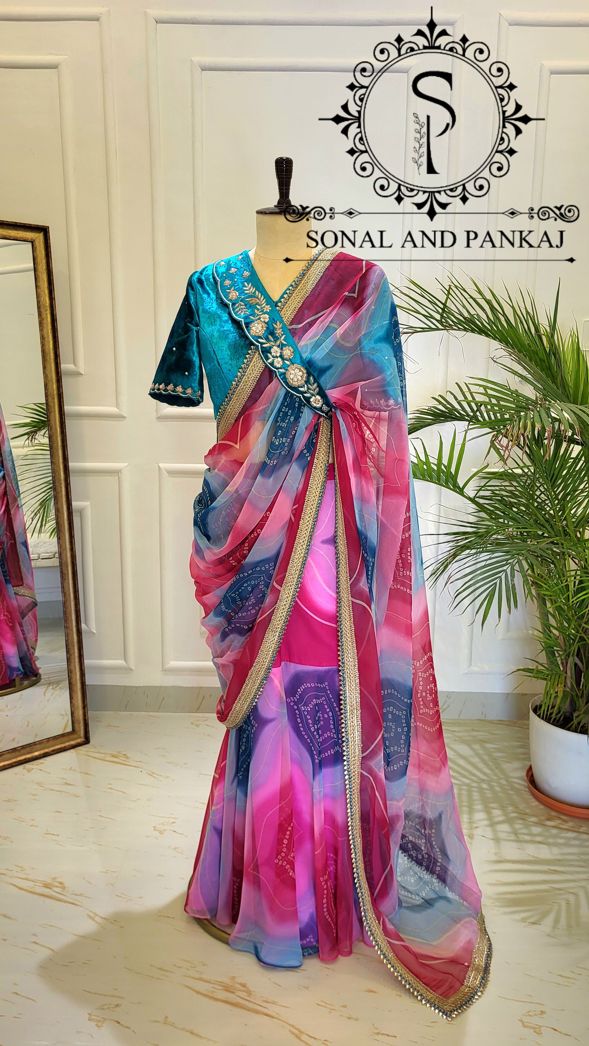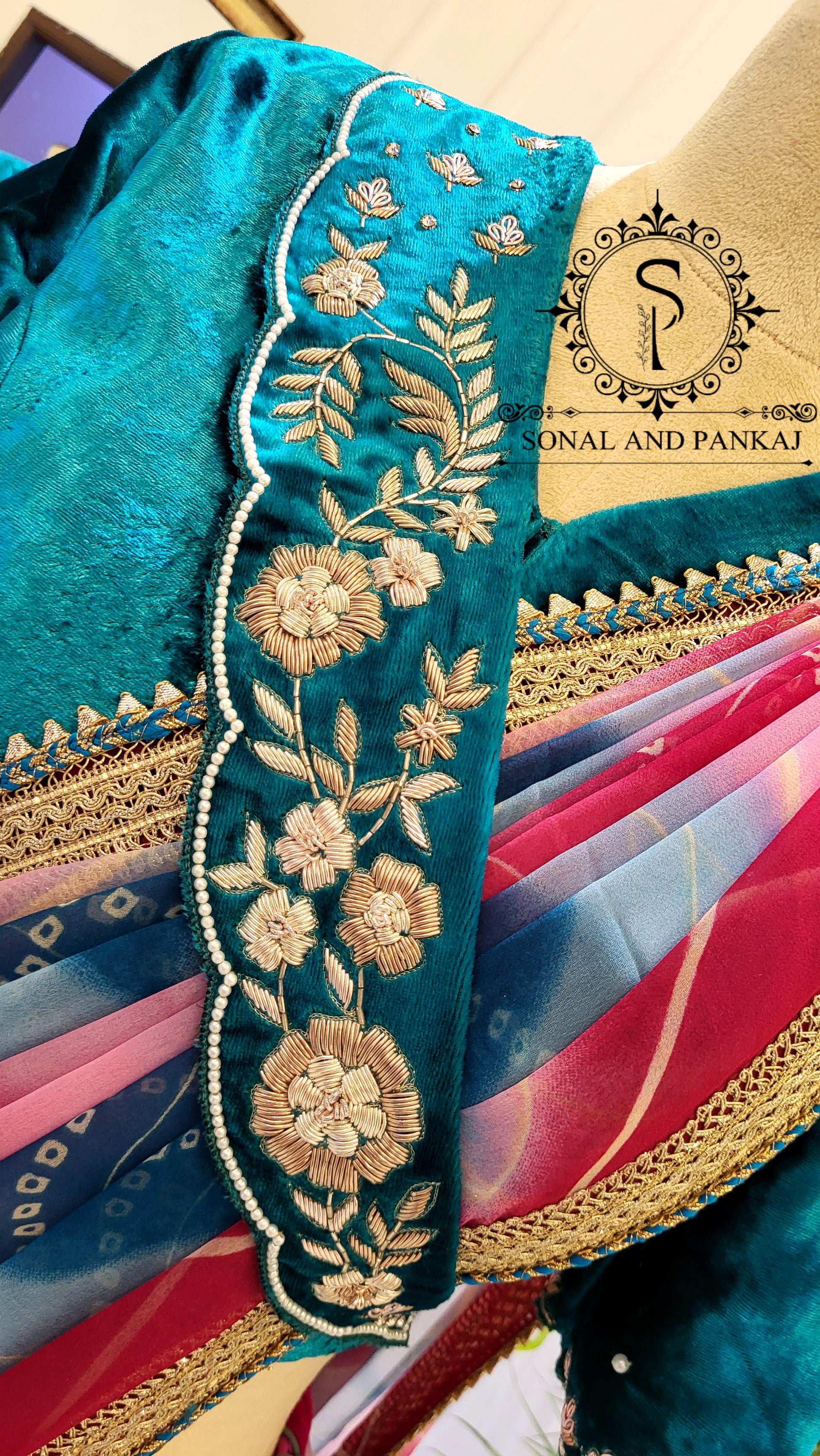 Description: Ready to wear bandhani print saree with zardozi hand embroidered velvet blouse.
