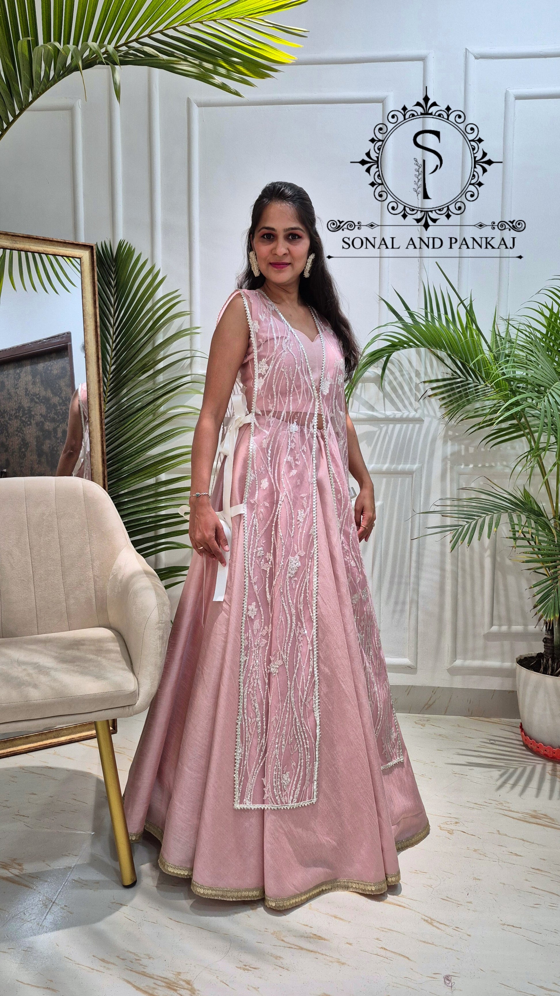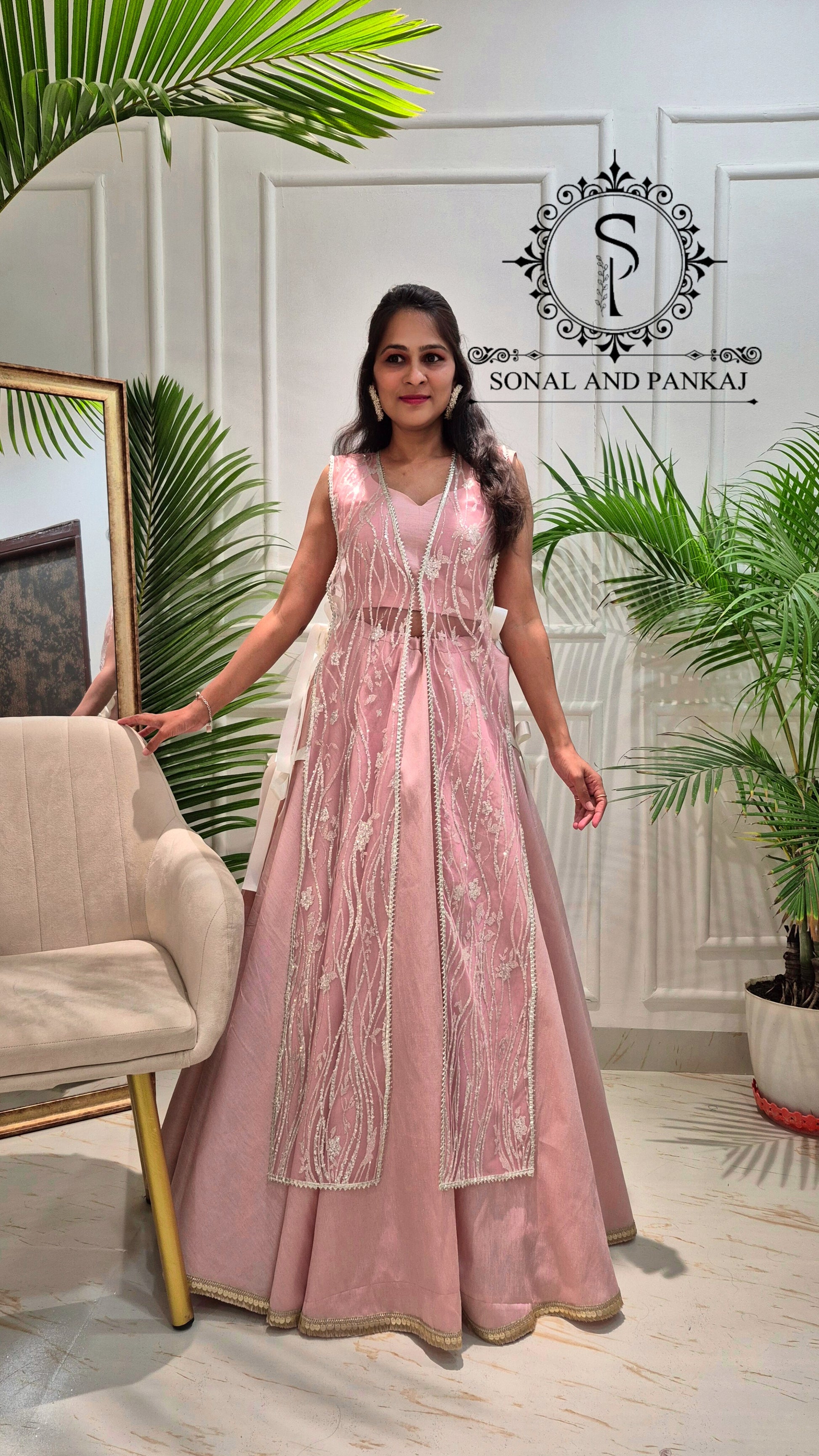 Beautiful rose quartz lehenga & blouse paired with tule jacket shimmering like shining stars in the night sky.
